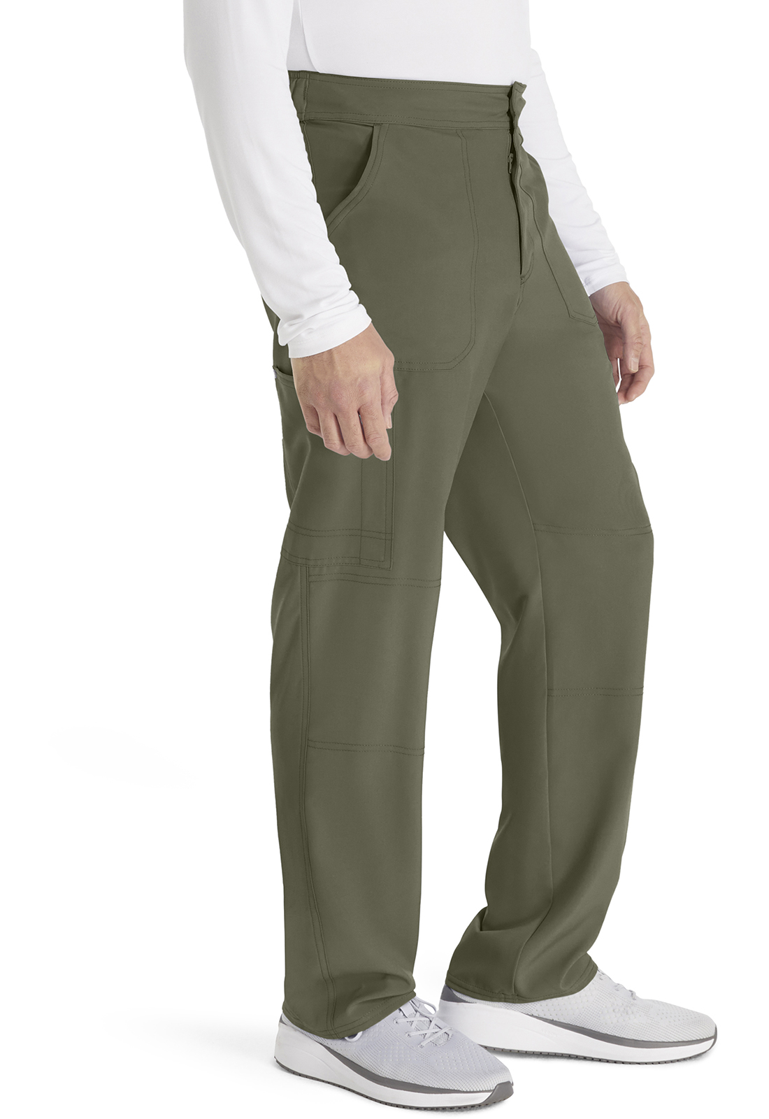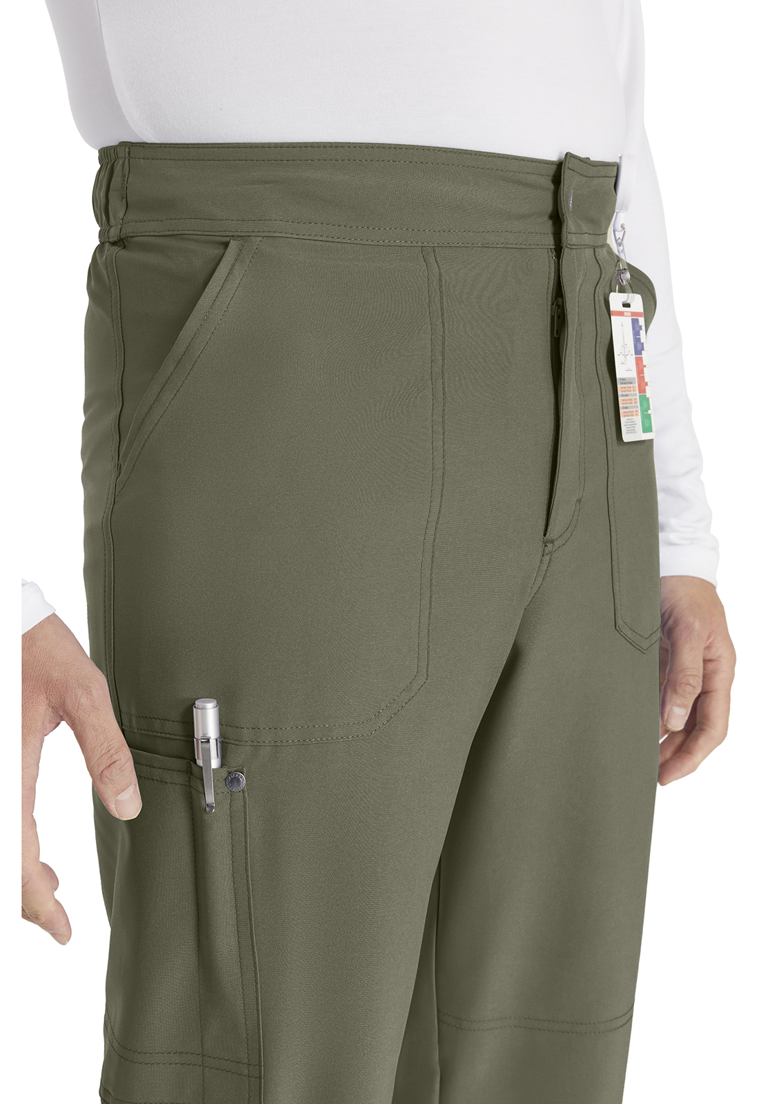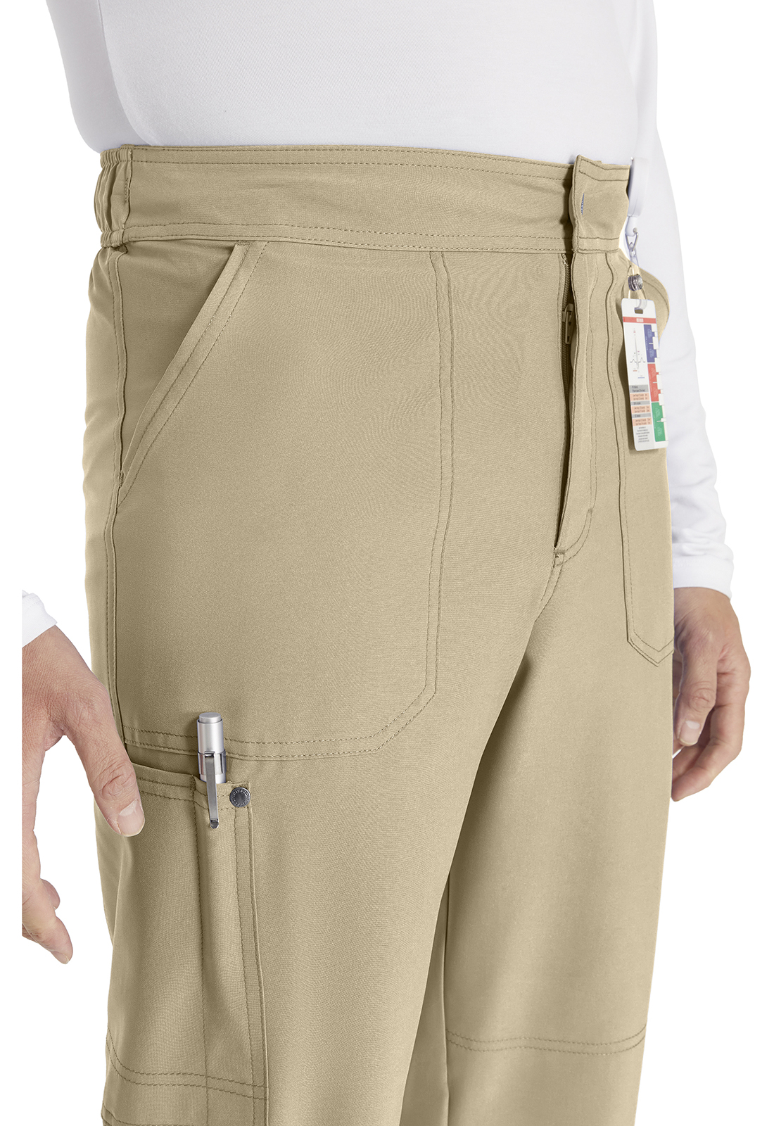 Брюки мужского кроя со средней посадкой имеют пояс, усиленный резинкой, с внутренним шнурком с логотипом для регулировки и надёжной фиксации. Пояс на резинке с гульфиком на молнии и застёжкой на кнопку с логотипом. В наличии четыре кармана для удобного хранения: два передних косых кармана и два накладных кармана с декоративной строчкой (правый — с петлёй для ручки или инструмента). На углах накладных карманов — декоративные кнопки с логотипом. Декоративная строчка на коленях и всех швах для добавления стиля. На талии сзади — петля с логотипом для быстрого подвешивания. Прямые штанины с шириной 43 см. Длина по внутреннему шву: 81 см.