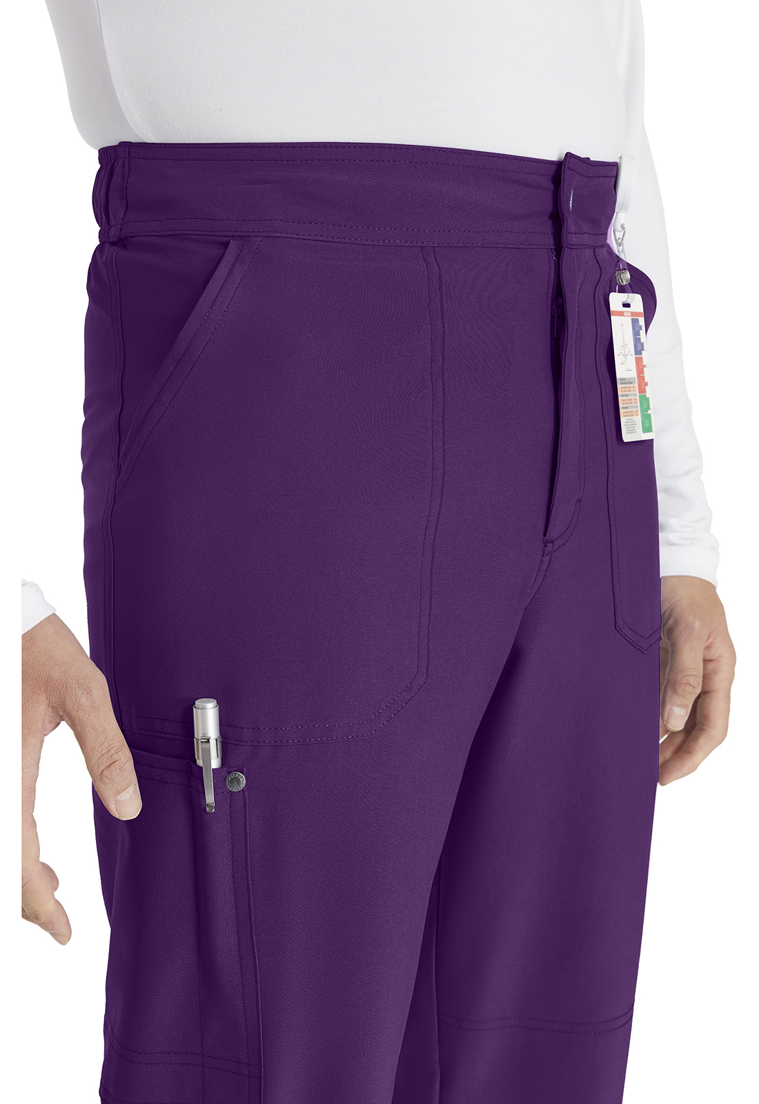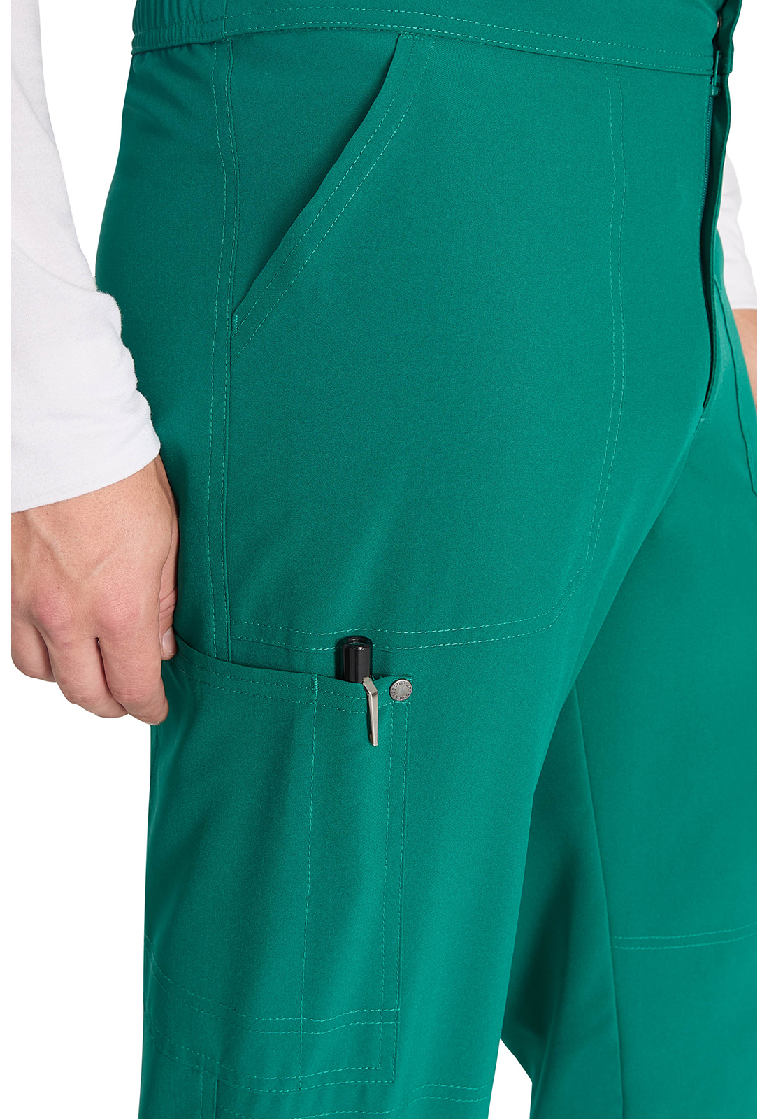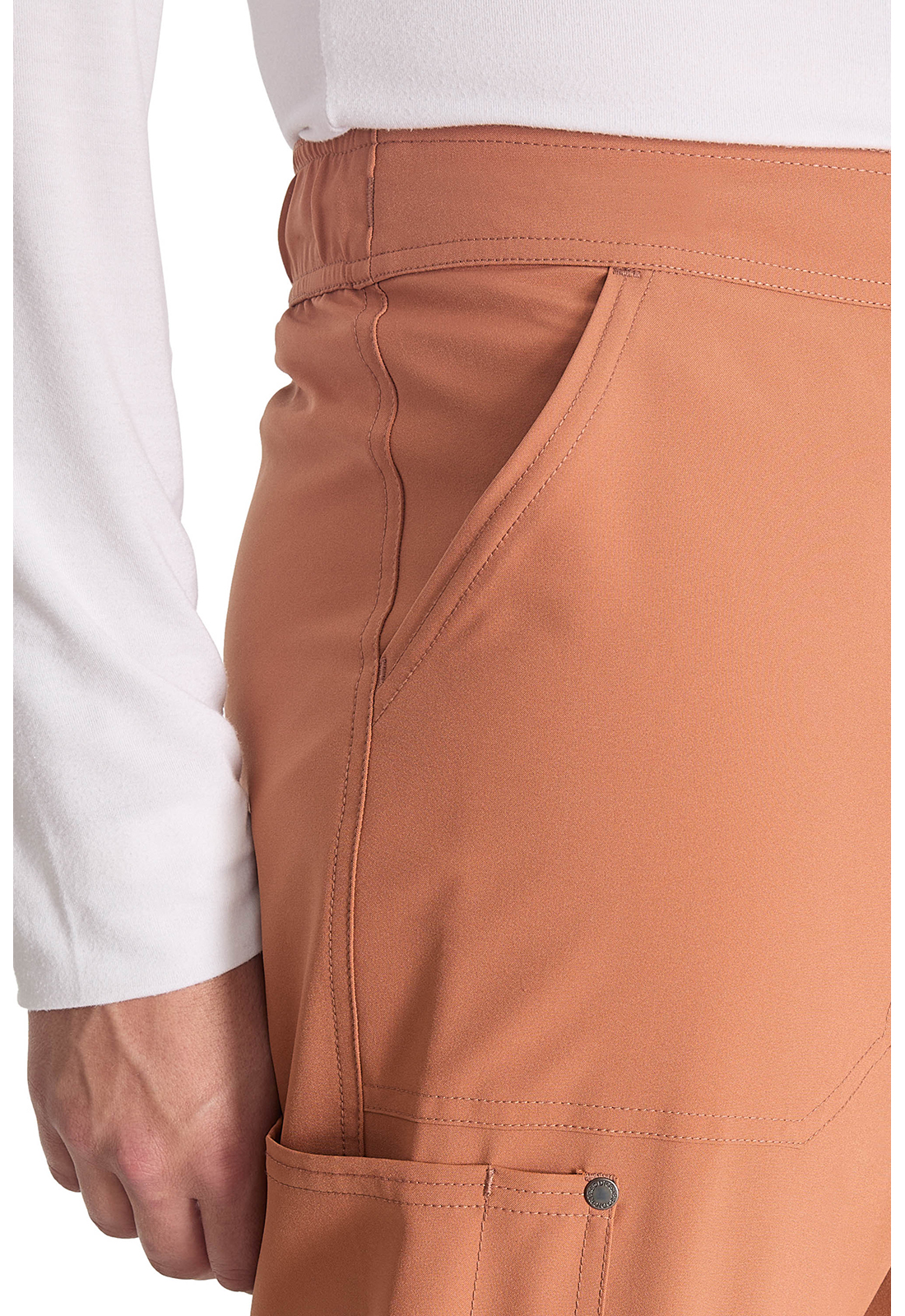 Брюки мужского кроя со средней посадкой имеют пояс, усиленный резинкой, с внутренним шнурком с логотипом для регулировки и надёжной фиксации. Пояс на резинке с гульфиком на молнии и застёжкой на кнопку с логотипом. В наличии четыре кармана для удобного хранения: два передних косых кармана и два накладных кармана с декоративной строчкой (правый — с петлёй для ручки или инструмента). На углах накладных карманов — декоративные кнопки с логотипом. Декоративная строчка на коленях и всех швах для добавления стиля. На талии сзади — петля с логотипом для быстрого подвешивания. Прямые штанины с шириной 43 см. Длина по внутреннему шву: 81 см.