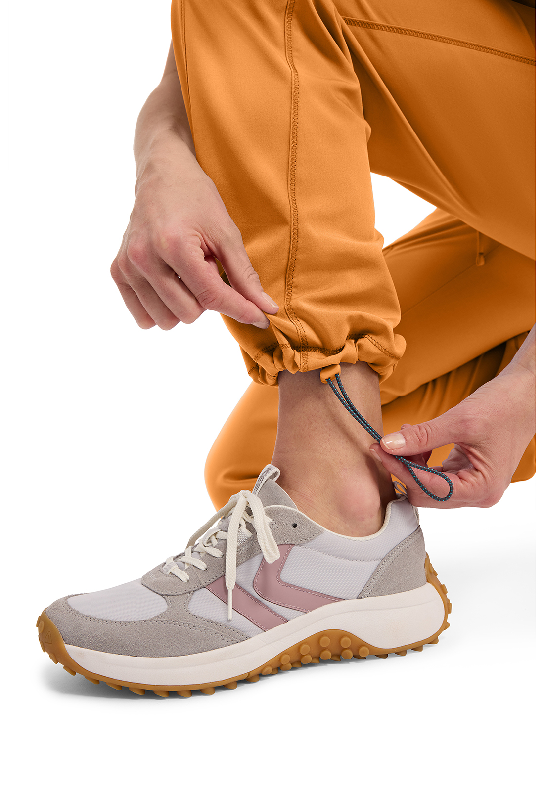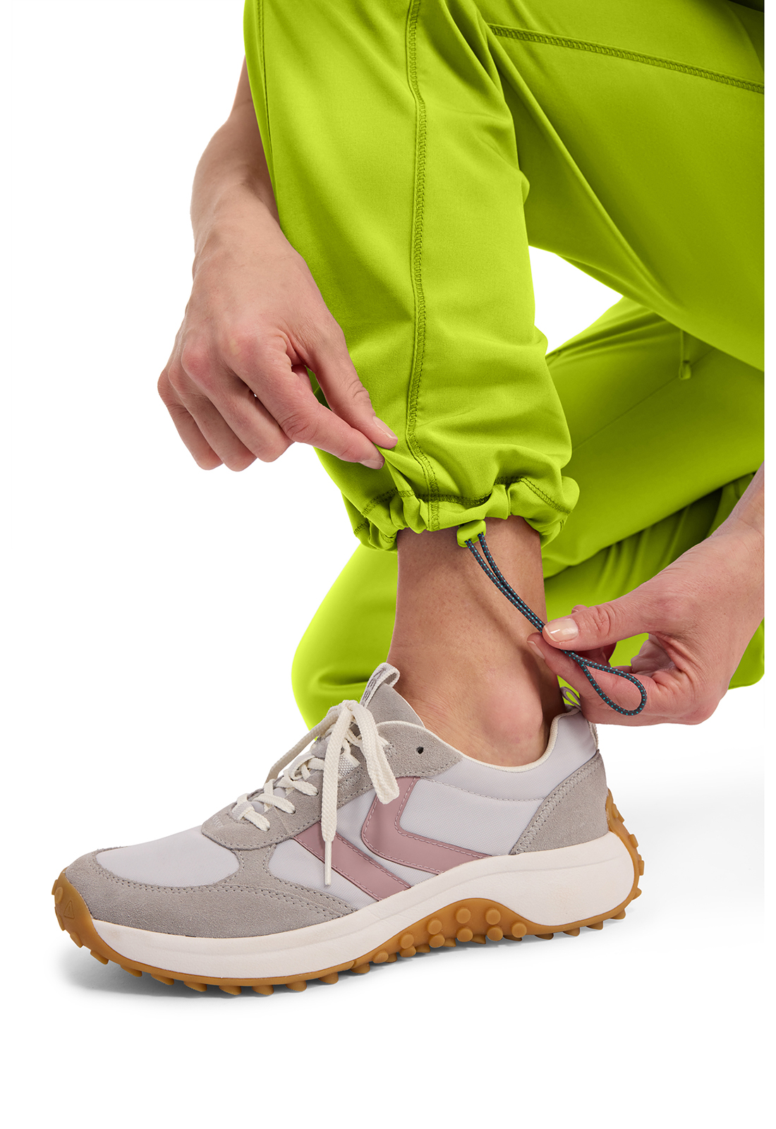 Легкие брюки современного покроя, с низкой посадкой, прямые с эластичной трикотажной резинкой и регулируемым шнурком. Также имеются трикотажные швы на рукавах спереди и сзади, , разрезы спереди на брючинах с закрытой застежкой-молнией, карманы: врезные, грузовой, сзади один накладной, петли для инструментов ниже левого кармана, эластичный шнур с пуговицей на брючине для регулировки длины. Длина: 77,5 см.