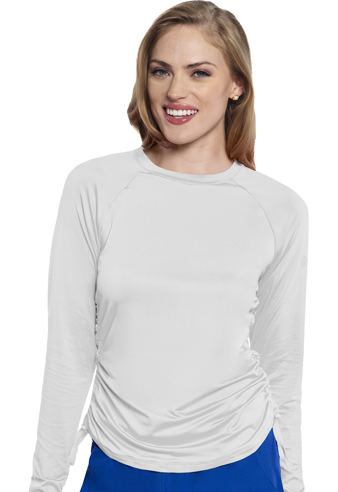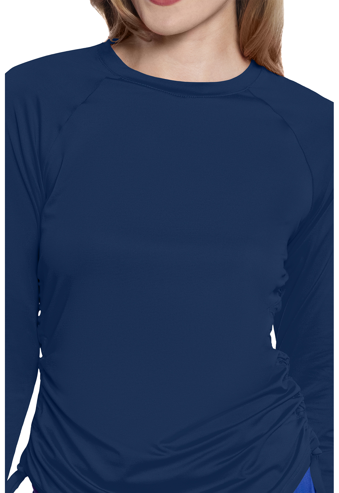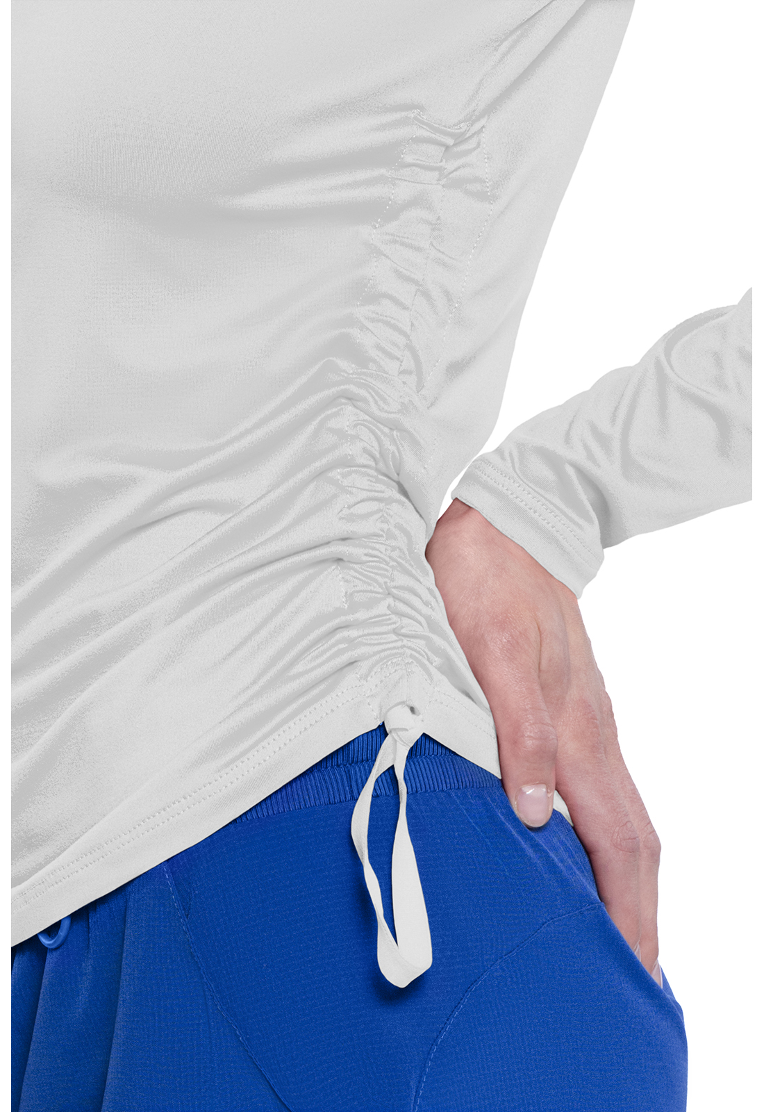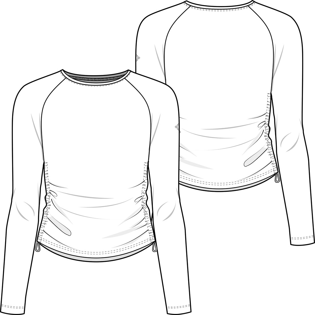 Модель с длинными рукавами, подходящая для женщин, включает в себя круглый вырез, эластичную сборку по боковым швам и закругленный подол. Регулируемые ленты по боковым швам позволяют укорачивать или удлинять топ. Длина по центру спинки: 61 см.