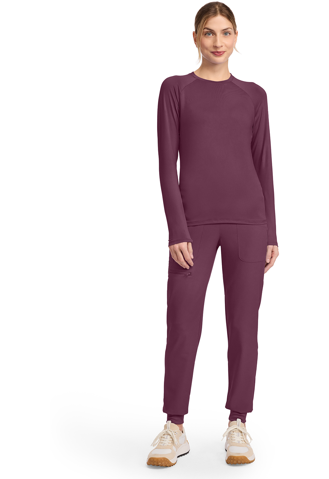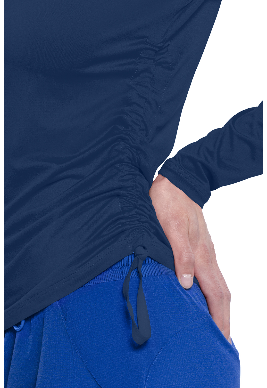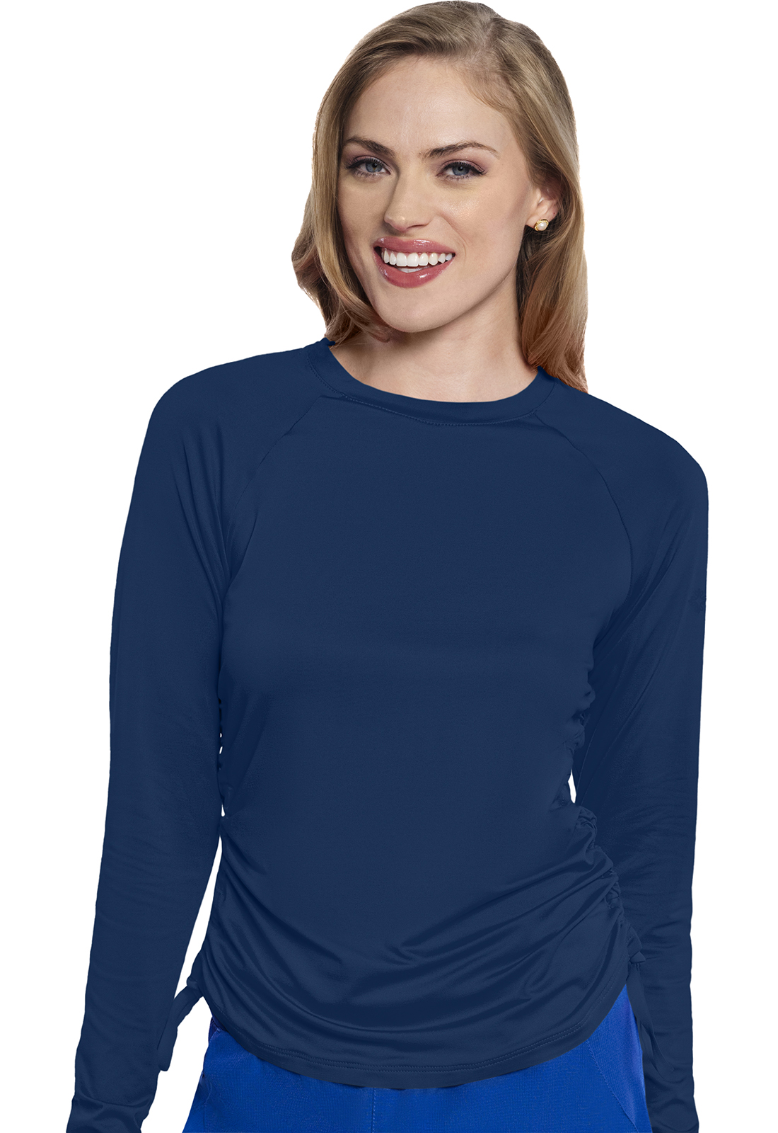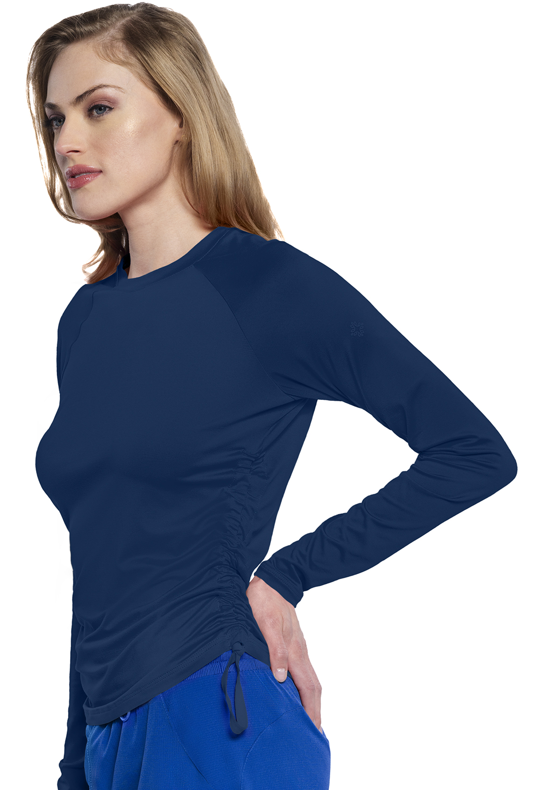 Модель с длинными рукавами, подходящая для женщин, включает в себя круглый вырез, эластичную сборку по боковым швам и закругленный подол. Регулируемые ленты по боковым швам позволяют укорачивать или удлинять топ. Длина по центру спинки: 61 см.