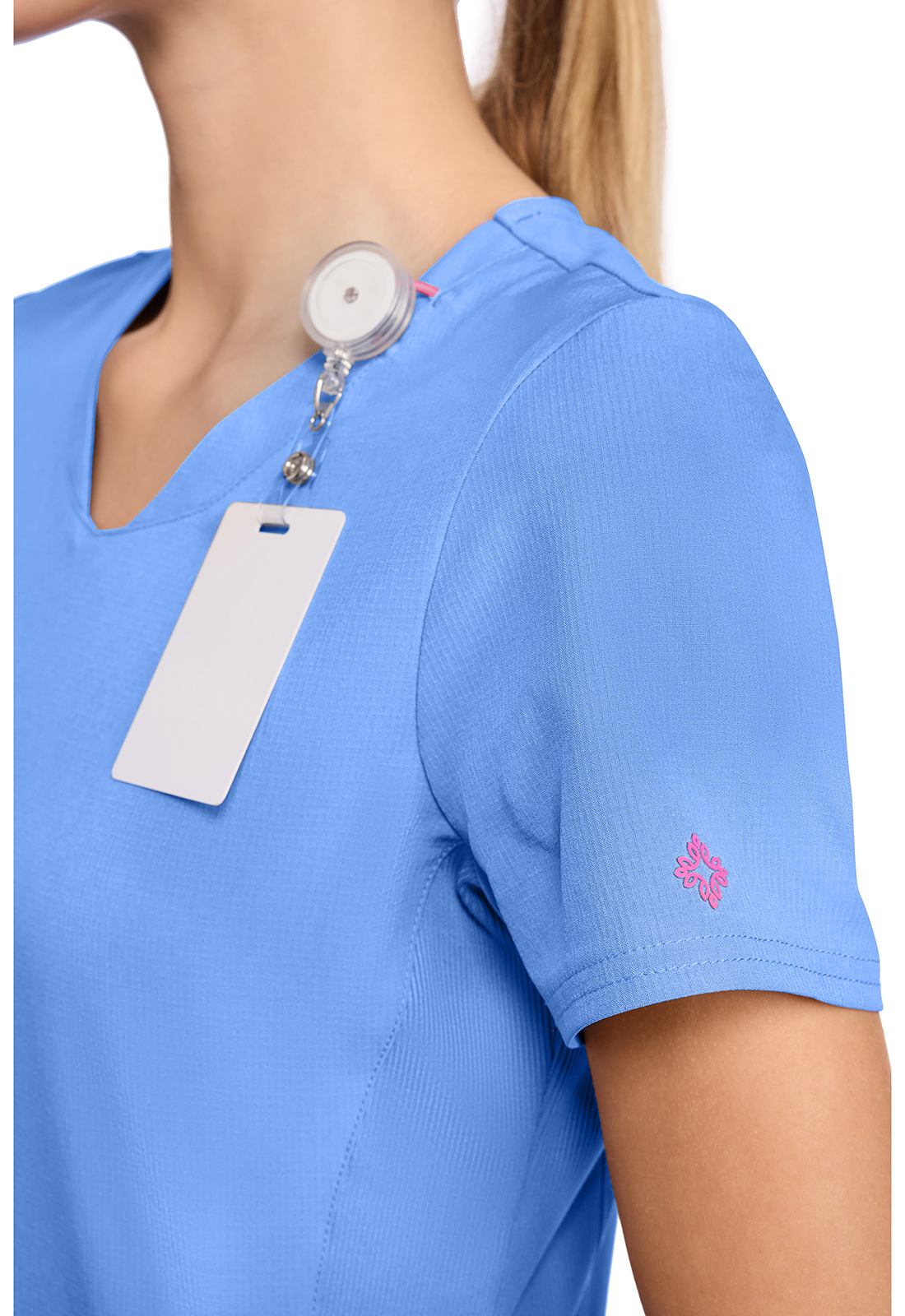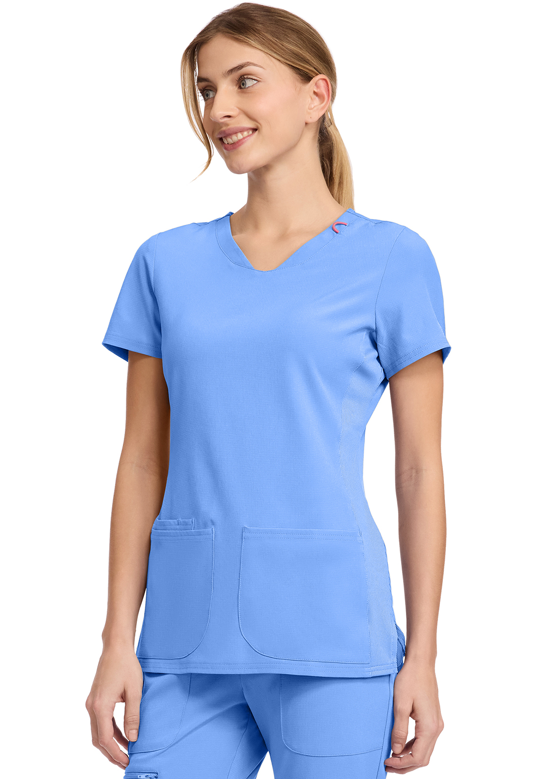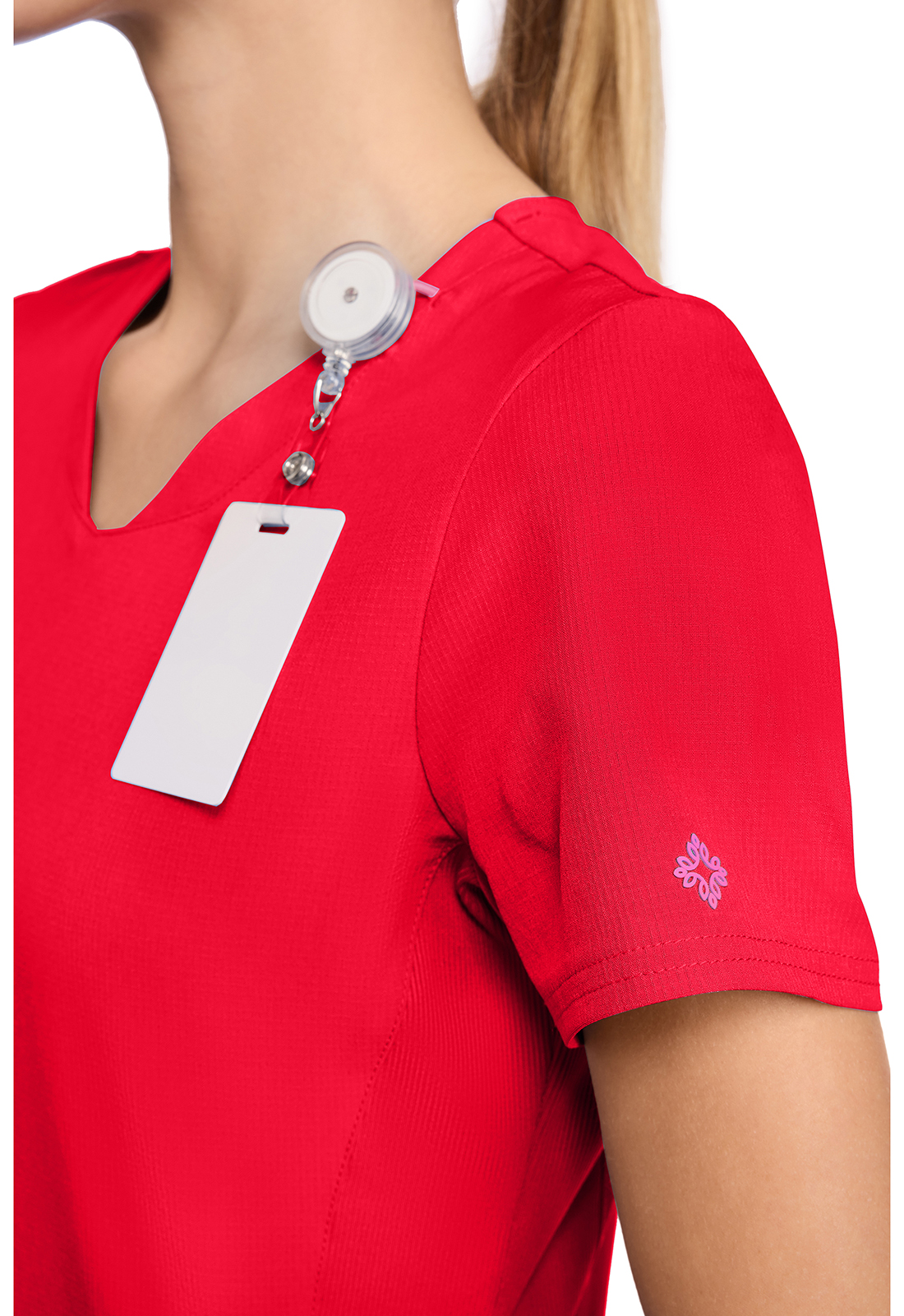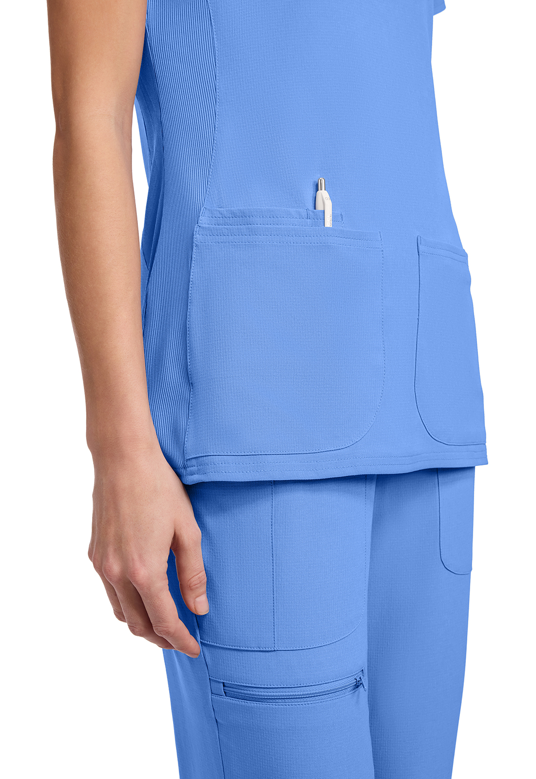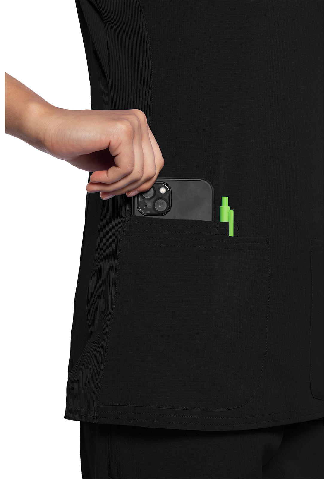 Женский топ с v-образным вырезом имеет фигурный вырез и петлю для бейджа на левой стороне носителя. Имеется три кармана для хранения: два накладных кармана и дополнительный карман для мобильного телефона с усиленным слотом для ручки. Внутри правого кармана носителя есть петли для инструментов из саржевой ленты для дополнительного хранения. Принцесские швы спереди и сзади придают форму и облегание, а боковые панели из трикотажа в тон обеспечивают комфорт и эластичность. Закругленный подол и боковые разрезы завершают образ. Длина по центру спинки: 65 см.