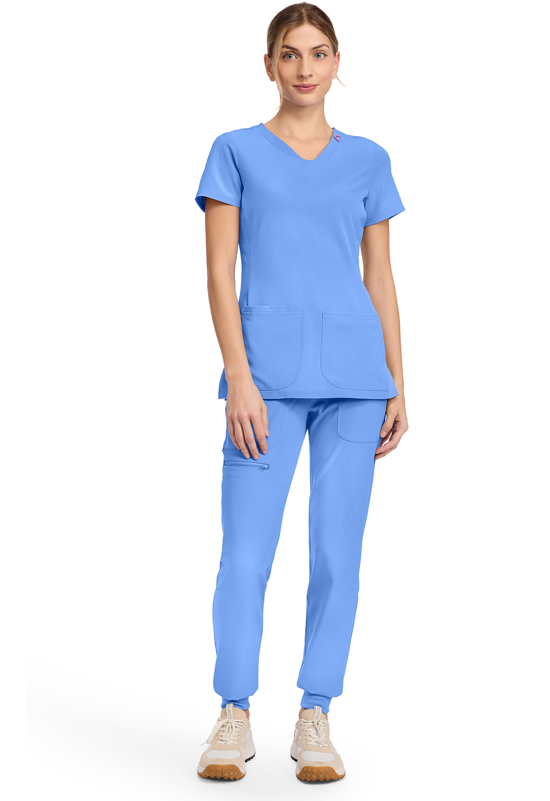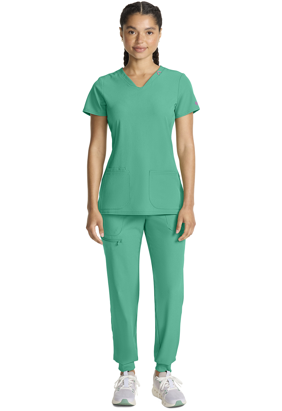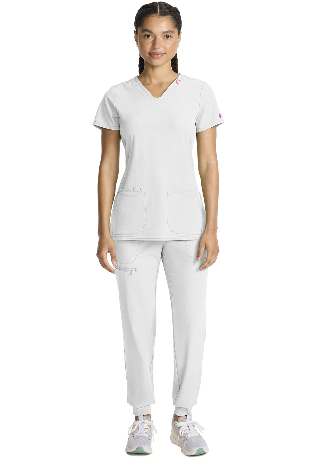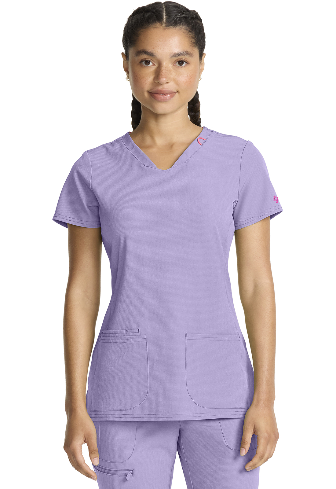 Женский топ с v-образным вырезом имеет фигурный вырез и петлю для бейджа на левой стороне носителя. Имеется три кармана для хранения: два накладных кармана и дополнительный карман для мобильного телефона с усиленным слотом для ручки. Внутри правого кармана носителя есть петли для инструментов из саржевой ленты для дополнительного хранения. Принцесские швы спереди и сзади придают форму и облегание, а боковые панели из трикотажа в тон обеспечивают комфорт и эластичность. Закругленный подол и боковые разрезы завершают образ. Длина по центру спинки: 65 см.
