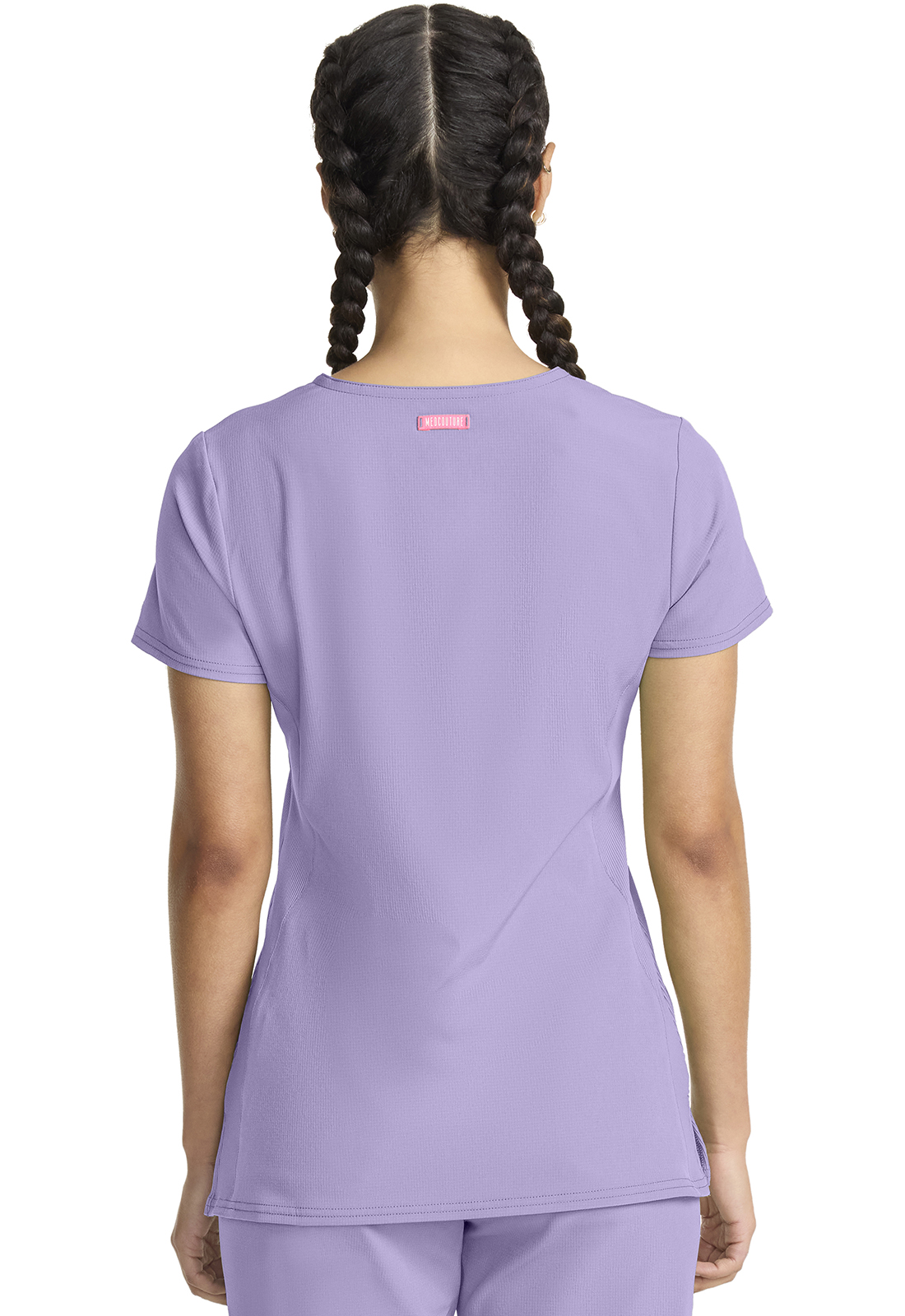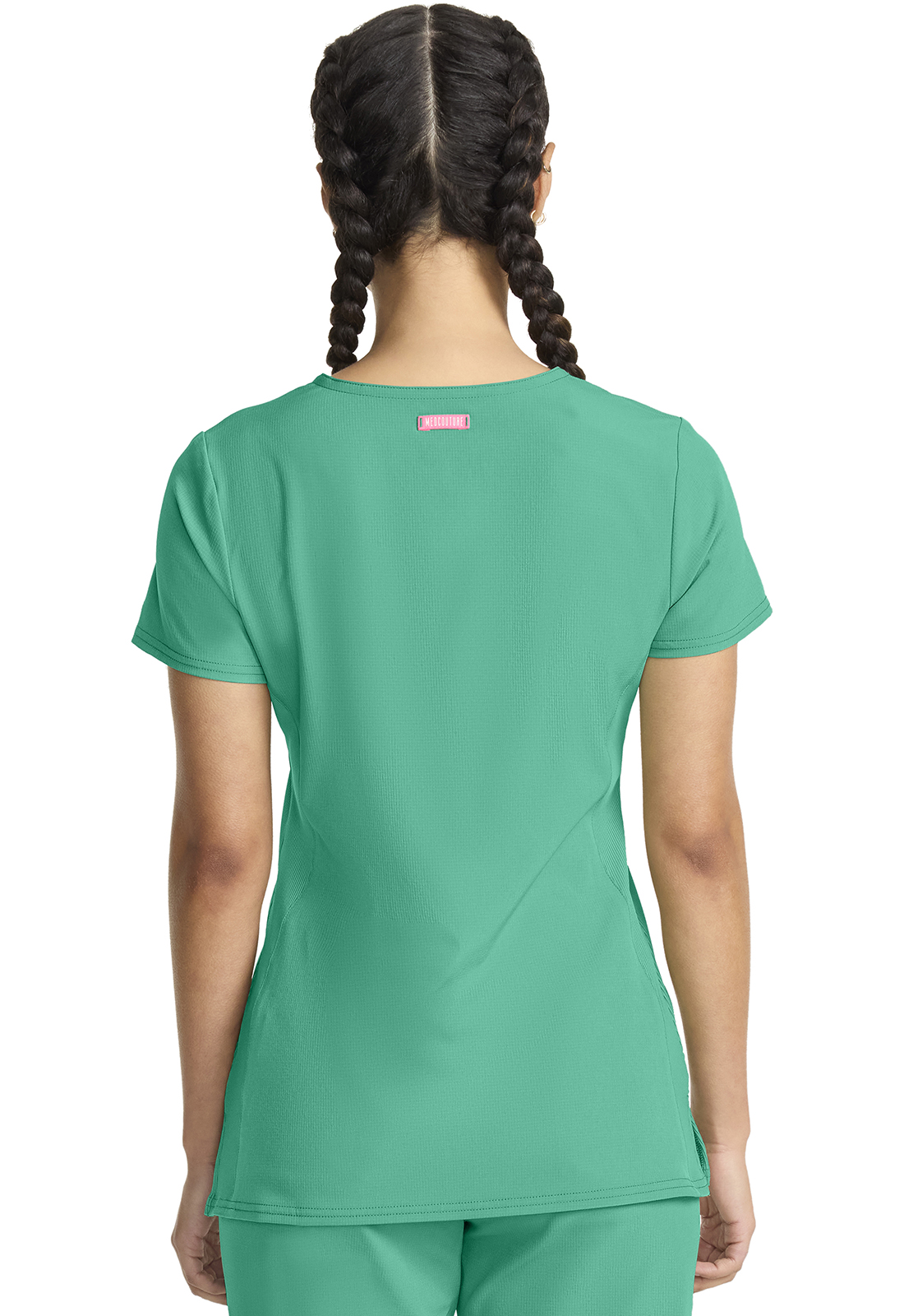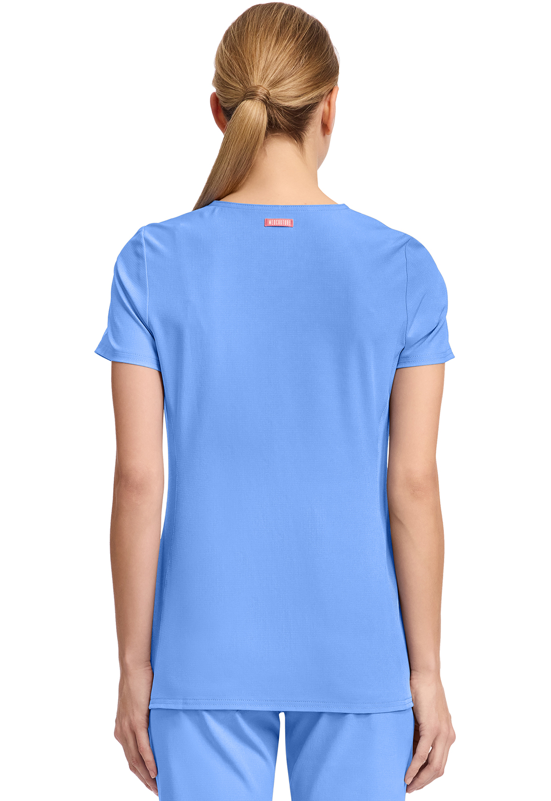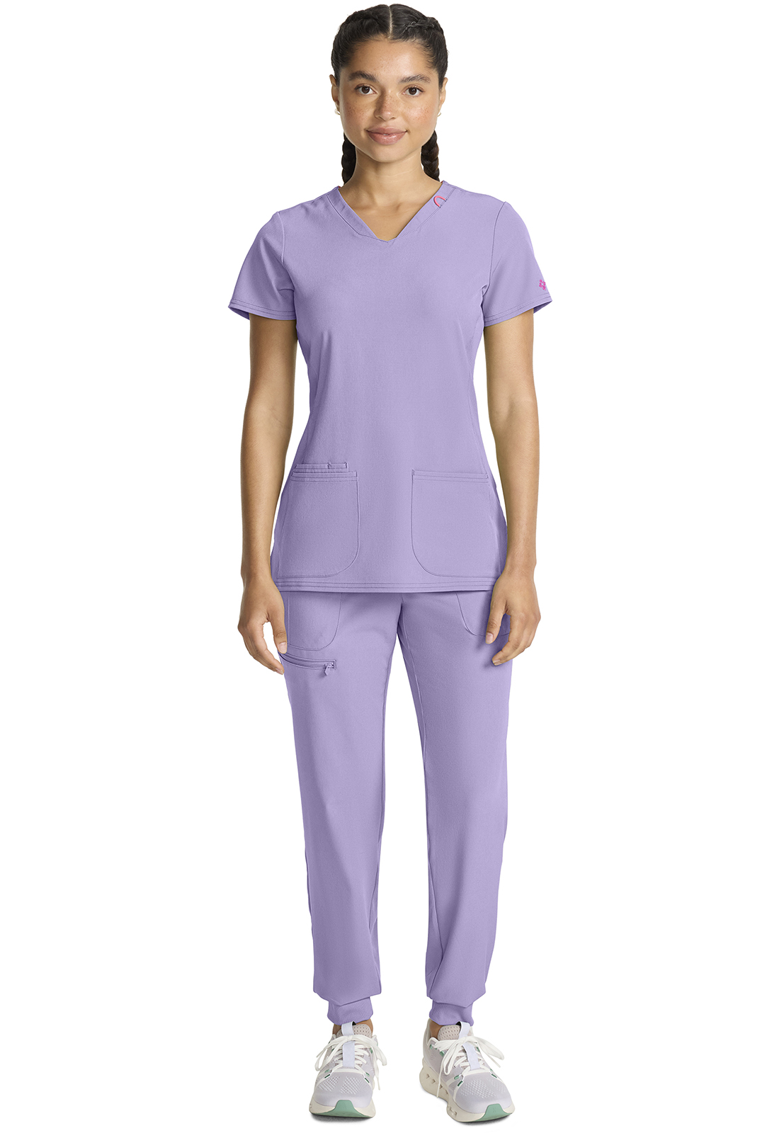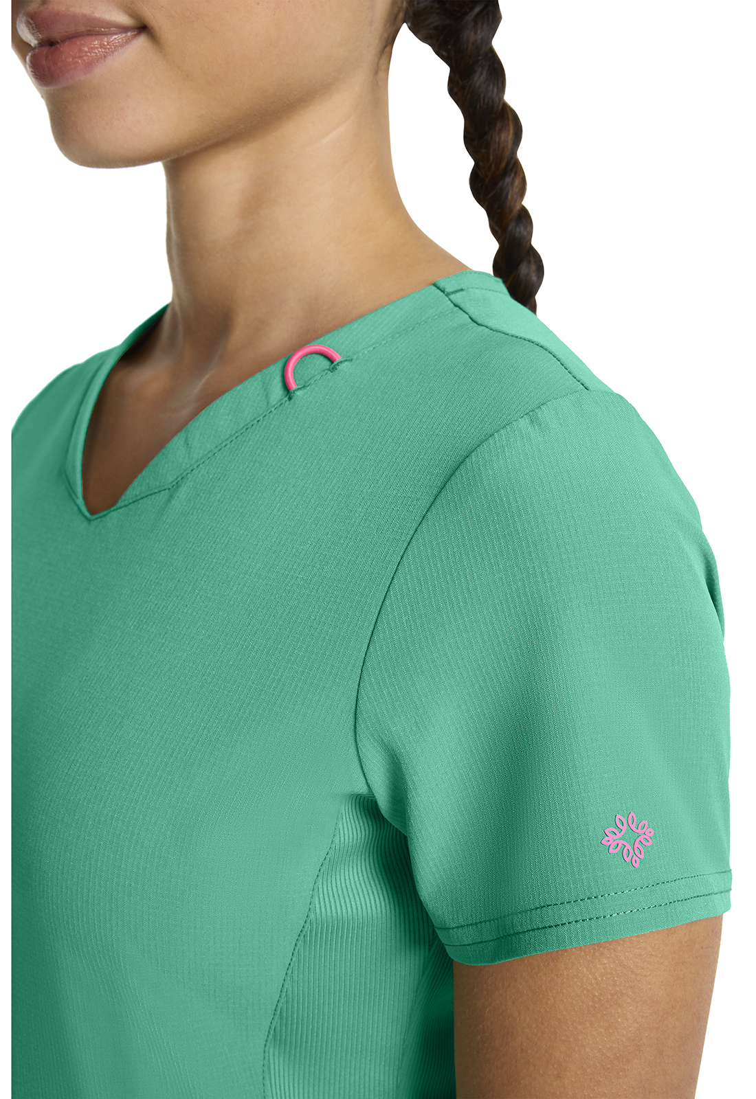 Женский топ с v-образным вырезом имеет фигурный вырез и петлю для бейджа на левой стороне носителя. Имеется три кармана для хранения: два накладных кармана и дополнительный карман для мобильного телефона с усиленным слотом для ручки. Внутри правого кармана носителя есть петли для инструментов из саржевой ленты для дополнительного хранения. Принцесские швы спереди и сзади придают форму и облегание, а боковые панели из трикотажа в тон обеспечивают комфорт и эластичность. Закругленный подол и боковые разрезы завершают образ. Длина по центру спинки: 65 см.