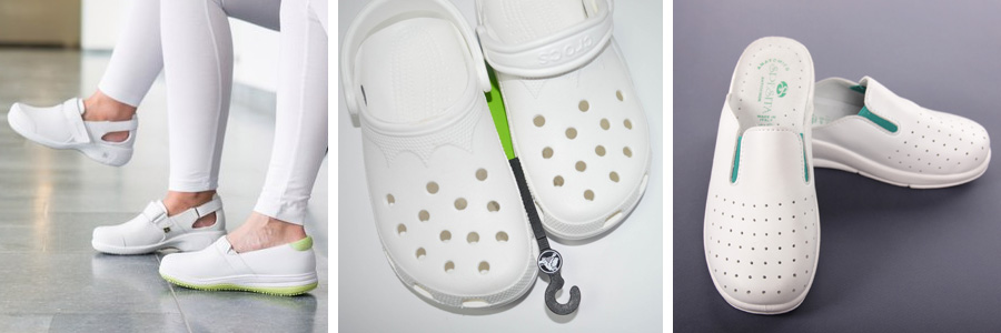 С одеждой белого цвета красиво смотрится белая обувь: к брючному костюму подойдут медицинские сабо, под халат лучше выбрать медицинские туфли белого цвета. Для мужчин покупают сабо или медицинские кроссовки.