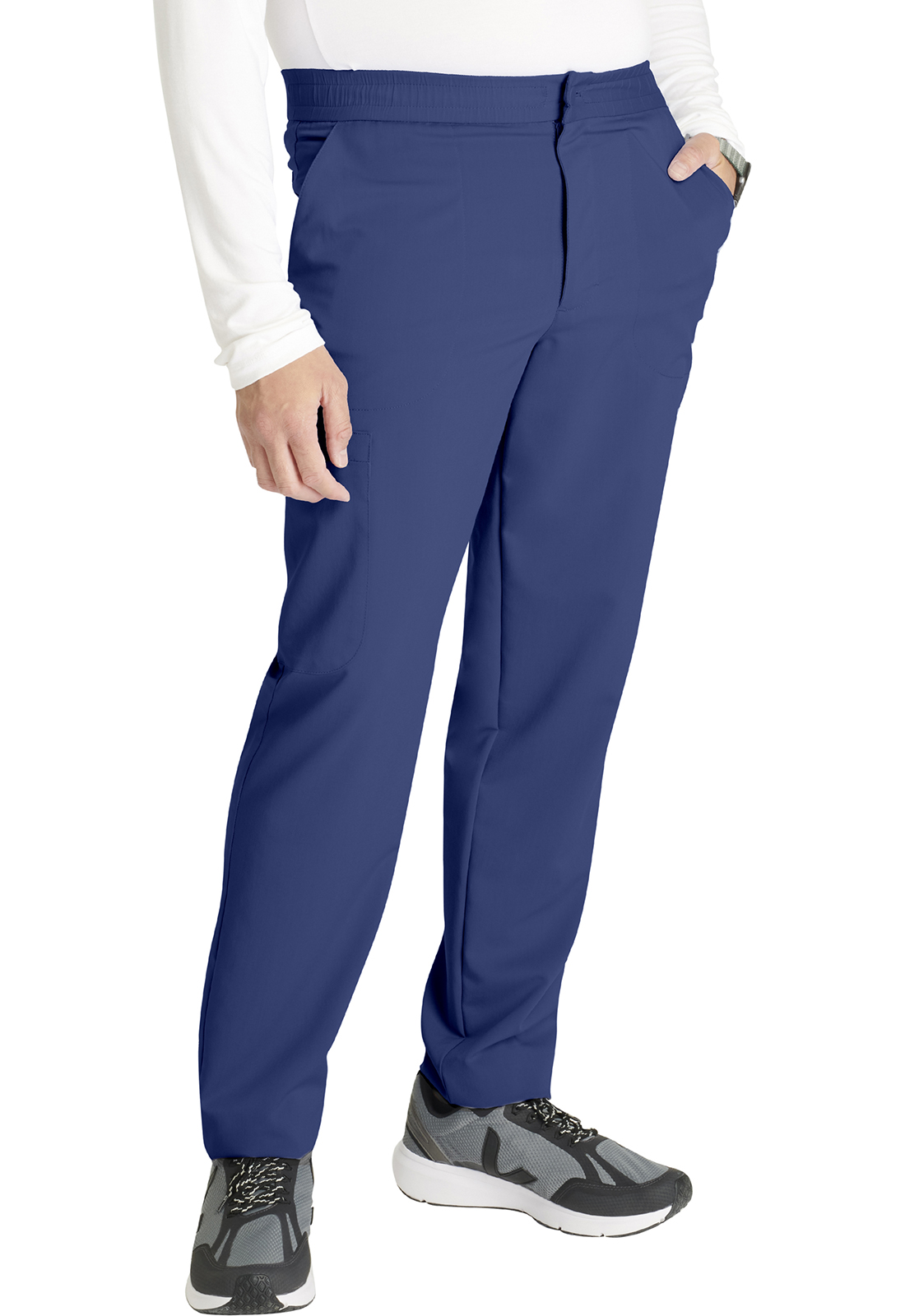 Мужские брюки средней посадки имеют застежку на молнии и пуговицу на поясе, а также внутреннюю резинку и пояс со шнурком. Имеют пять карманов: два передних прорезных кармана, один карго карман с передним входом и два задних накладных кармана. Зауженные штанины с отверстием 36 см. Длина по внутреннему шву: 81 см.