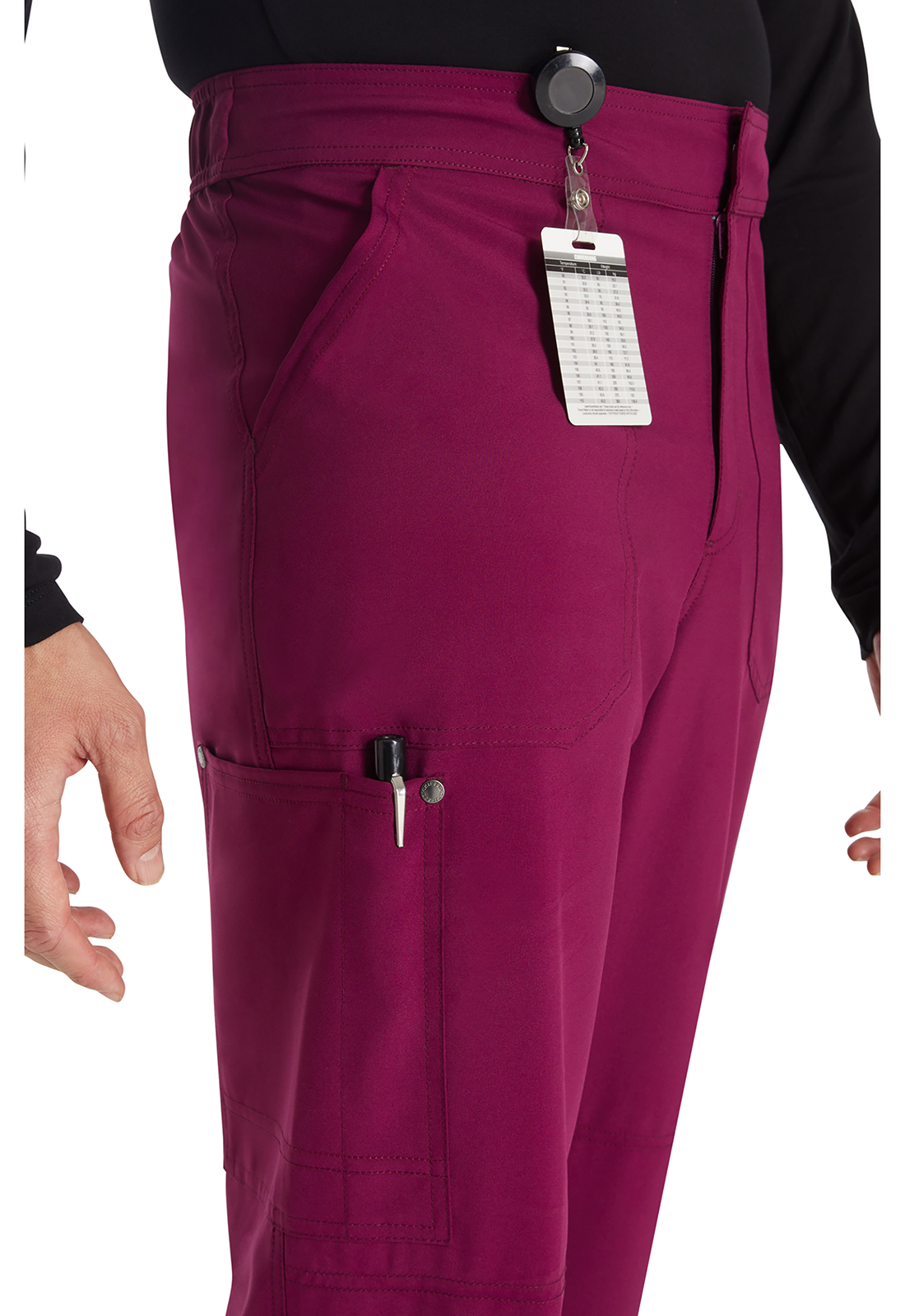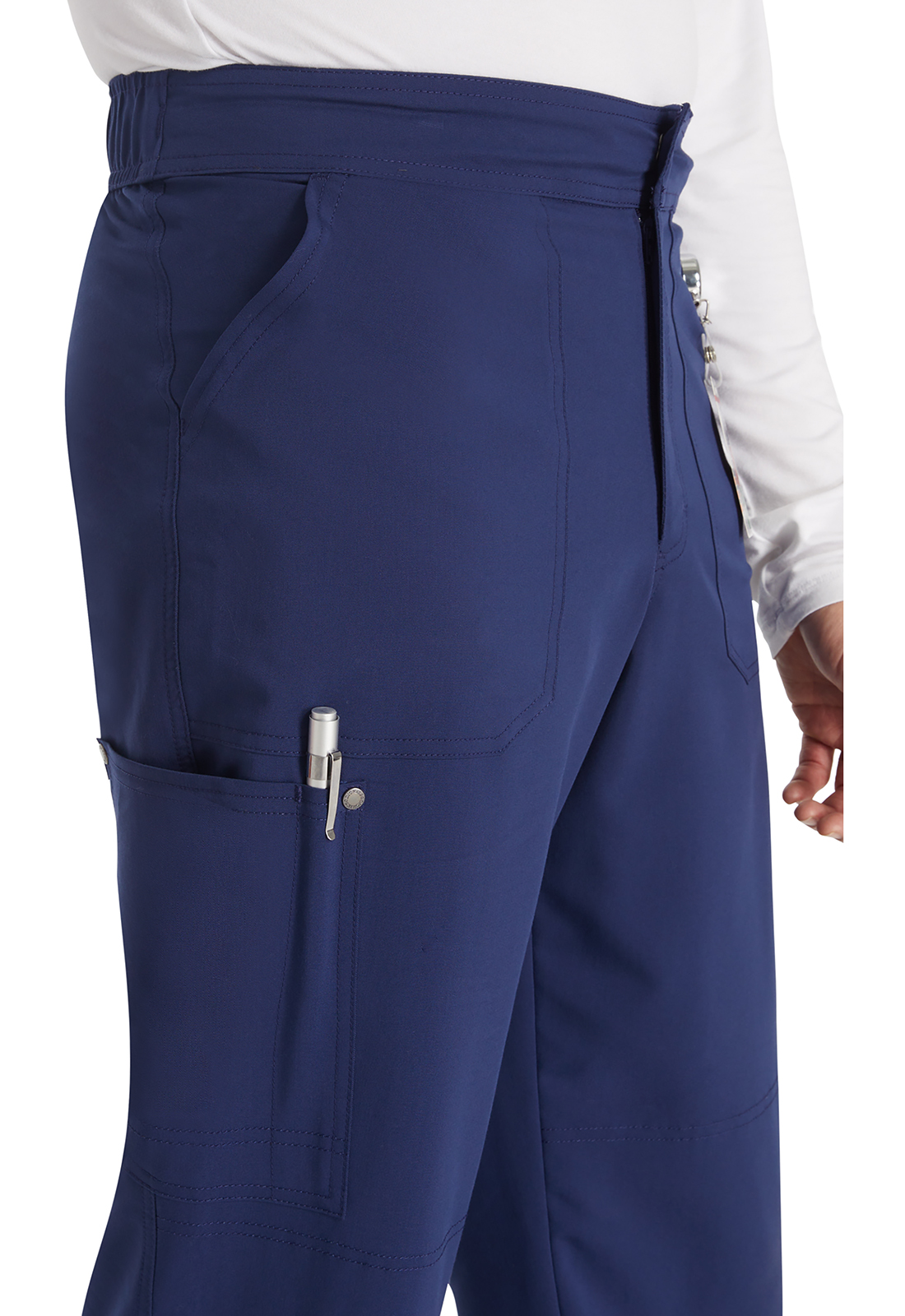 Брюки мужского кроя со средней посадкой имеют пояс, усиленный резинкой, с внутренним шнурком с логотипом для регулировки и надёжной фиксации. Пояс на резинке с гульфиком на молнии и застёжкой на кнопку с логотипом. В наличии четыре кармана для удобного хранения: два передних косых кармана и два накладных кармана с декоративной строчкой (правый — с петлёй для ручки или инструмента). На углах накладных карманов — декоративные кнопки с логотипом. Декоративная строчка на коленях и всех швах для добавления стиля. На талии сзади — петля с логотипом для быстрого подвешивания. Прямые штанины с шириной 43 см. Длина по внутреннему шву: 81 см.