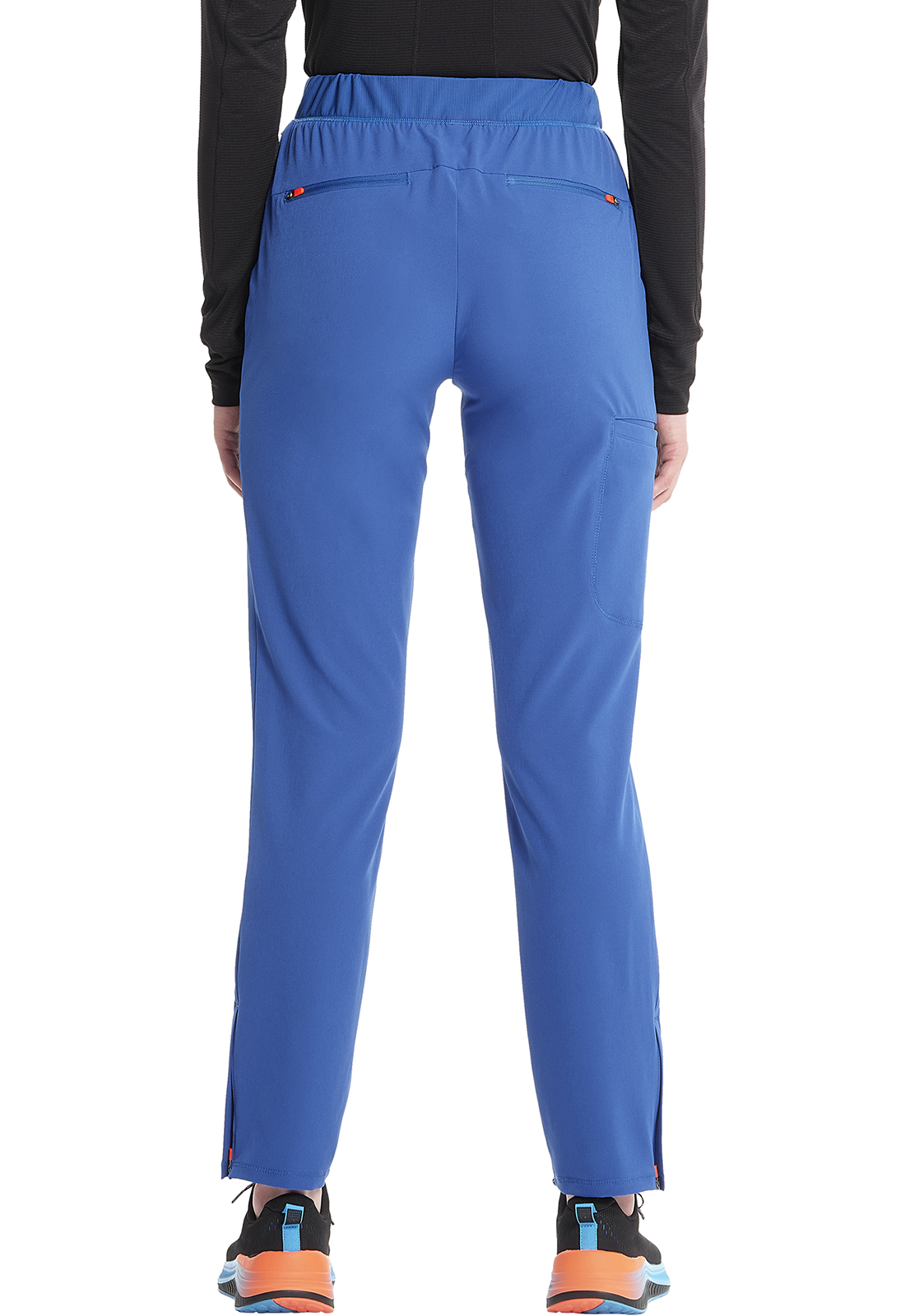 Брюки современного кроя со средней посадкой и эластичным поясом имеют внутреннюю резинку и плоский эластичный шнурок. В наличии пять карманов: два передних кармана на молнии, один прорезной накладной карман и два задних кармана на молнии в шве. Другие особенности включают изогнутую кокетку на спине, фирменные контрастные карманы из трикотажной сетки и подкладку боковых разрезов, а также боковые разрезы на молнии. Зауженные штанины с шириной 32 см. Длина по внутреннему шву: 69 см.