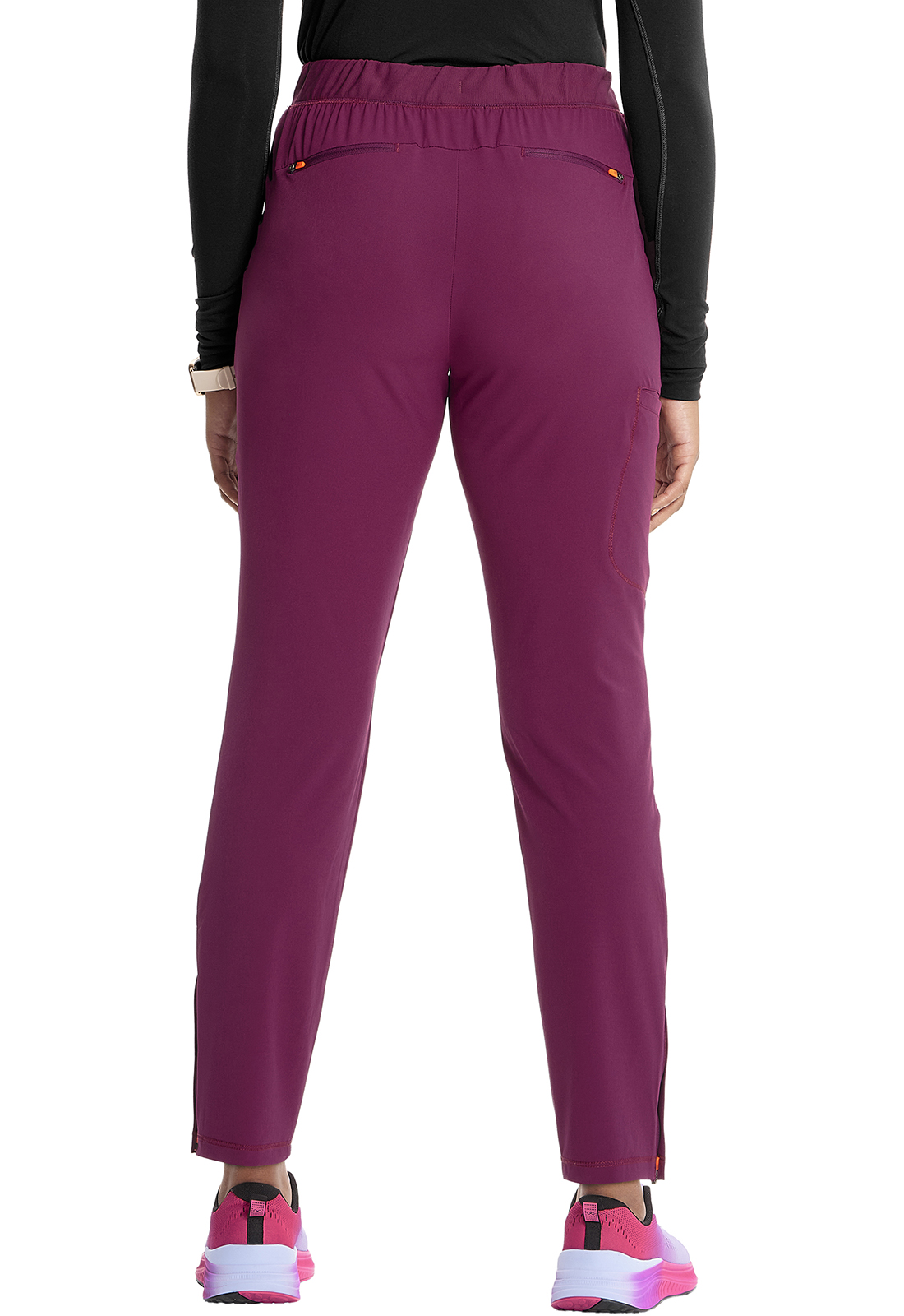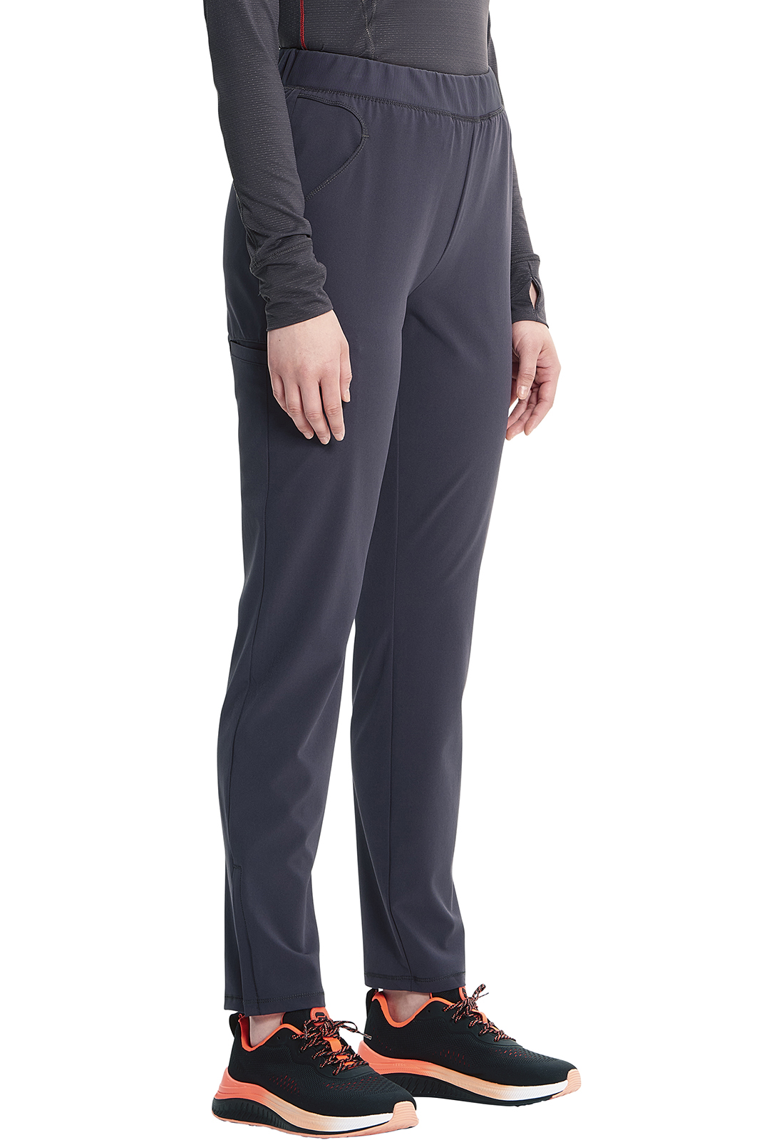 Брюки современного кроя со средней посадкой и поясом из трикотажа имеют внутреннюю резинку и плоский эластичный шнурок. В наличии пять карманов: два передних кармана на молнии, один прорезной накладной карман и два задних кармана на молнии в шве. Другие особенности включают изогнутую кокетку на спине, фирменные контрастные карманы из трикотажной сетки и подкладку боковых разрезов, а также боковые разрезы на молнии. Зауженные штанины с шириной 32 см. Длина по внутреннему шву: 83 см.