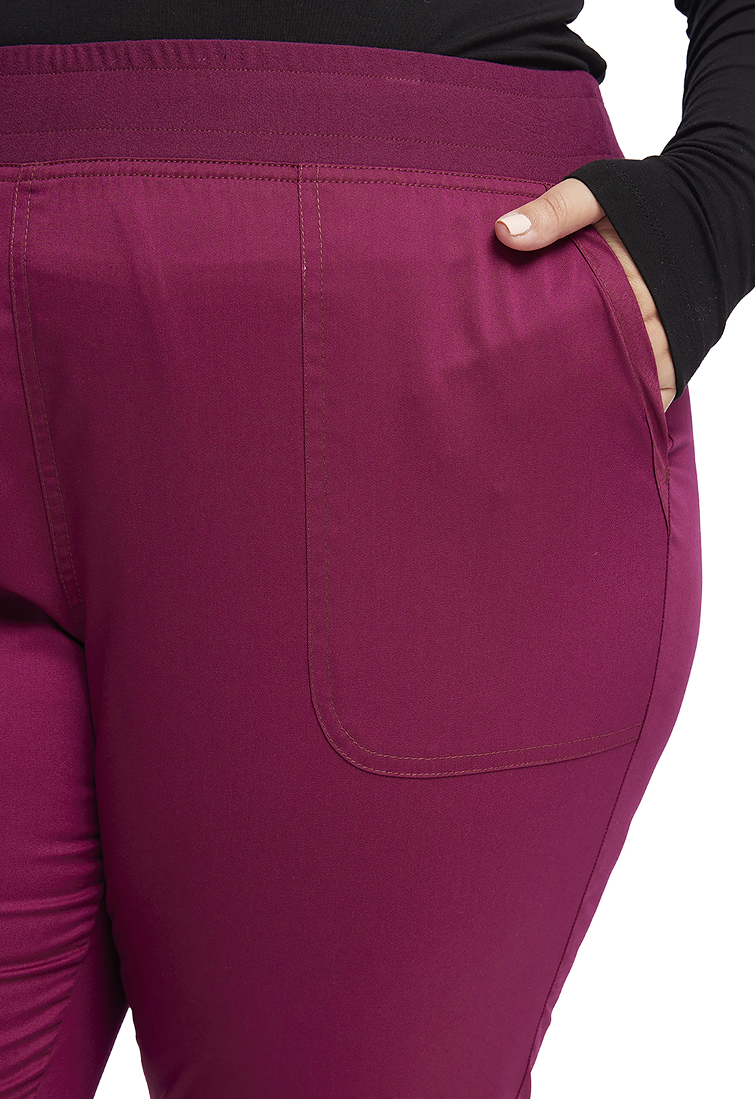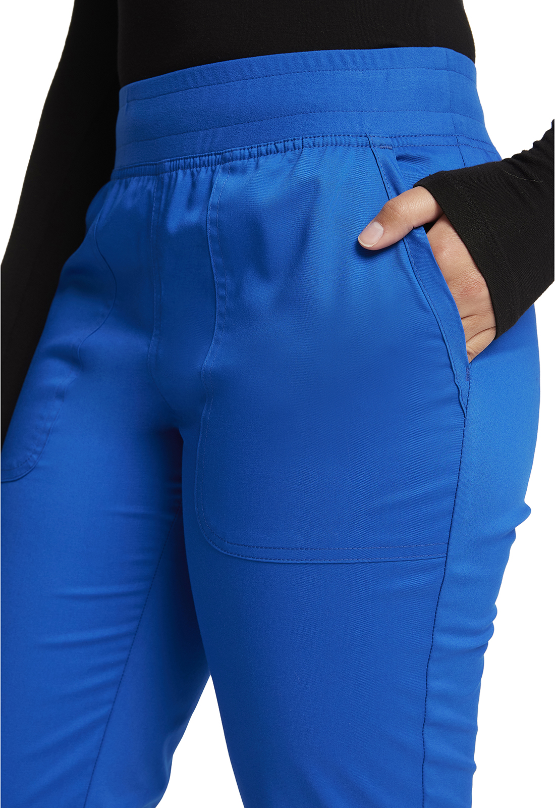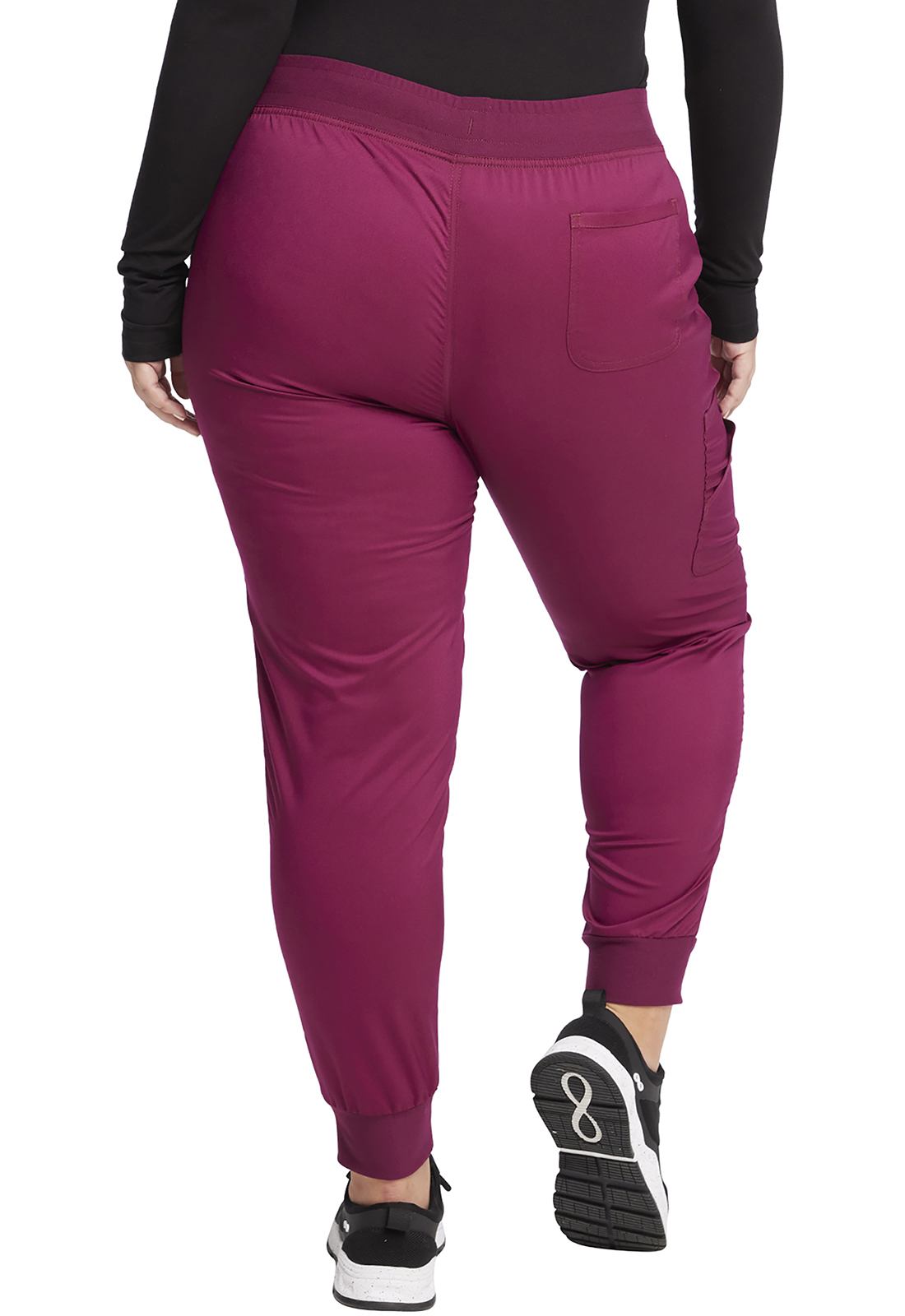 This Modern Classic fit mid rise pull-on jogger has an encased elastic knit waistband with interior drawstring. There are five pockets: two front patch pockets, a double cargo pocket with a bungee ID badge loop, and one back patch pocket. The pant also features a tapered leg and knit cuffs. Leg opening: 9 1/2". Inseam: 26"