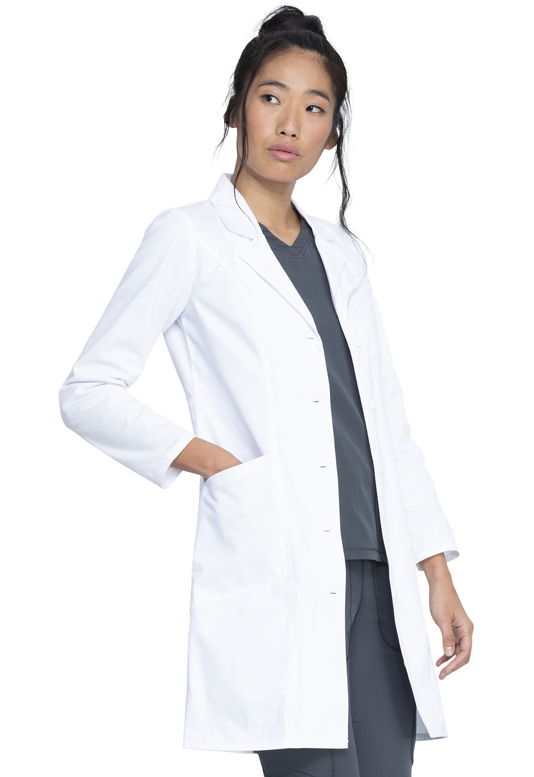Халат медицинский имеет зубчатый отворот и четыре кармана - один нагрудный, два передних угловых, и один для телефона, рельефные швы и пояс сзади дополняют образ. Длина: 93 см.