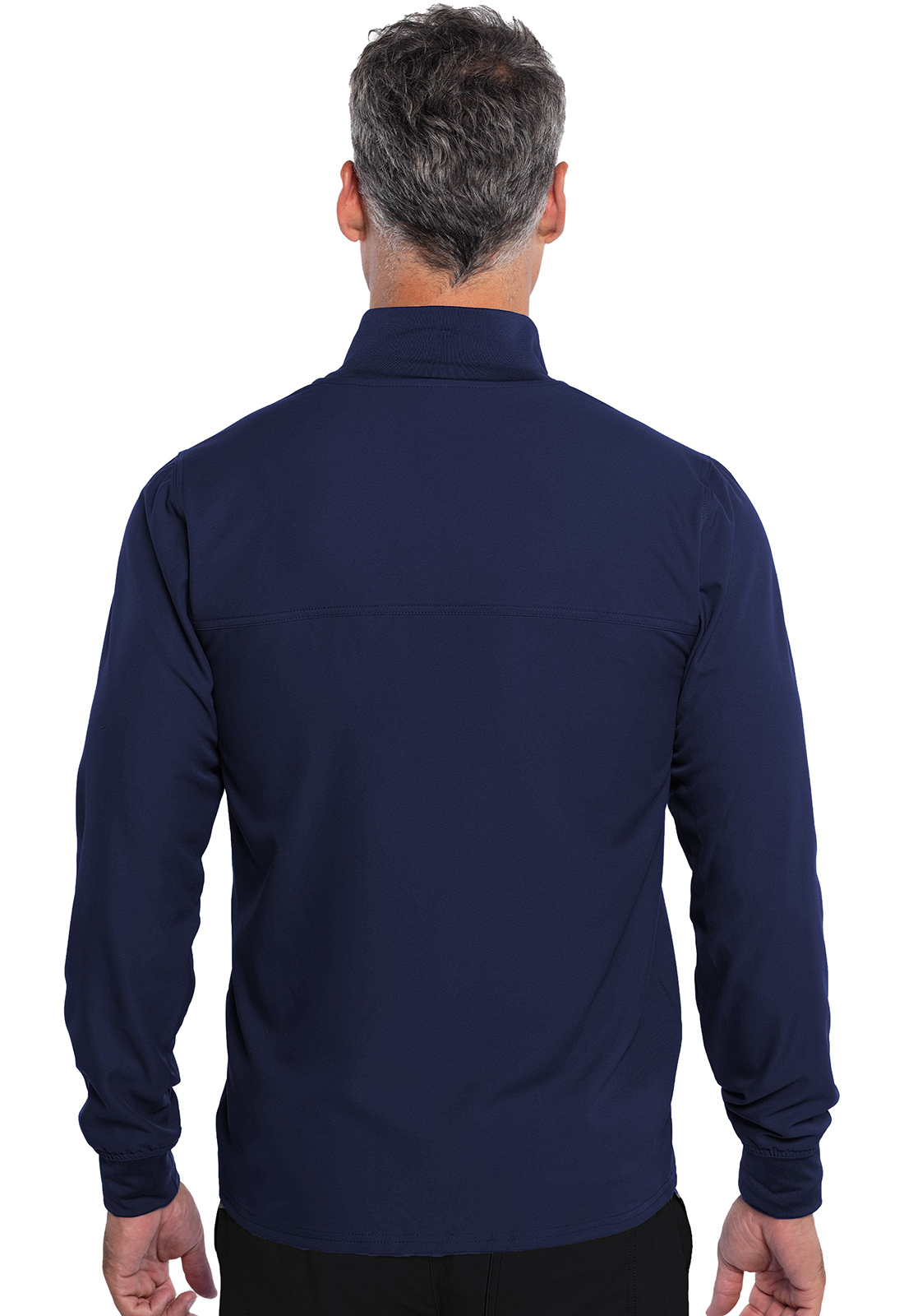 Мужской жакет с застежкой на молнию спереди имеет воротник-стойку и манжеты из трикотажного джерси. В нем предусмотрены три кармана для хранения: один накладной нагрудный карман и два косых накладных кармана. Спинку украшает кокетка. Длина по центру спинки: 72 см.