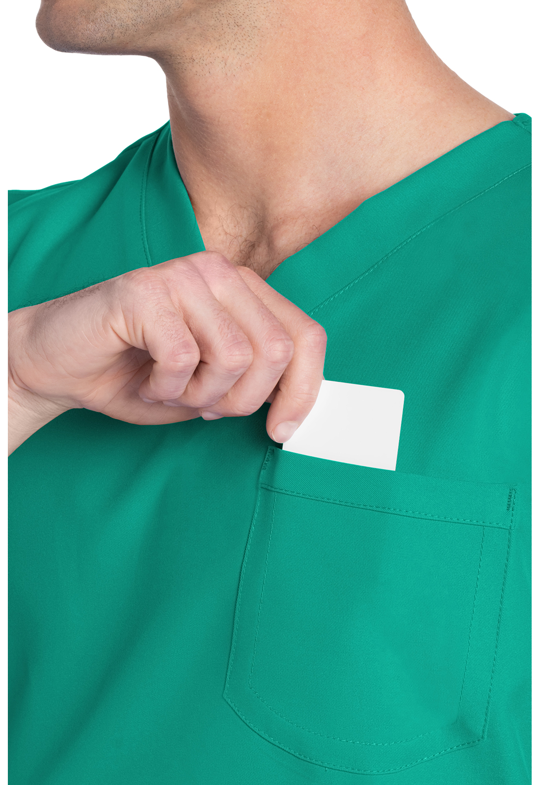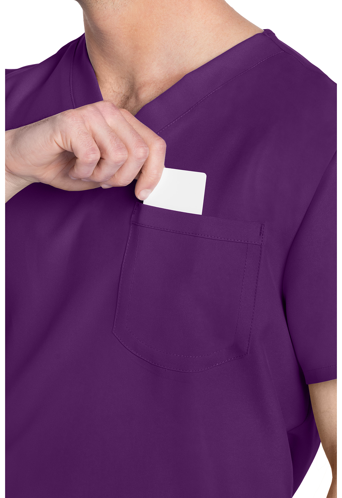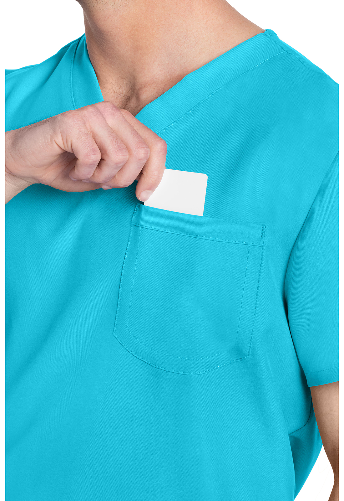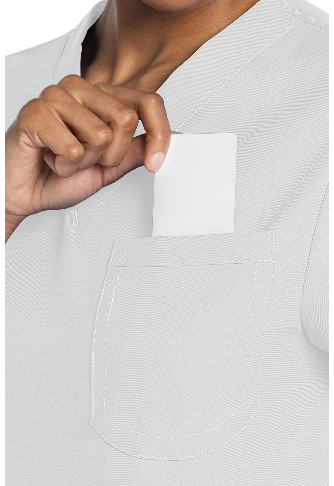 Этот топ унисекс с V-образным вырезом предлагает классический стиль без гендерных различий. Нагрудный накладной карман с отделкой обратным подгибом. Декоративная однотонная строчка. Длина по центру спинки: 71 см.