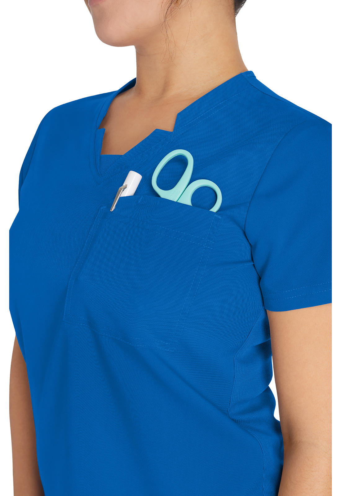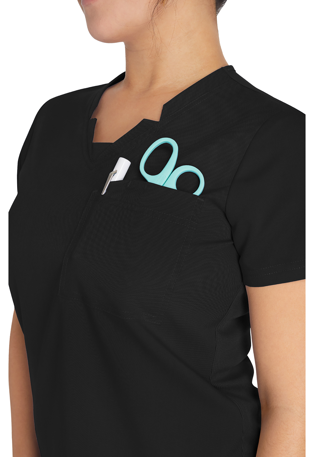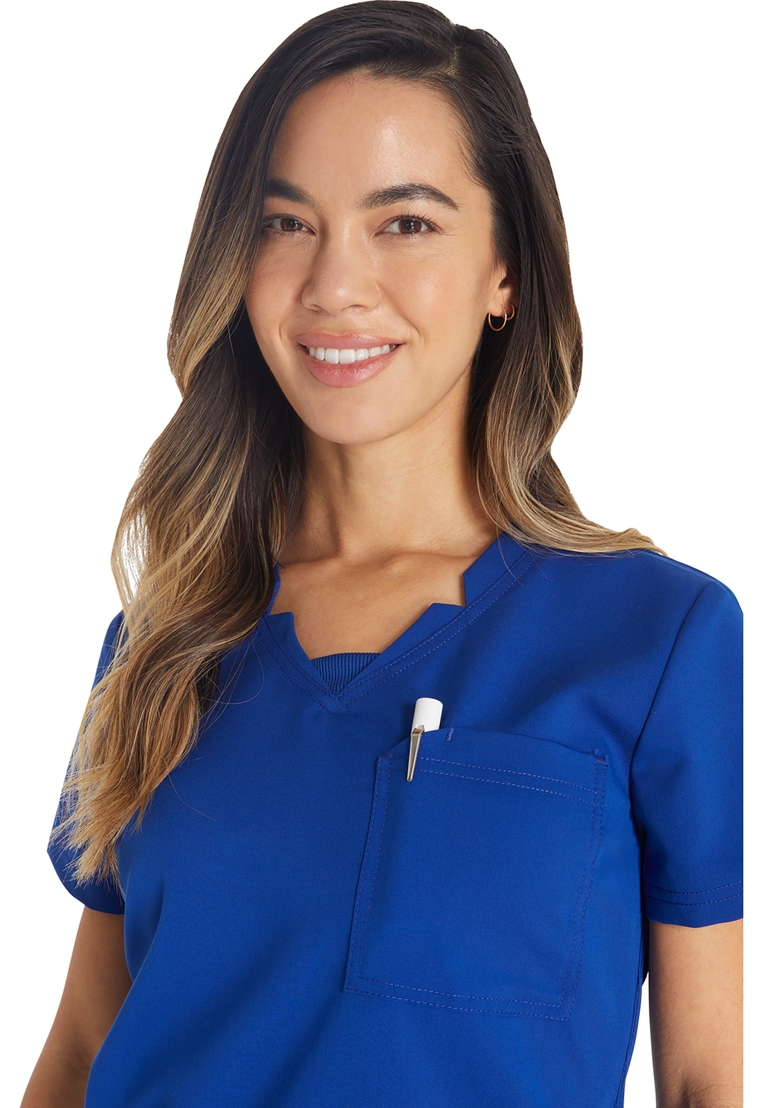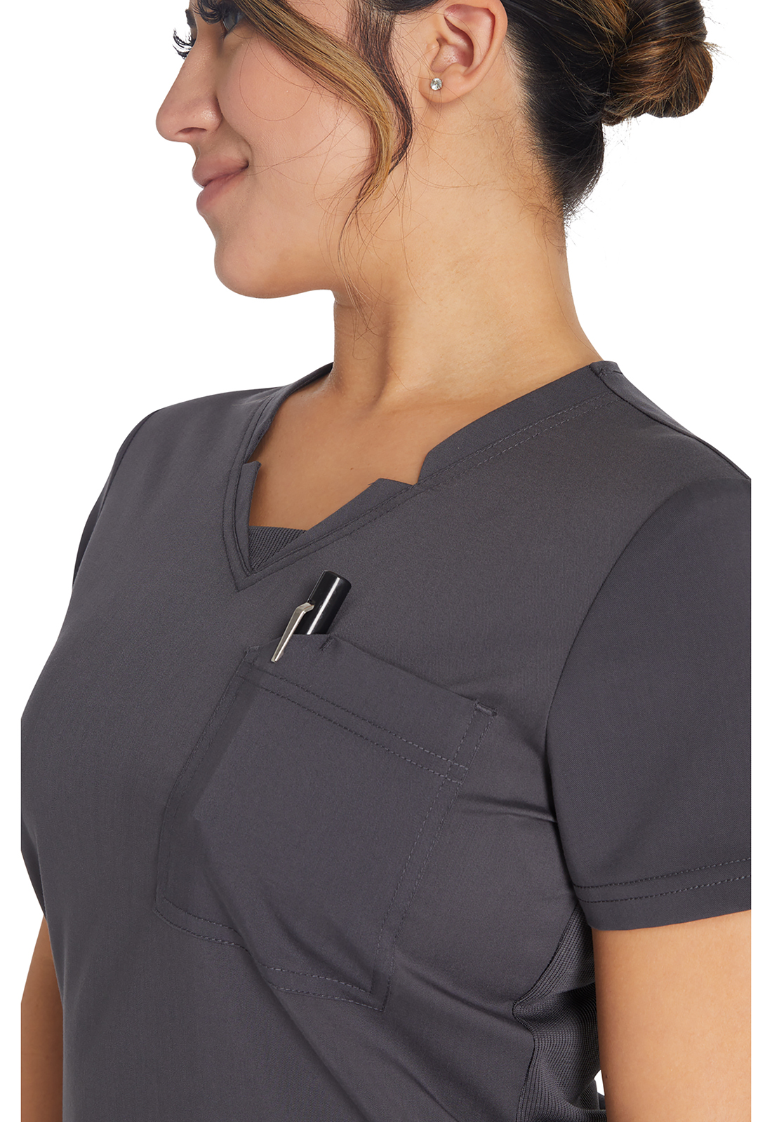 Топ с модным кроем в форме V-образного выреза имеет вырез на пуговицах с вставкой из вязаного материала в центре передней части в тон окраске. Для хранения предусмотрено два кармана: один нагрудный карман с отделением для ручки/инструментов и один накладной карман на правом бедре носителя. Вставки из вязаного материала в тон окраске по боковым панелям спины обеспечивают стретч и свободу движений. Плечевые и спинные вставки, а также боковые вентиляционные отверстия завершают этот стиль. Длина по центру спины: 65 см.