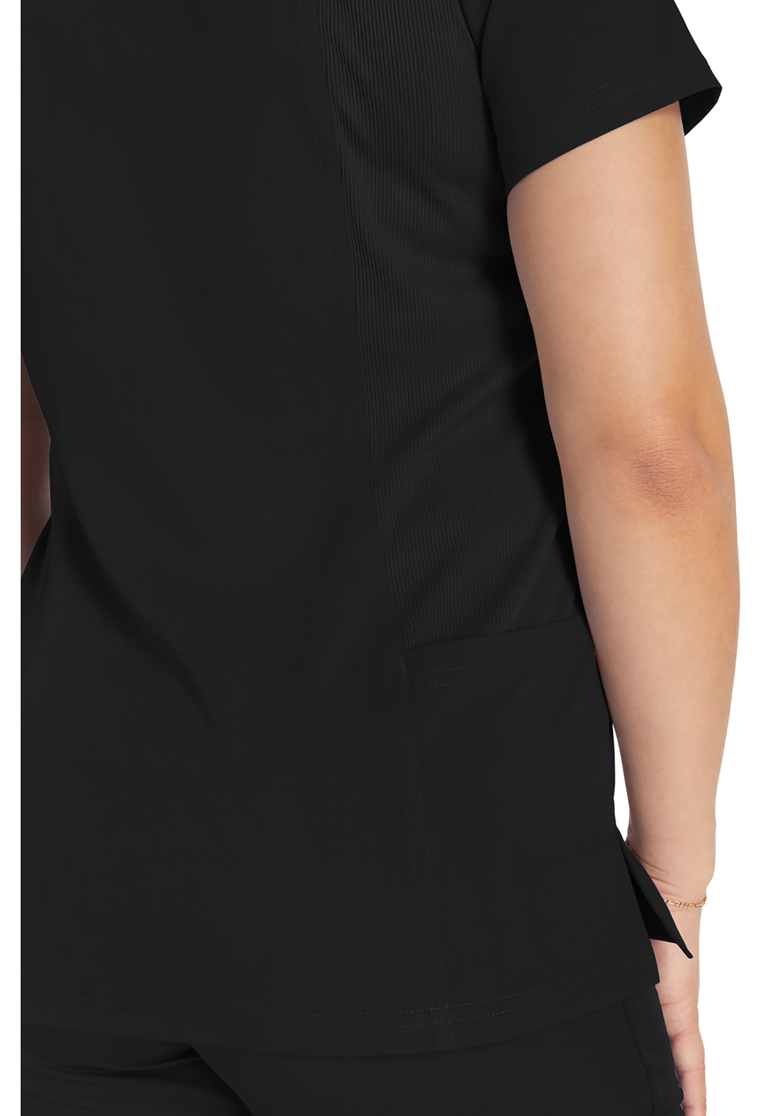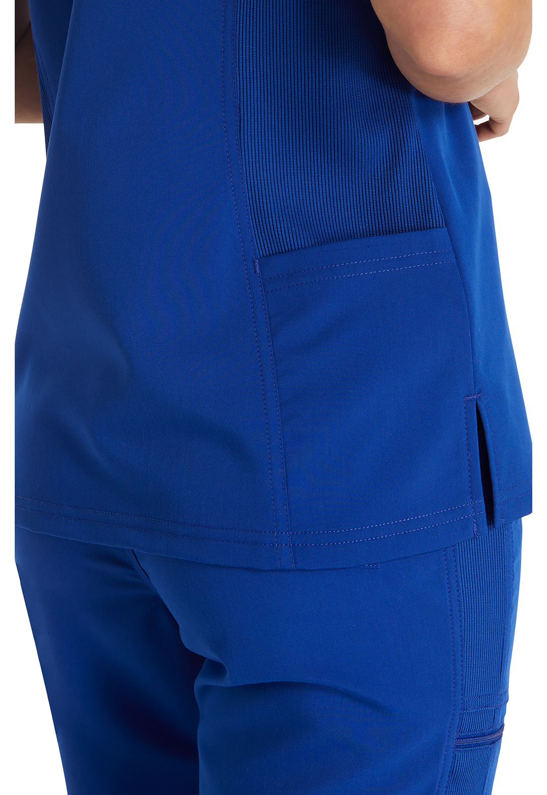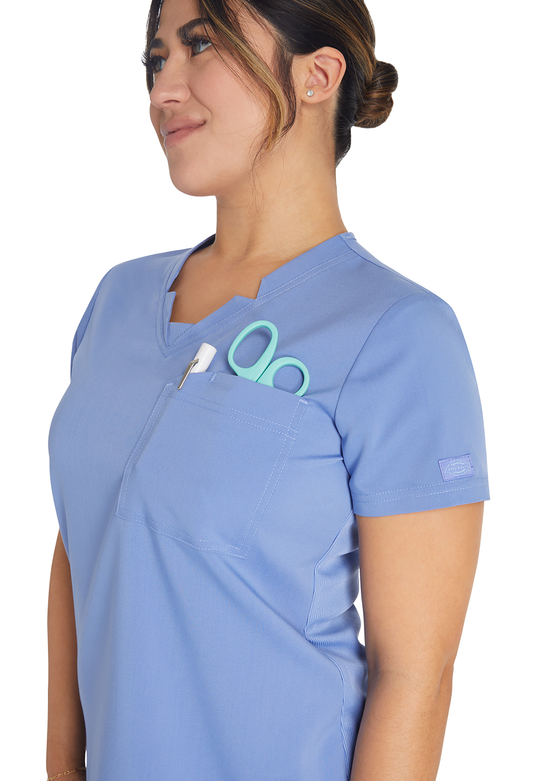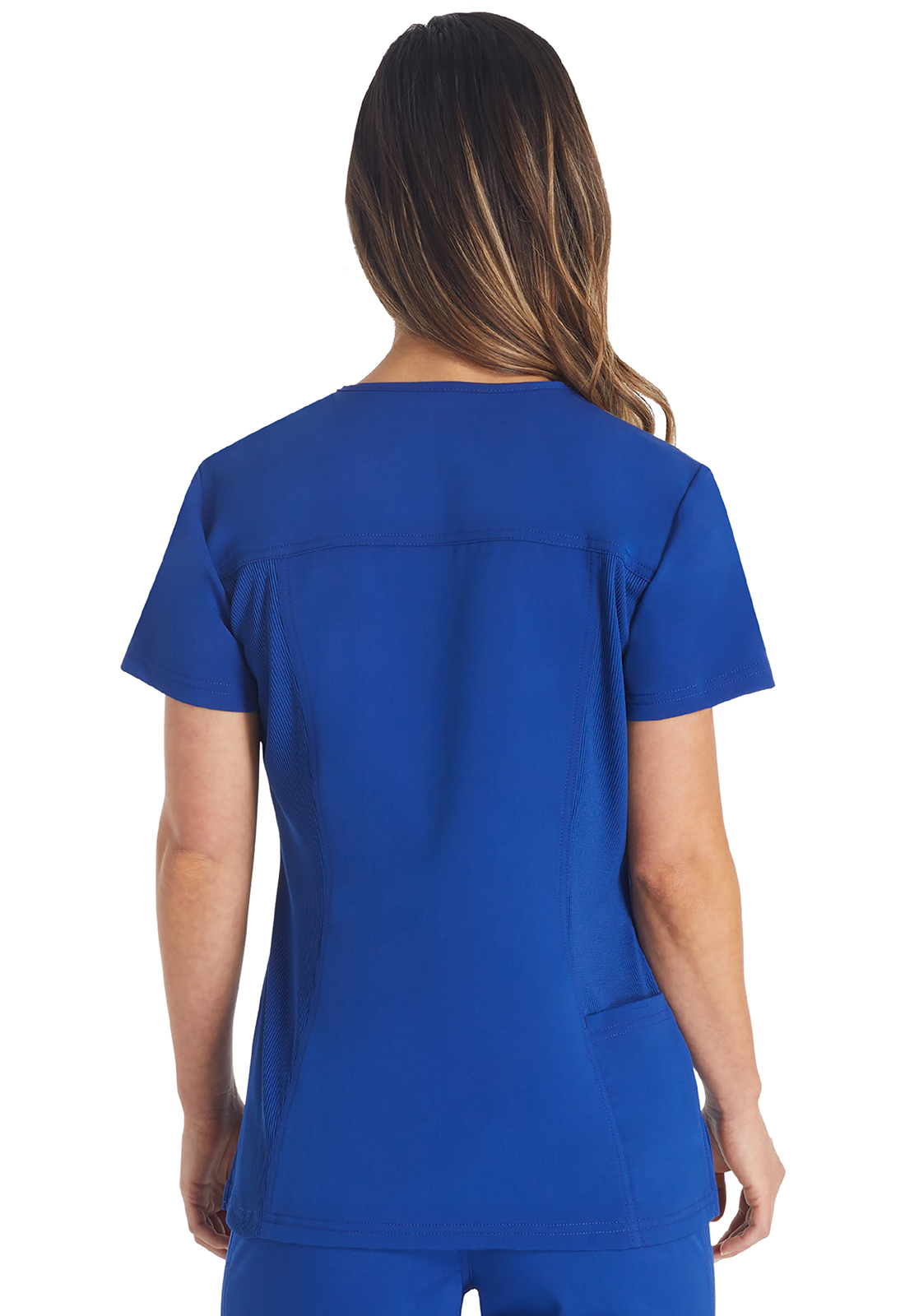 Топ с модным кроем в форме V-образного выреза имеет вырез на пуговицах с вставкой из вязаного материала в центре передней части в тон окраске. Для хранения предусмотрено два кармана: один нагрудный карман с отделением для ручки/инструментов и один накладной карман на правом бедре носителя. Вставки из вязаного материала в тон окраске по боковым панелям спины обеспечивают стретч и свободу движений. Плечевые и спинные вставки, а также боковые вентиляционные отверстия завершают этот стиль. Длина по центру спины: 65 см.