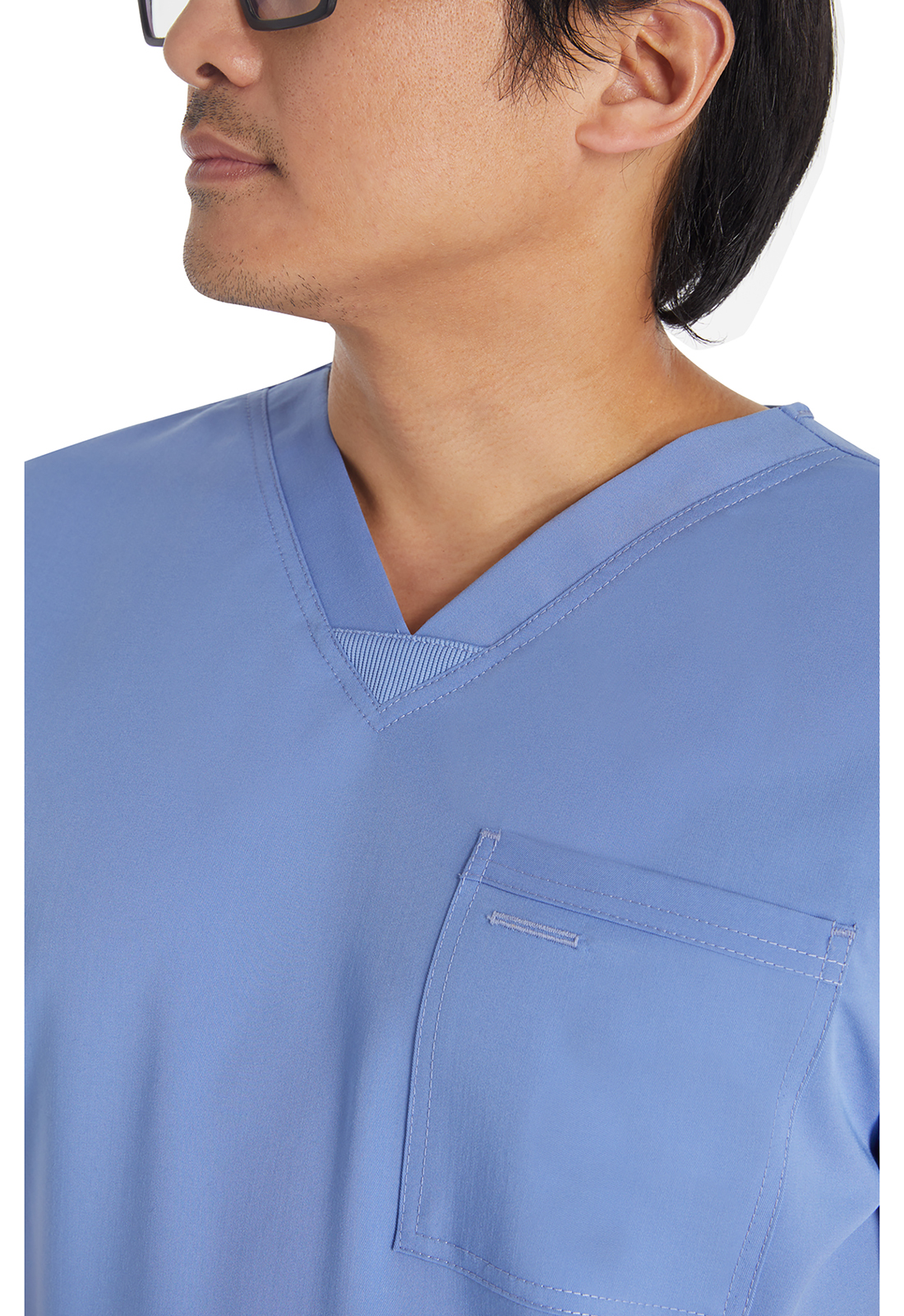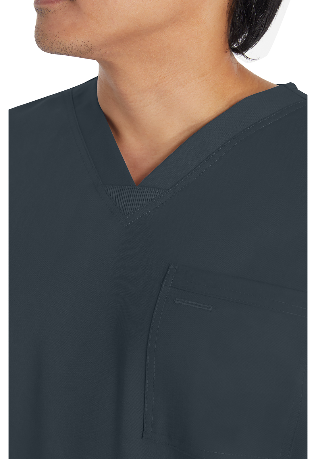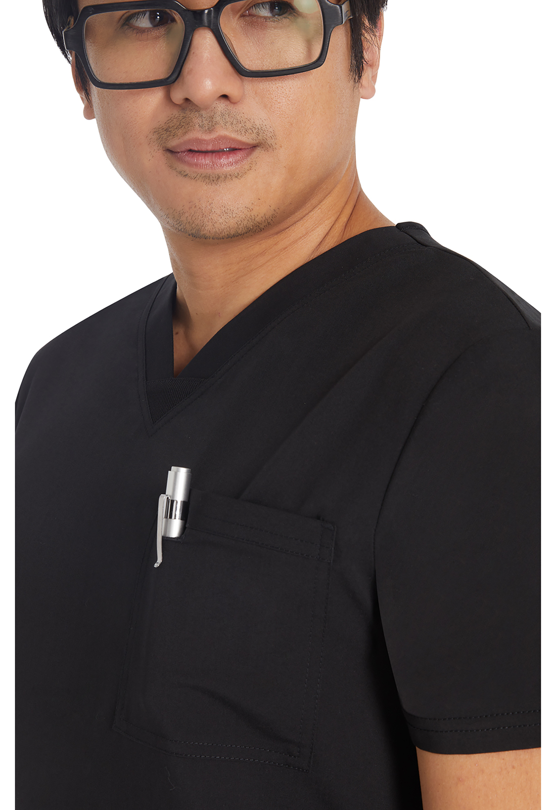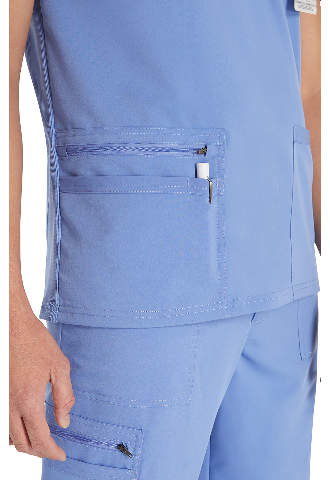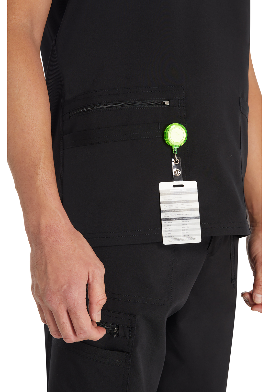 Топ V-образного выреза с мужским кроем имеет вставки из вязаного материала в тон окраске по боковым панелям спины для комфорта и стретча. В центре передней части воротника имеется вставка из вязаного материала в тон окраске для стиля и дополнительной эластичности. Четыре кармана обеспечивают достаточное количество места для хранения: один нагрудный накладной карман с отделением для ручки/инструмента, два накладных кармана (один с молнией для безопасного хранения) и один дополнительный накладной карман с усиленным отверстием для ручки/инструментов. Длина по центру спины: 71 см.