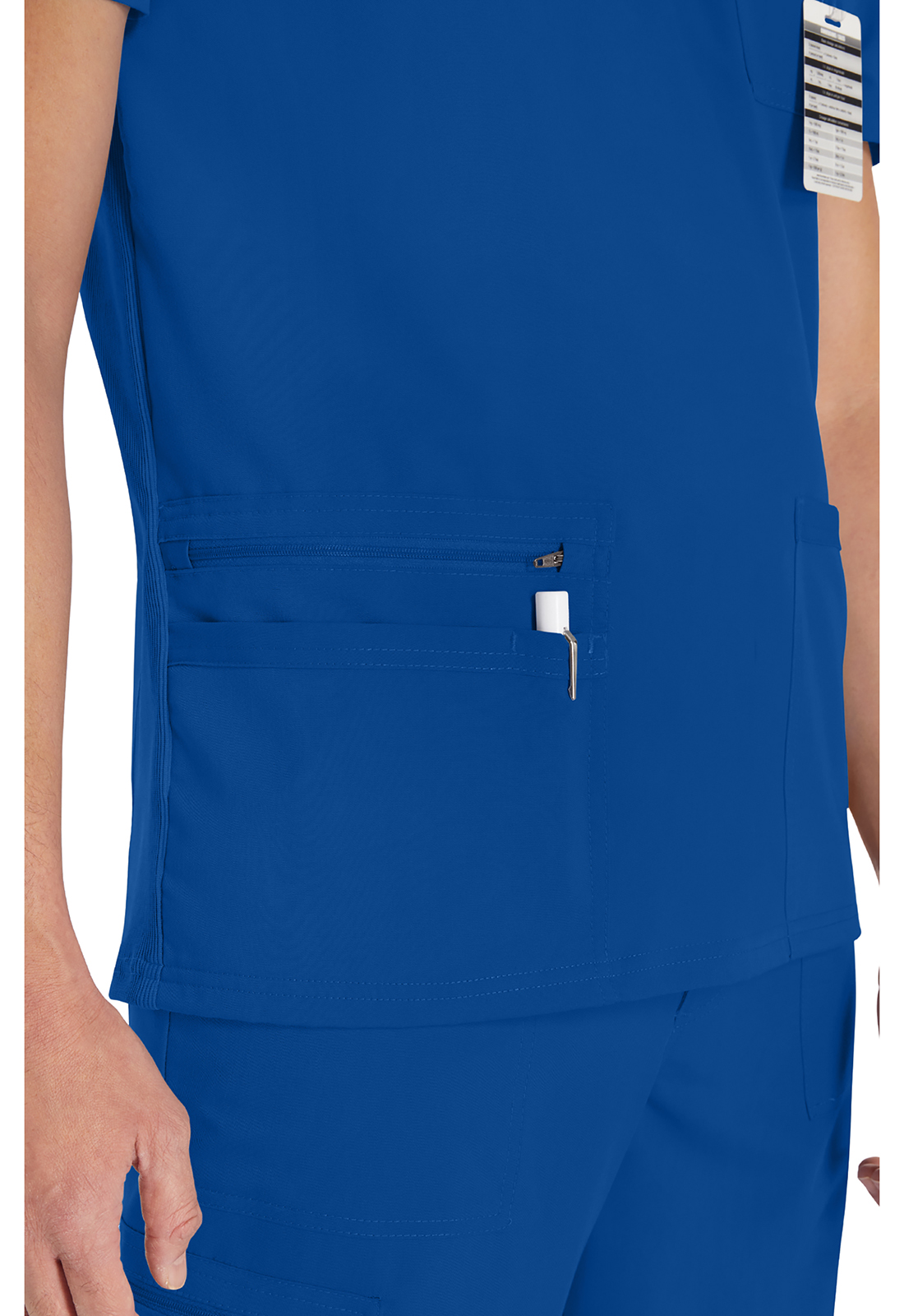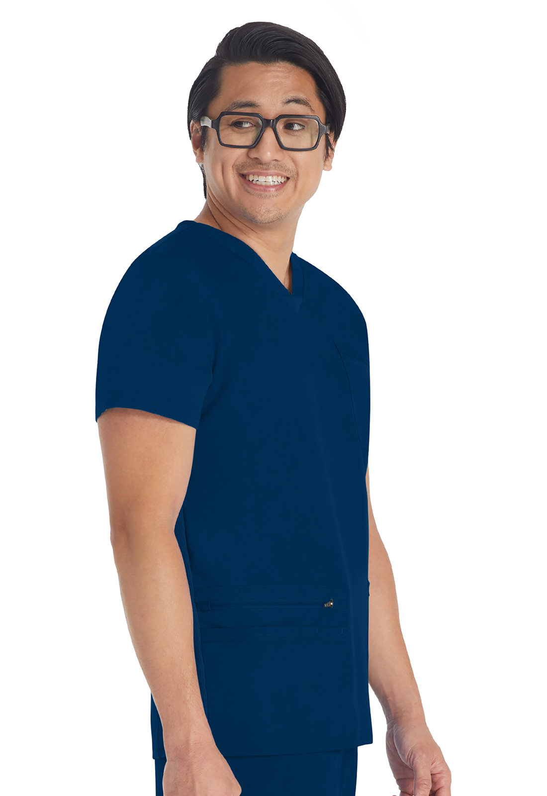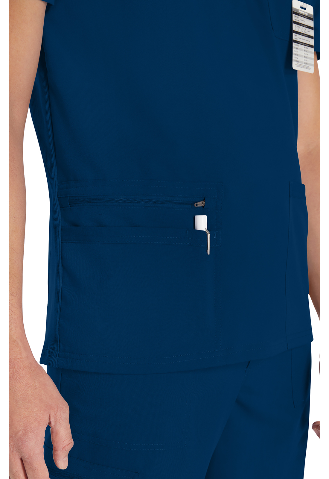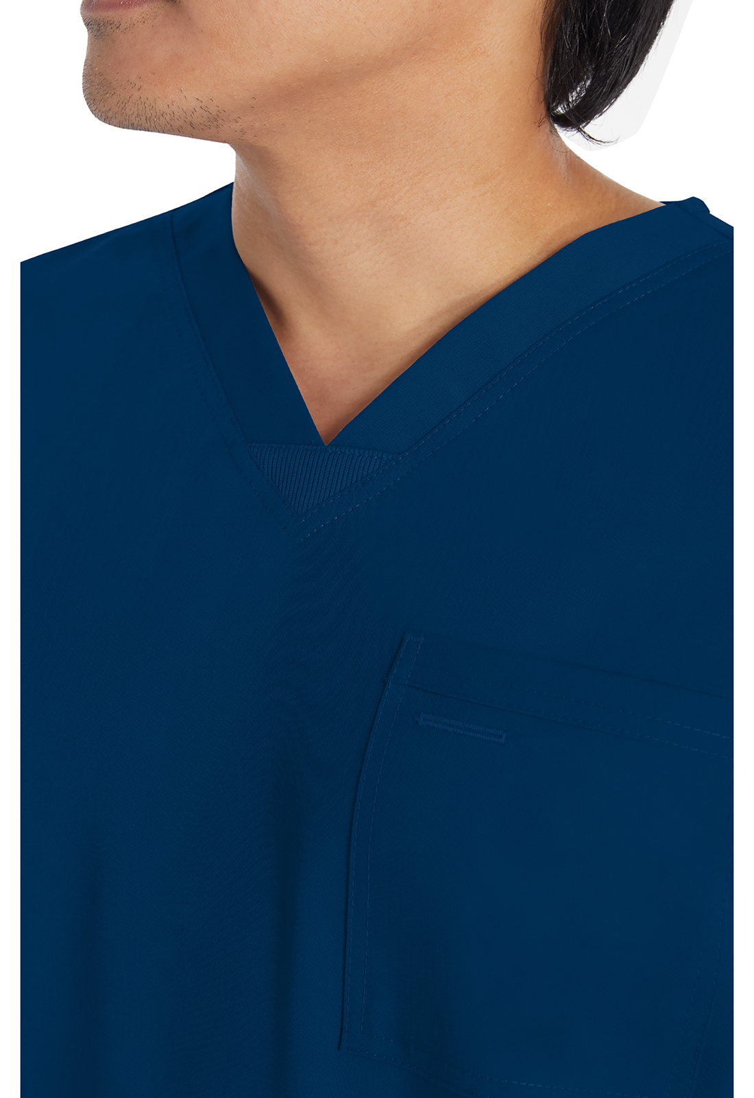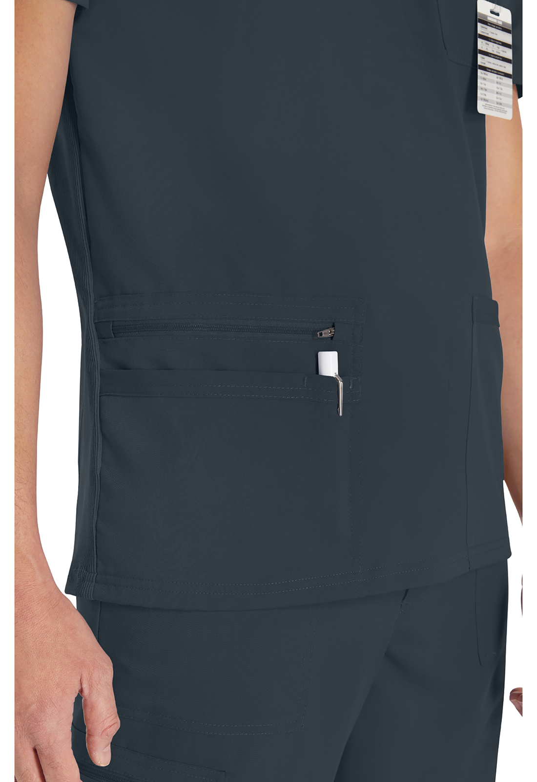 Топ V-образного выреза с мужским кроем имеет вставки из вязаного материала в тон окраске по боковым панелям спины для комфорта и стретча. В центре передней части воротника имеется вставка из вязаного материала в тон окраске для стиля и дополнительной эластичности. Четыре кармана обеспечивают достаточное количество места для хранения: один нагрудный накладной карман с отделением для ручки/инструмента, два накладных кармана (один с молнией для безопасного хранения) и один дополнительный накладной карман с усиленным отверстием для ручки/инструментов. Длина по центру спины: 71 см.