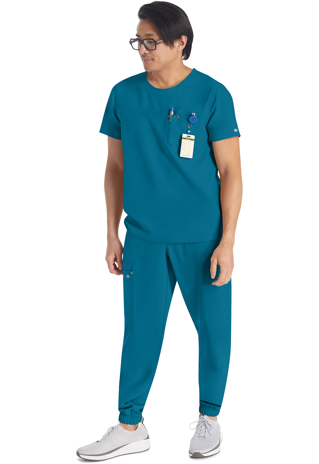 Мужской топ с круглым вырезом отличается многониточным швом на воротнике, а также декоративной строчкой на всех швах для дополнительного стиля. Есть один нагрудный карман с декоративной строчкой. В кармане также имеется петля из ткани для инструмента и декоративная кнопка с логотипом в углу. Передние и задние швы на плечах завершают этот мужской топ. Может быть носим как заправленным, так и выпущенным. Длина по центру спины: 71 см.