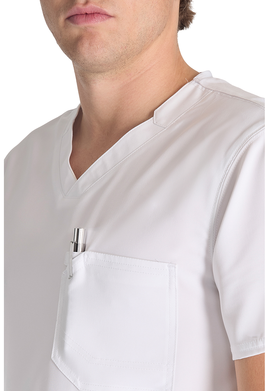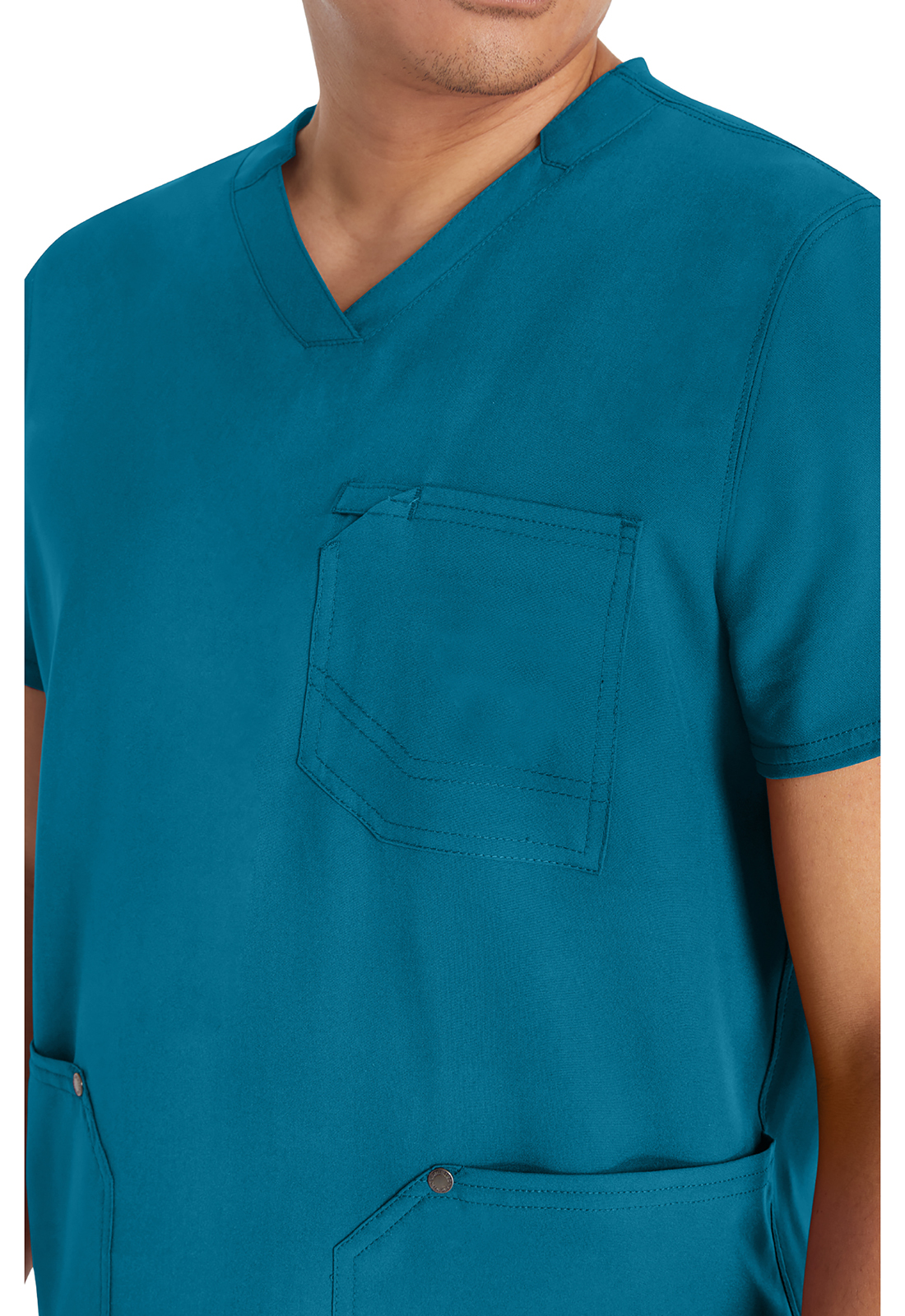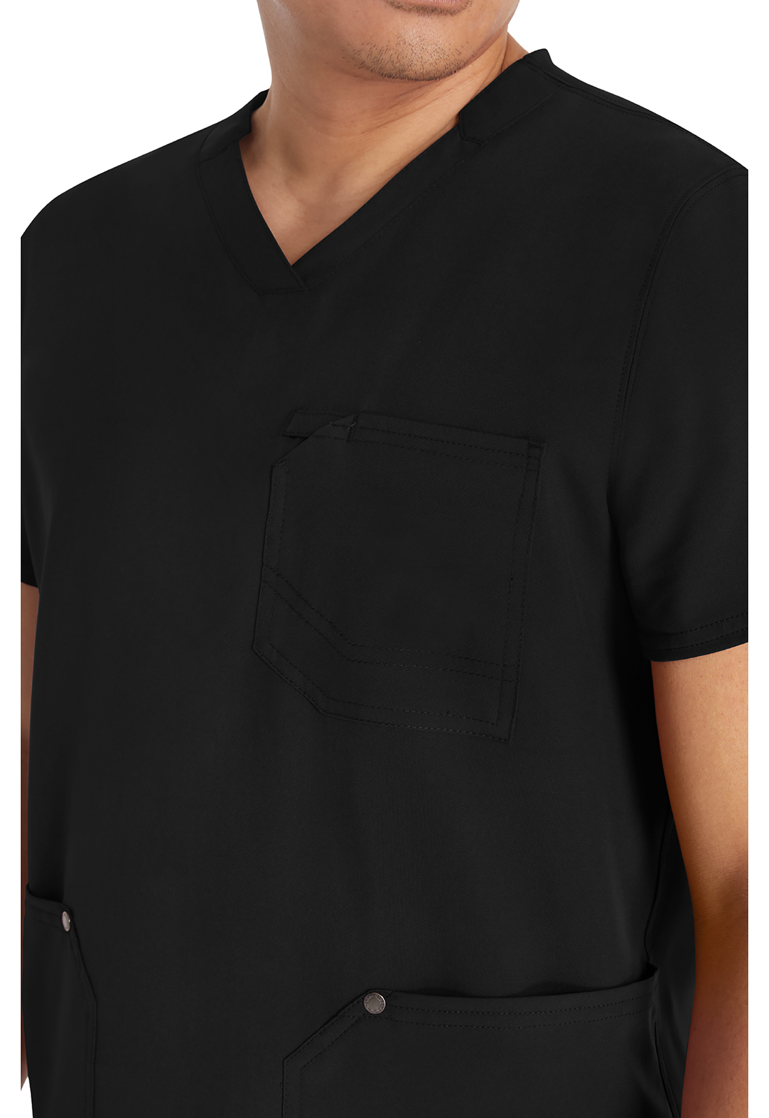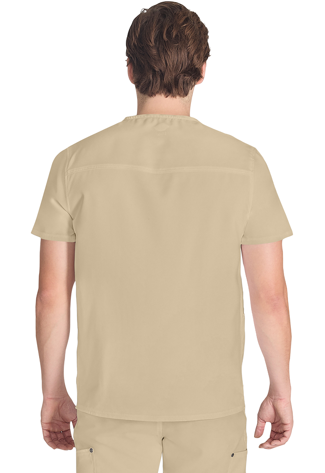Мужской топ с V-образным вырезом имеет стилизованную двойную окантовку горловины и декоративную строчку на всех швах. Для хранения предусмотрены три кармана: один нагрудный накладной карман с петлей из той же ткани и два нижних накладных кармана с декоративными кнопками с логотипом в углах. Нагрудный карман имеет декоративную строчку для дополнительного стиля. Завершает дизайн задняя кокетка. Длина по центру спины: 72 см.