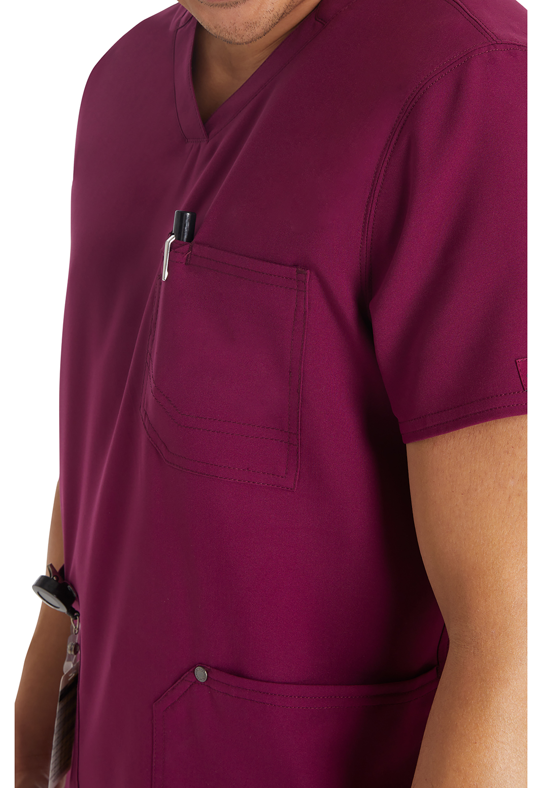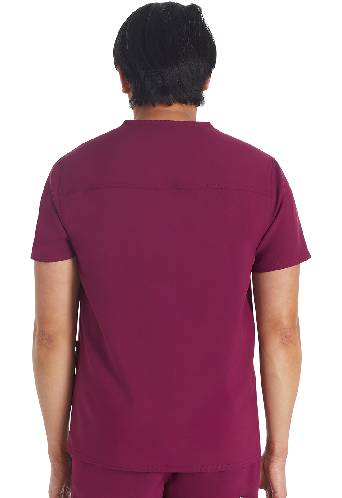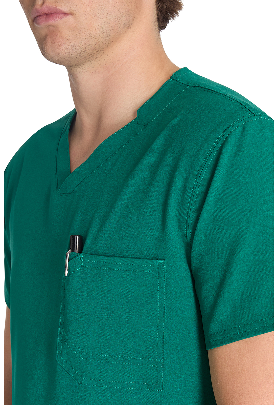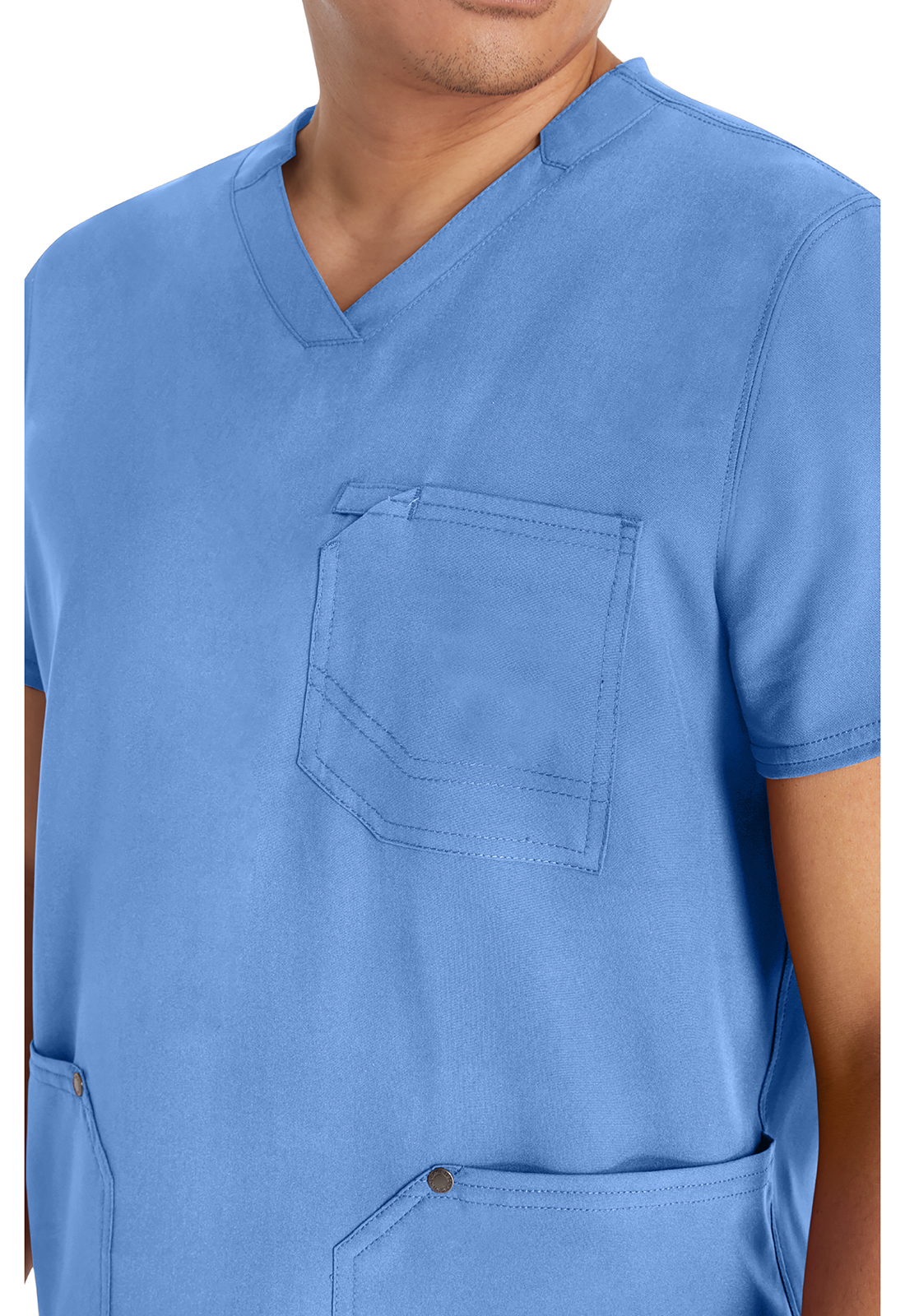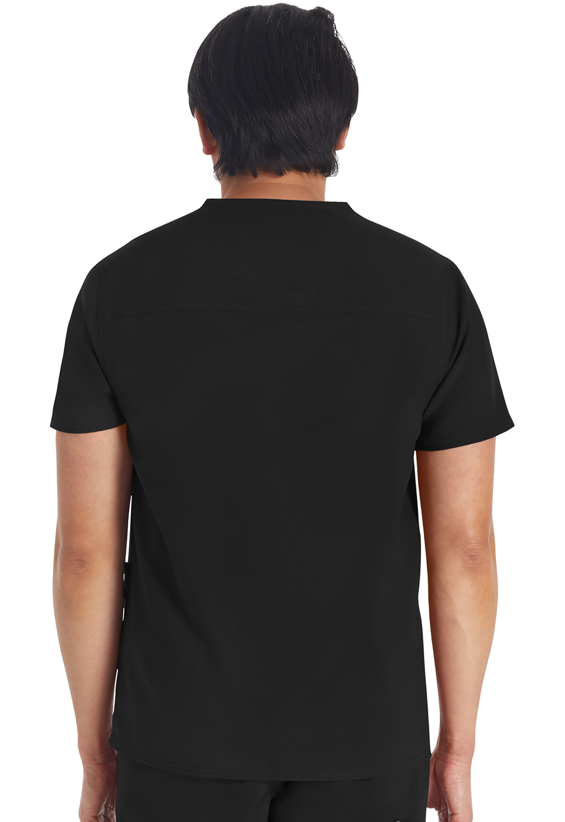 Мужской топ с V-образным вырезом имеет стилизованную двойную окантовку горловины и декоративную строчку на всех швах. Для хранения предусмотрены три кармана: один нагрудный накладной карман с петлей из той же ткани и два нижних накладных кармана с декоративными кнопками с логотипом в углах. Нагрудный карман имеет декоративную строчку для дополнительного стиля. Завершает дизайн задняя кокетка. Длина по центру спины: 72 см.