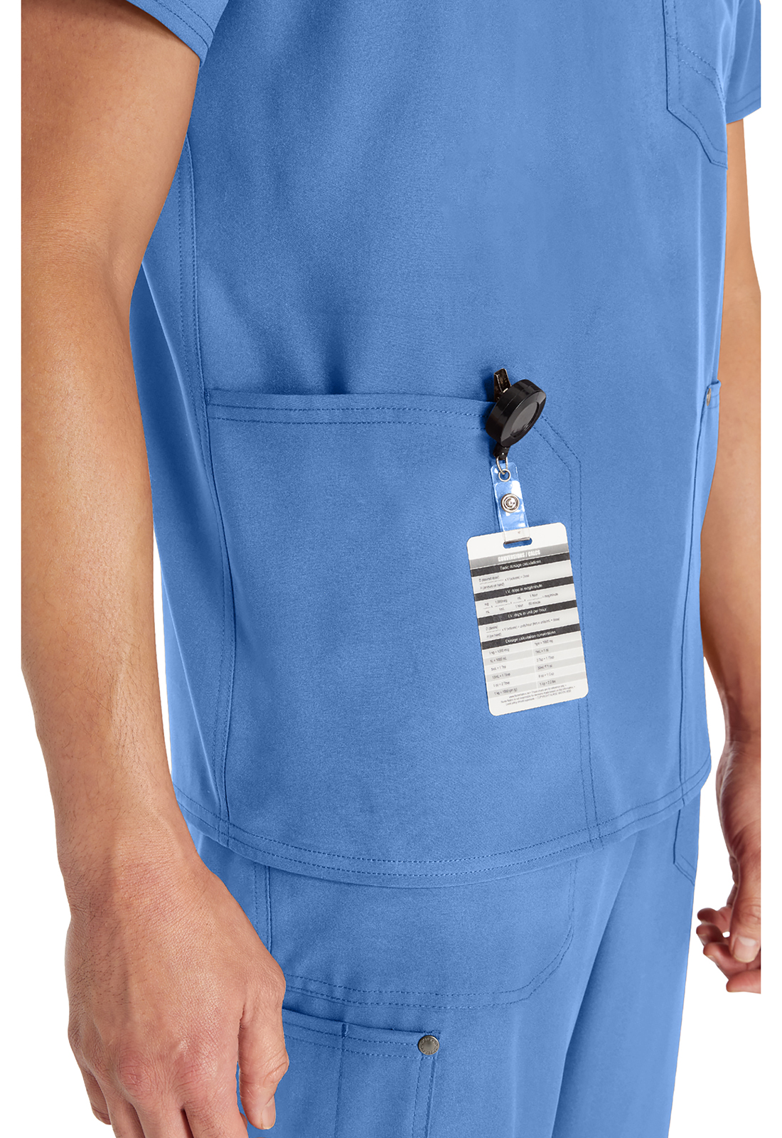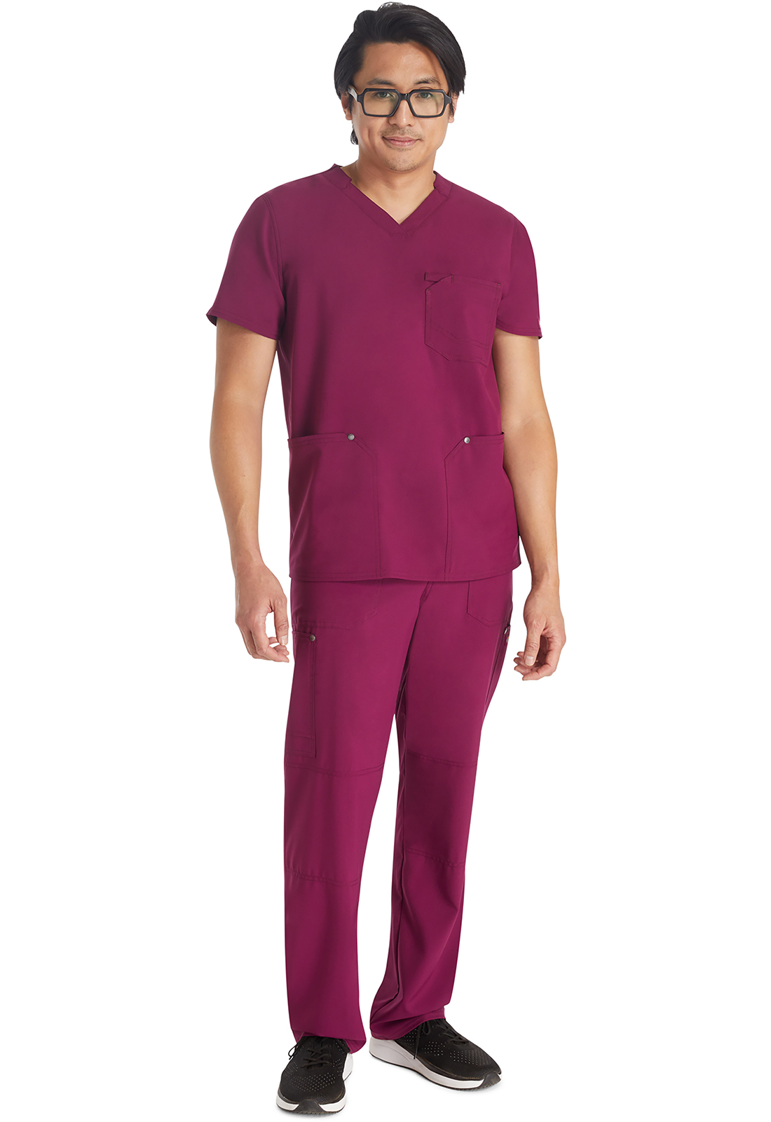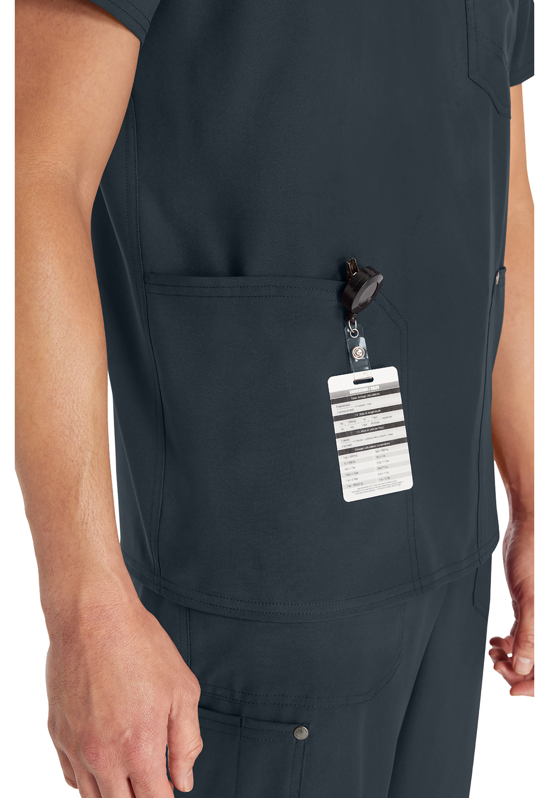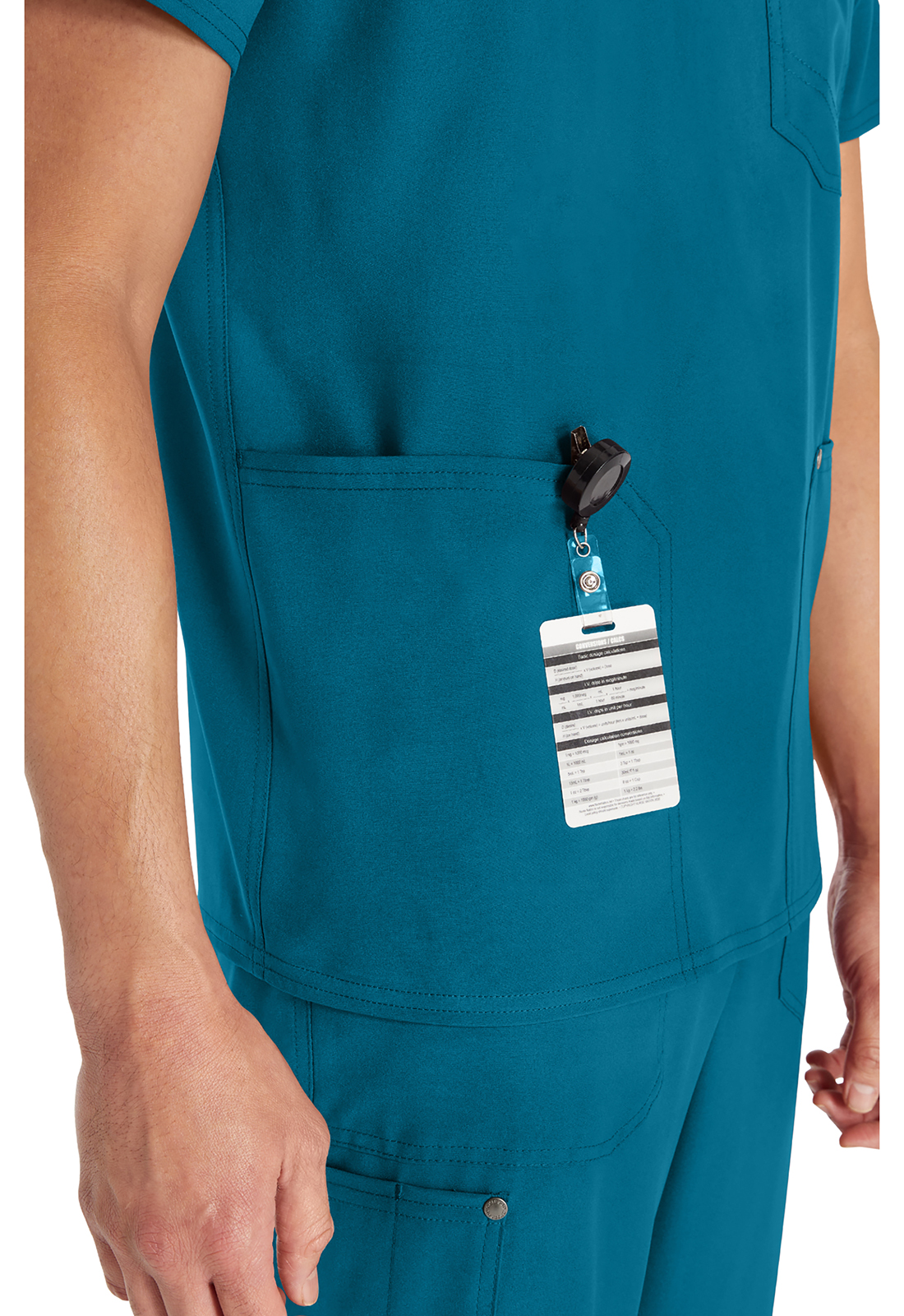 Мужской топ с V-образным вырезом имеет стилизованную двойную окантовку горловины и декоративную строчку на всех швах. Для хранения предусмотрены три кармана: один нагрудный накладной карман с петлей из той же ткани и два нижних накладных кармана с декоративными кнопками с логотипом в углах. Нагрудный карман имеет декоративную строчку для дополнительного стиля. Завершает дизайн задняя кокетка. Длина по центру спины: 72 см.