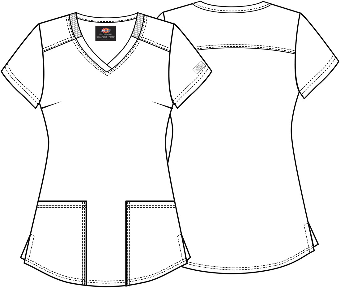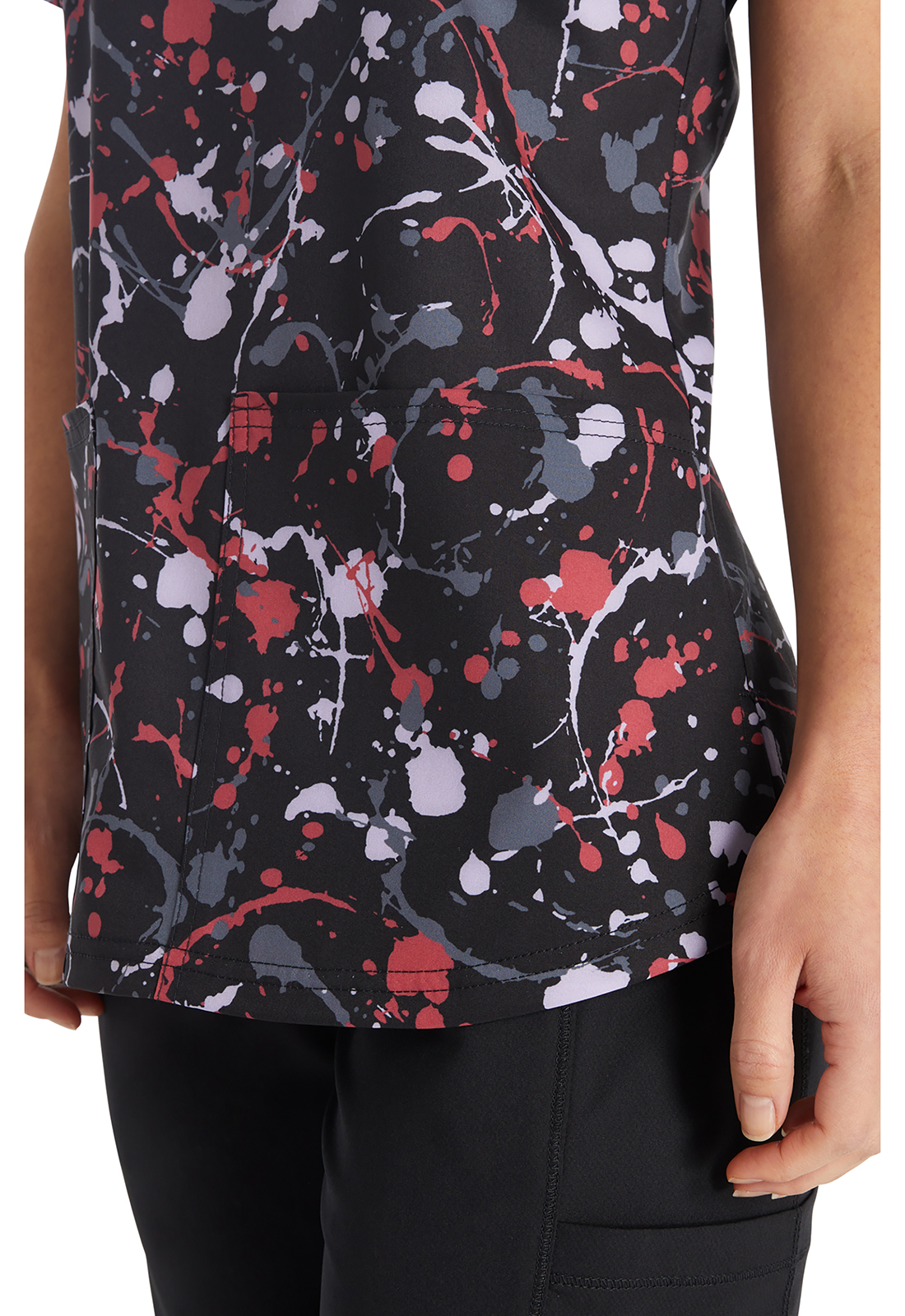 топ в современном стиле с v-образным вырезом и принтом имеет трикотажную резинку по линии шеи, вытачки на груди, а также передние и задние швы кокетки. Другие особенности включают два передних накладных кармана, боковые шлицы и подол рубашки. Длина по центру спины: 66 см.