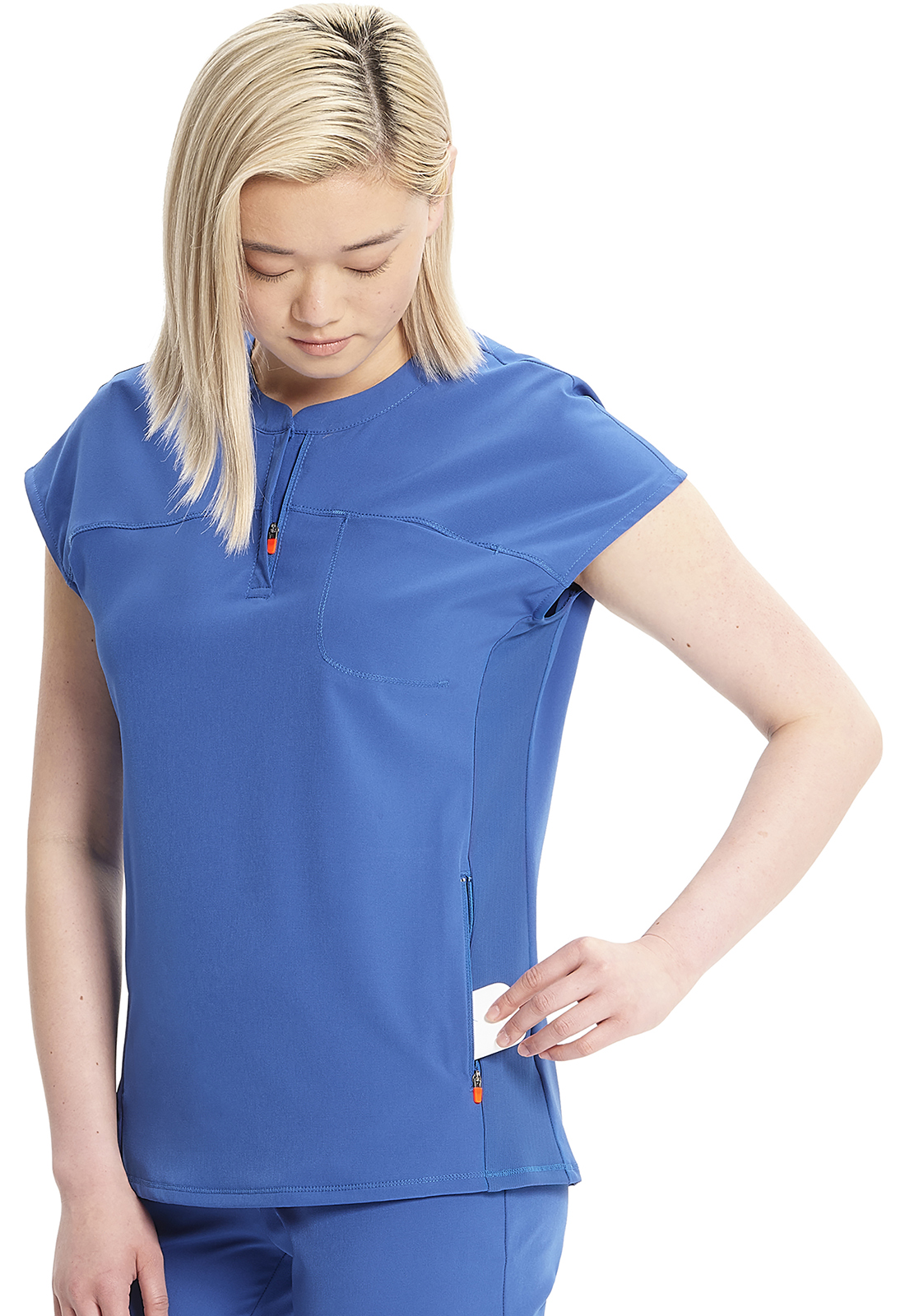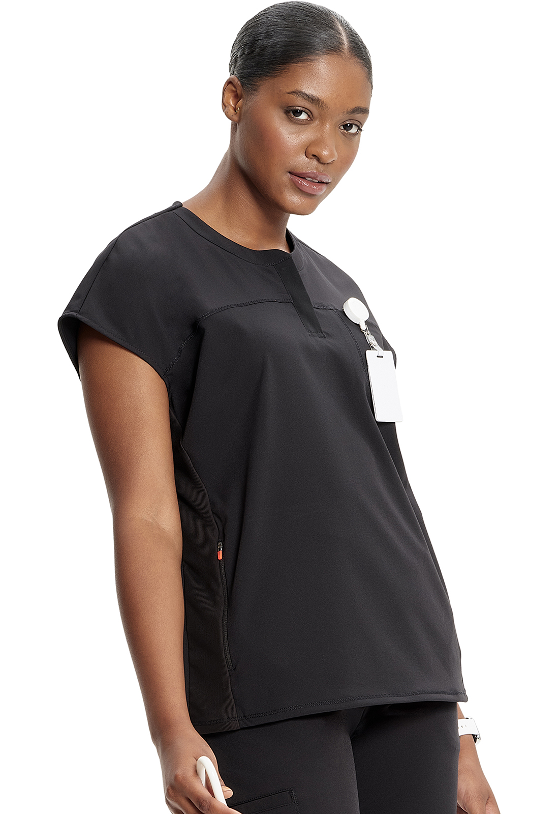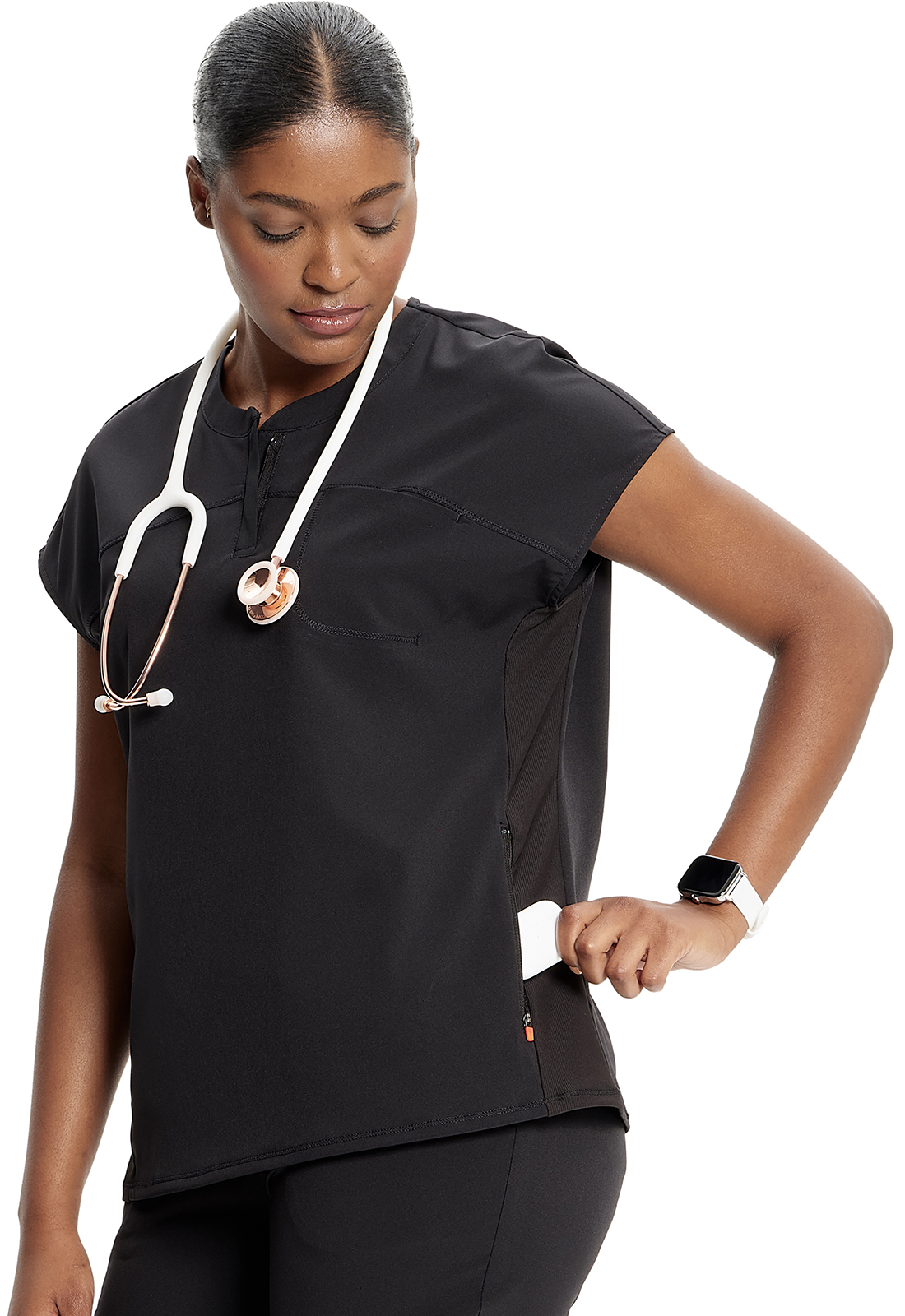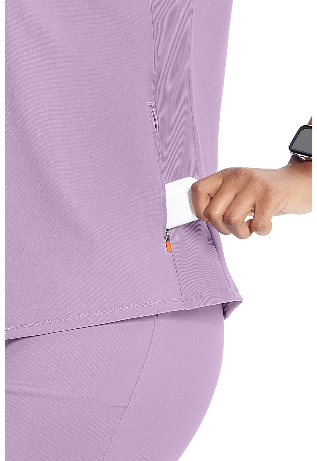 Обновленный топ современного кроя с круглым вырезом имеет закрытую центральную планку с потайной молнией. В наличии три кармана: один нагрудный карман на молнии в шве и два боковых кармана на молнии в шве с фирменными контрастными сетчатыми мешками. Другие особенности включают изогнутые кокеточные швы спереди и сзади, а также трикотажные боковые панели и центральную заднюю панель в тон для лучшей посадки и эластичности. Каплевидные рукава завершают образ. Длина по центру спинки: 65 см.