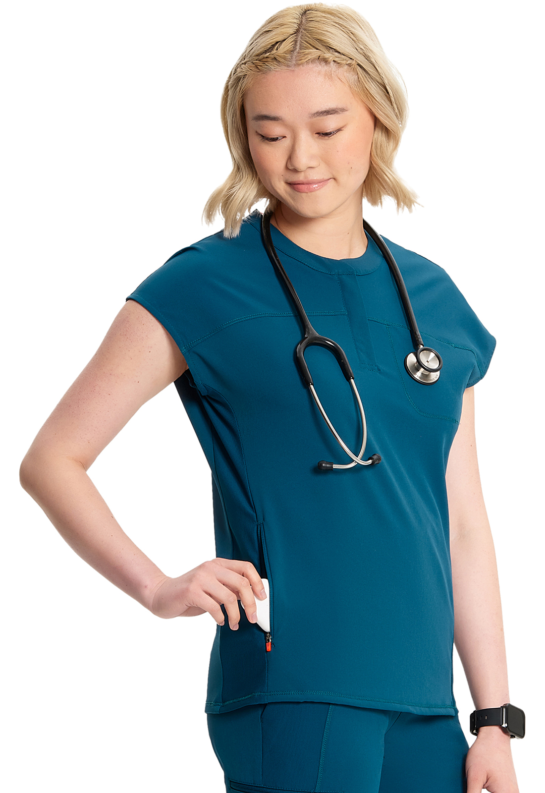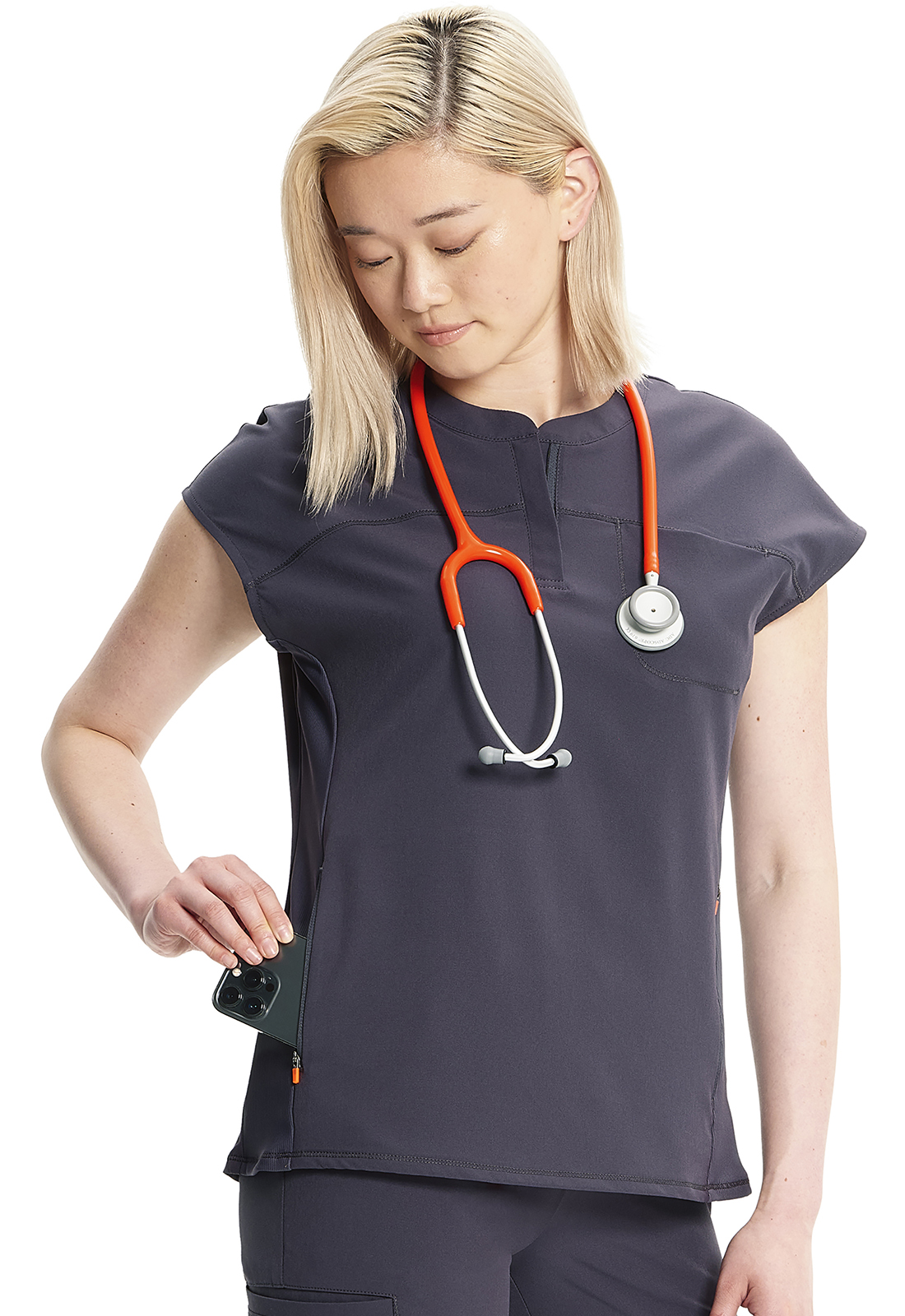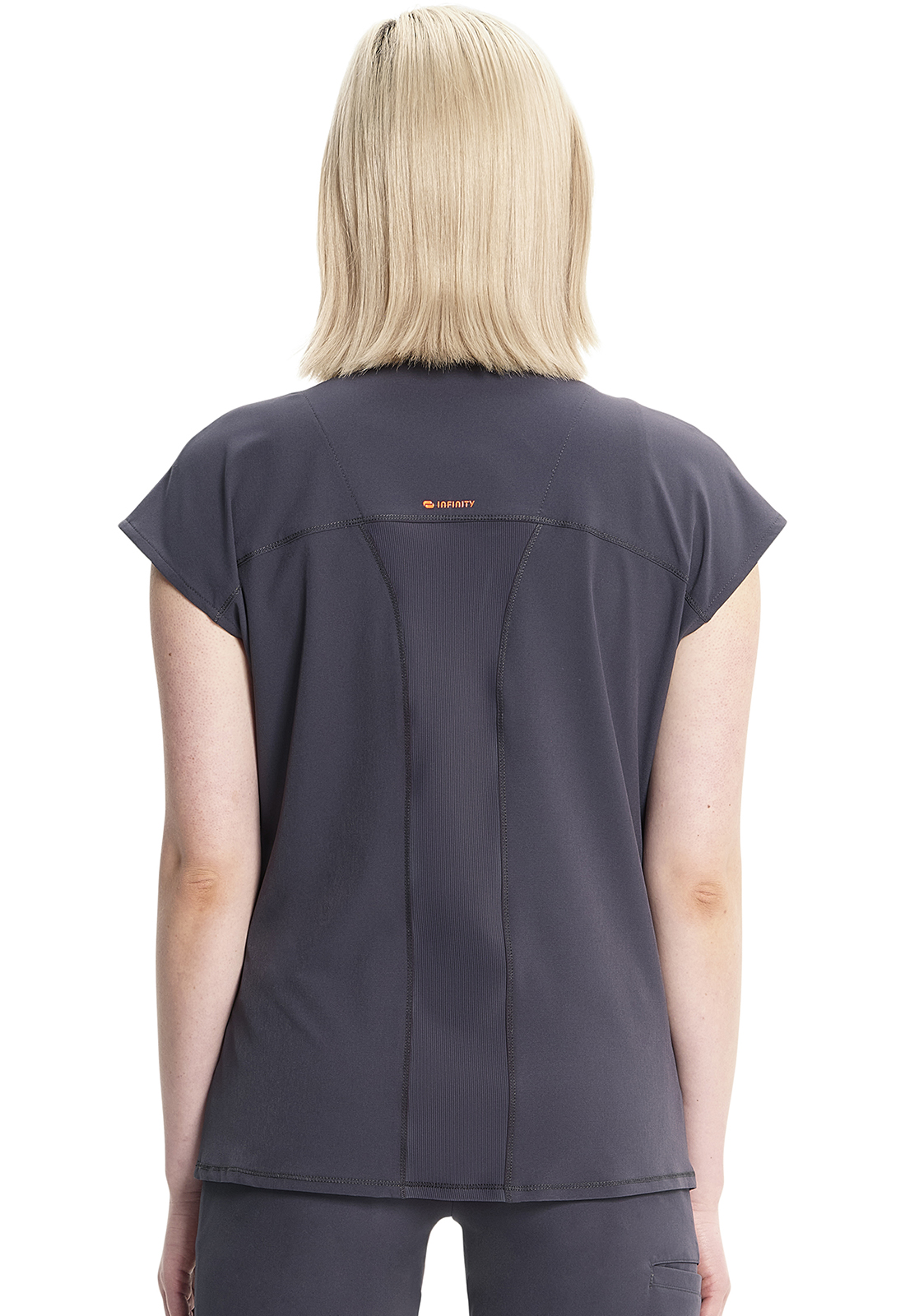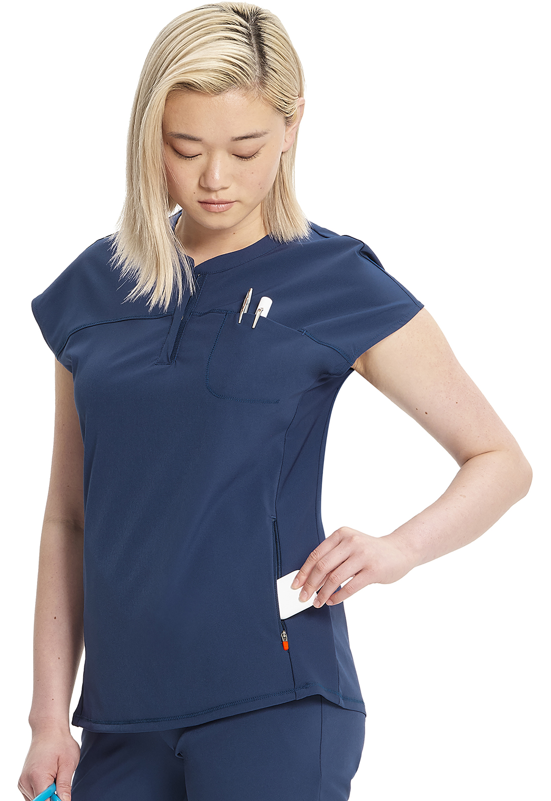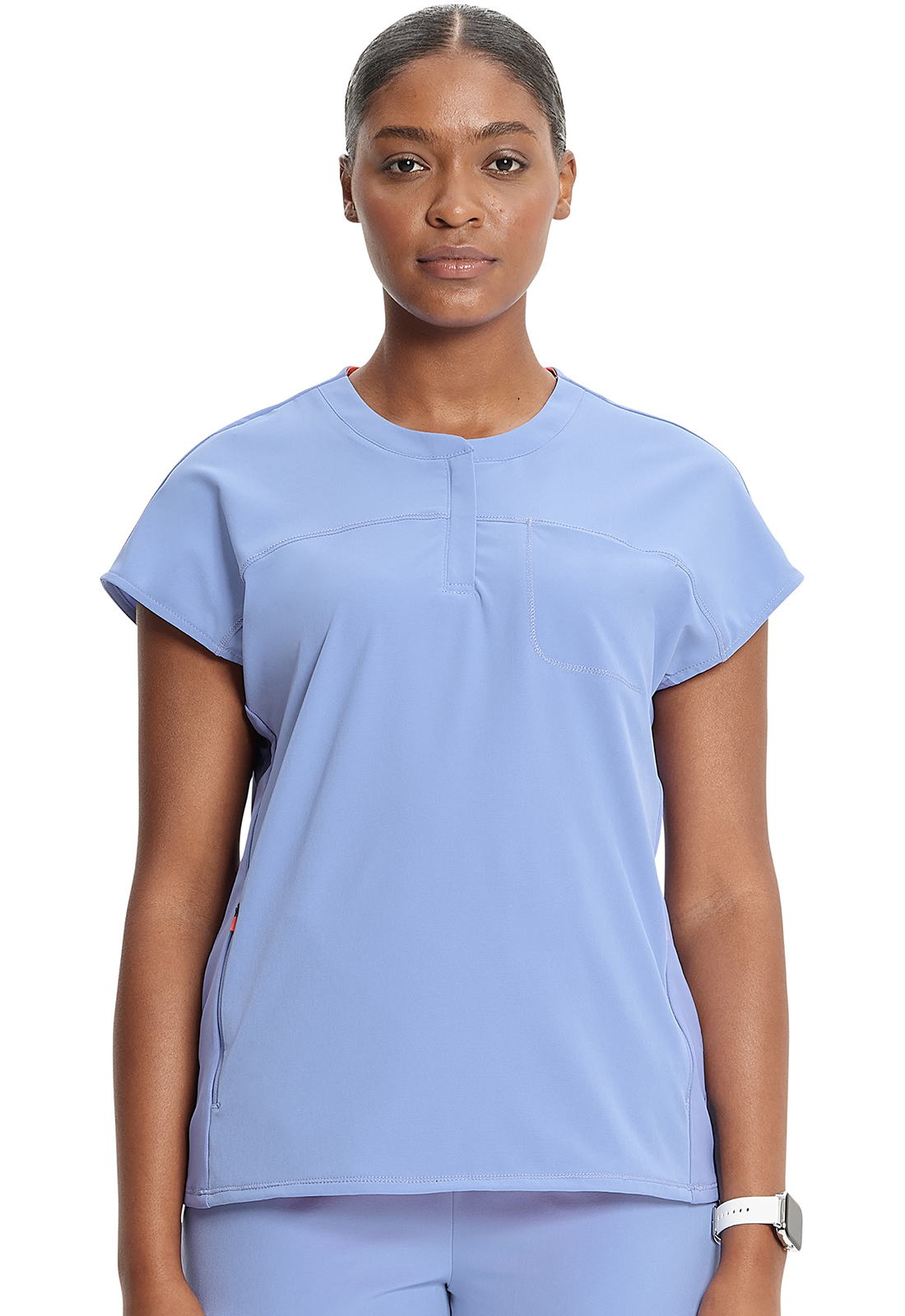 Обновленный топ современного кроя с круглым вырезом имеет закрытую центральную планку с потайной молнией. В наличии три кармана: один нагрудный карман на молнии в шве и два боковых кармана на молнии в шве с фирменными контрастными сетчатыми мешками. Другие особенности включают изогнутые кокеточные швы спереди и сзади, а также трикотажные боковые панели и центральную заднюю панель в тон для лучшей посадки и эластичности. Каплевидные рукава завершают образ. Длина по центру спинки: 65 см.