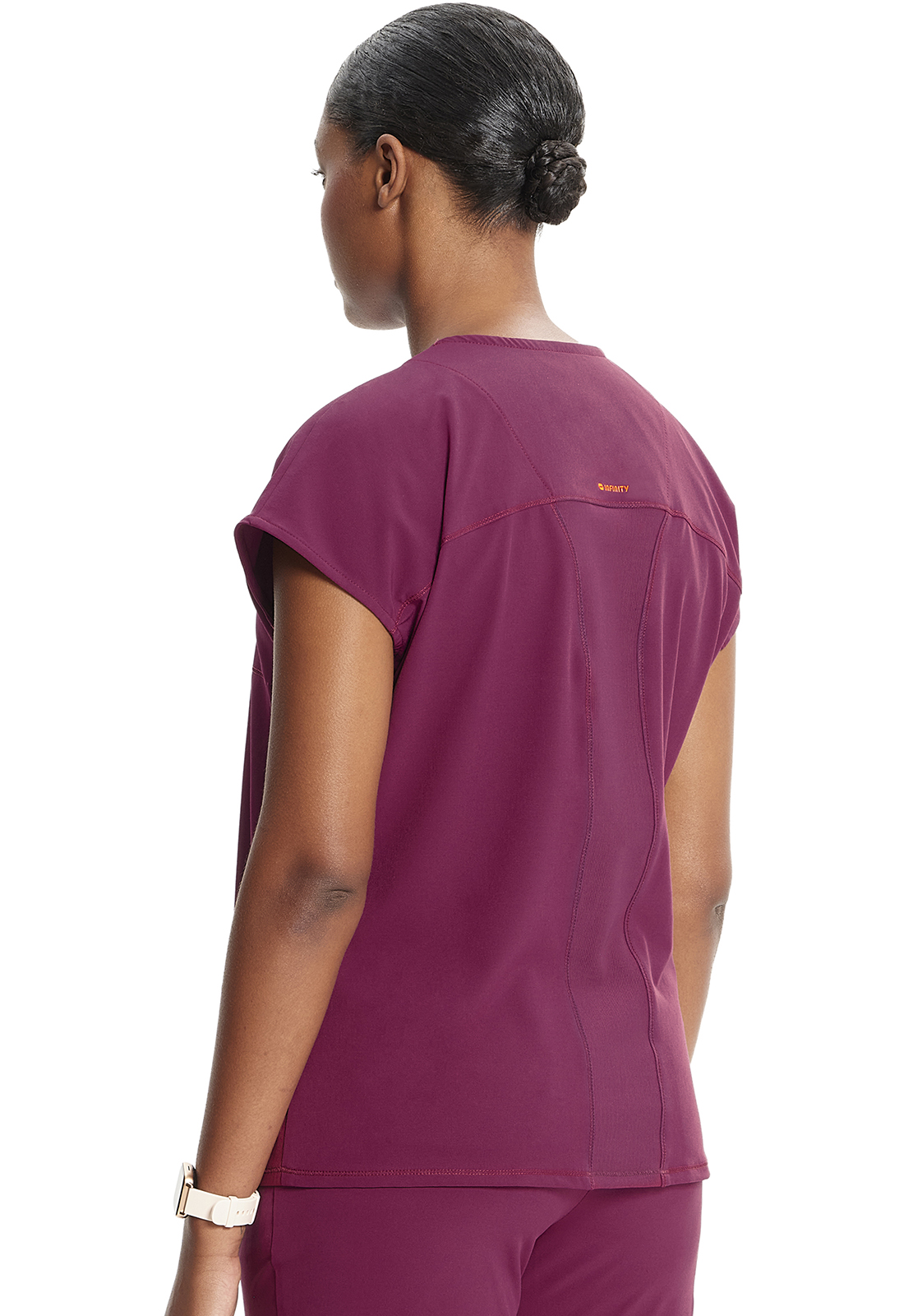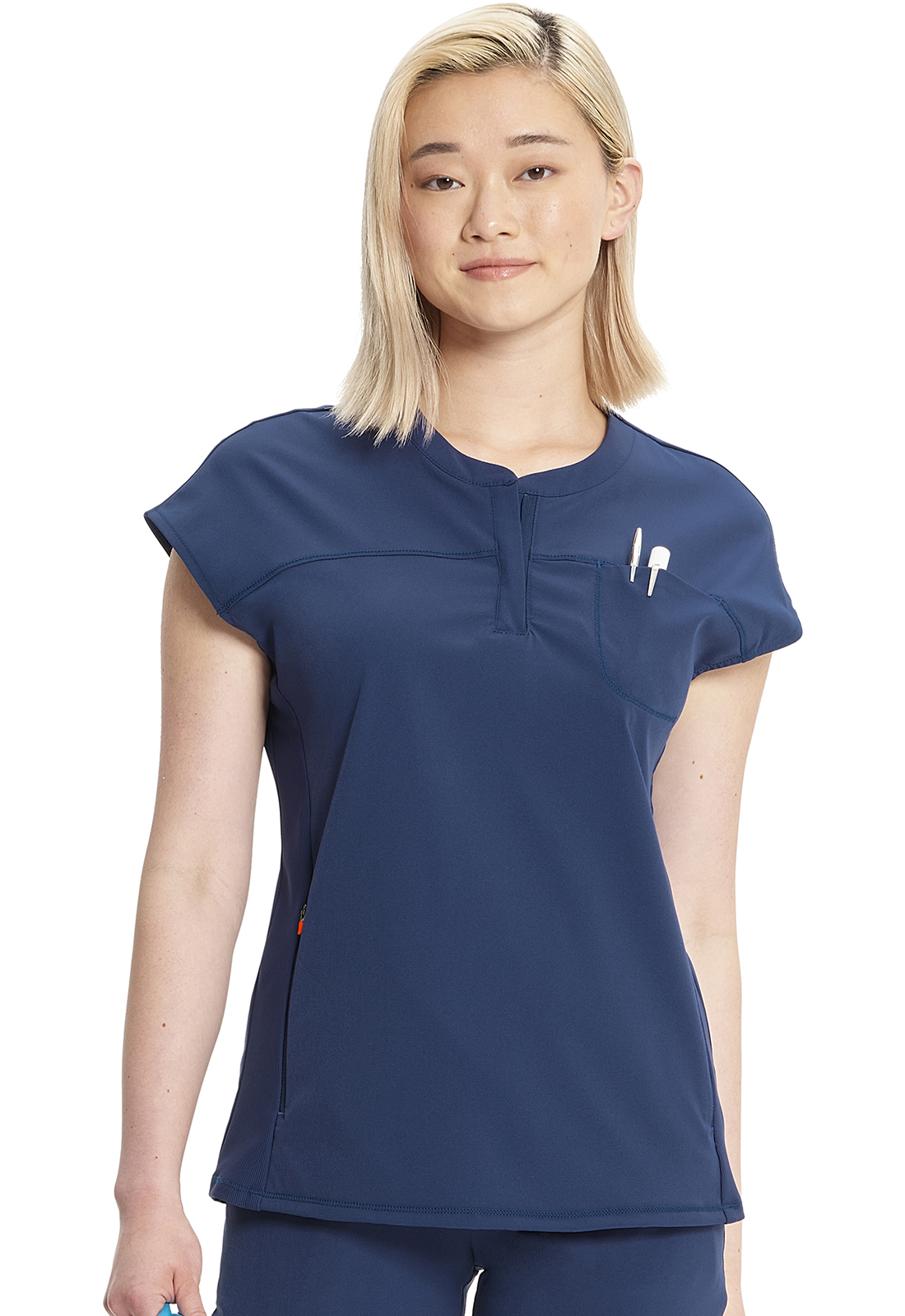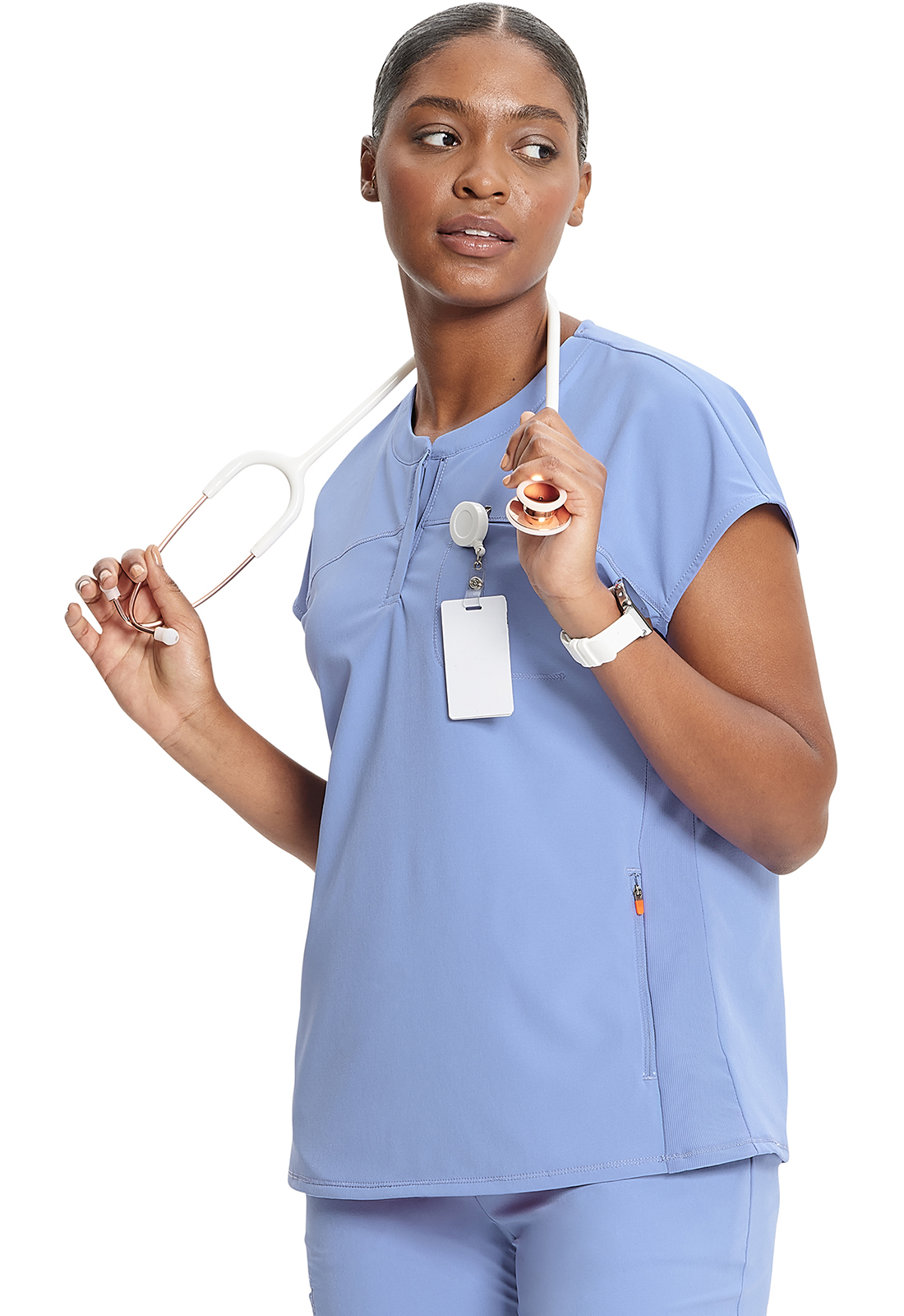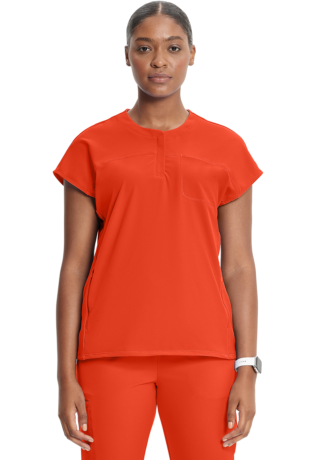 Обновленный топ современного кроя с круглым вырезом имеет закрытую центральную планку с потайной молнией. В наличии три кармана: один нагрудный карман на молнии в шве и два боковых кармана на молнии в шве с фирменными контрастными сетчатыми мешками. Другие особенности включают изогнутые кокеточные швы спереди и сзади, а также трикотажные боковые панели и центральную заднюю панель в тон для лучшей посадки и эластичности. Каплевидные рукава завершают образ. Длина по центру спинки: 65 см.