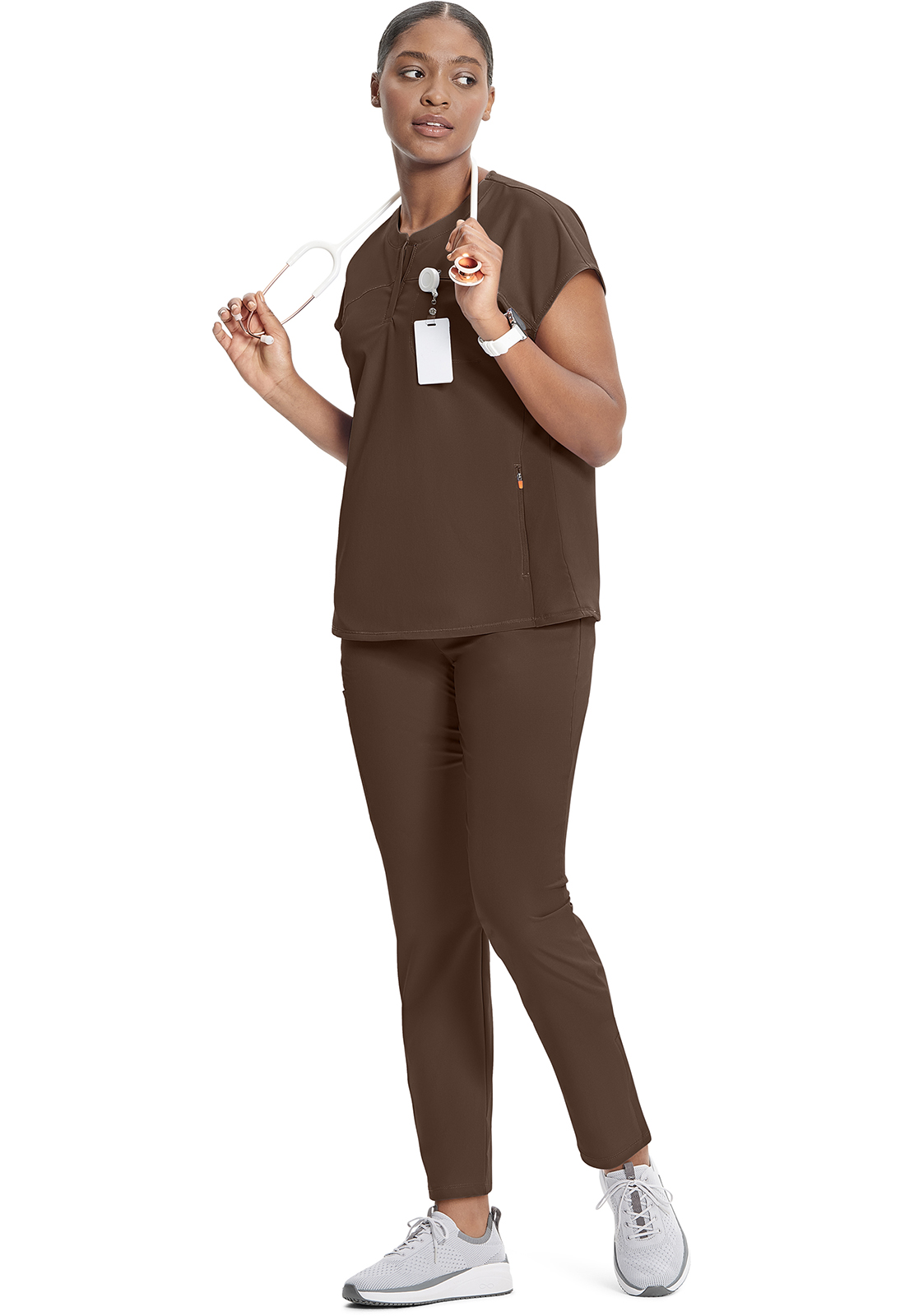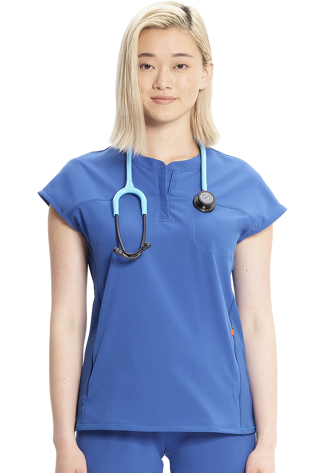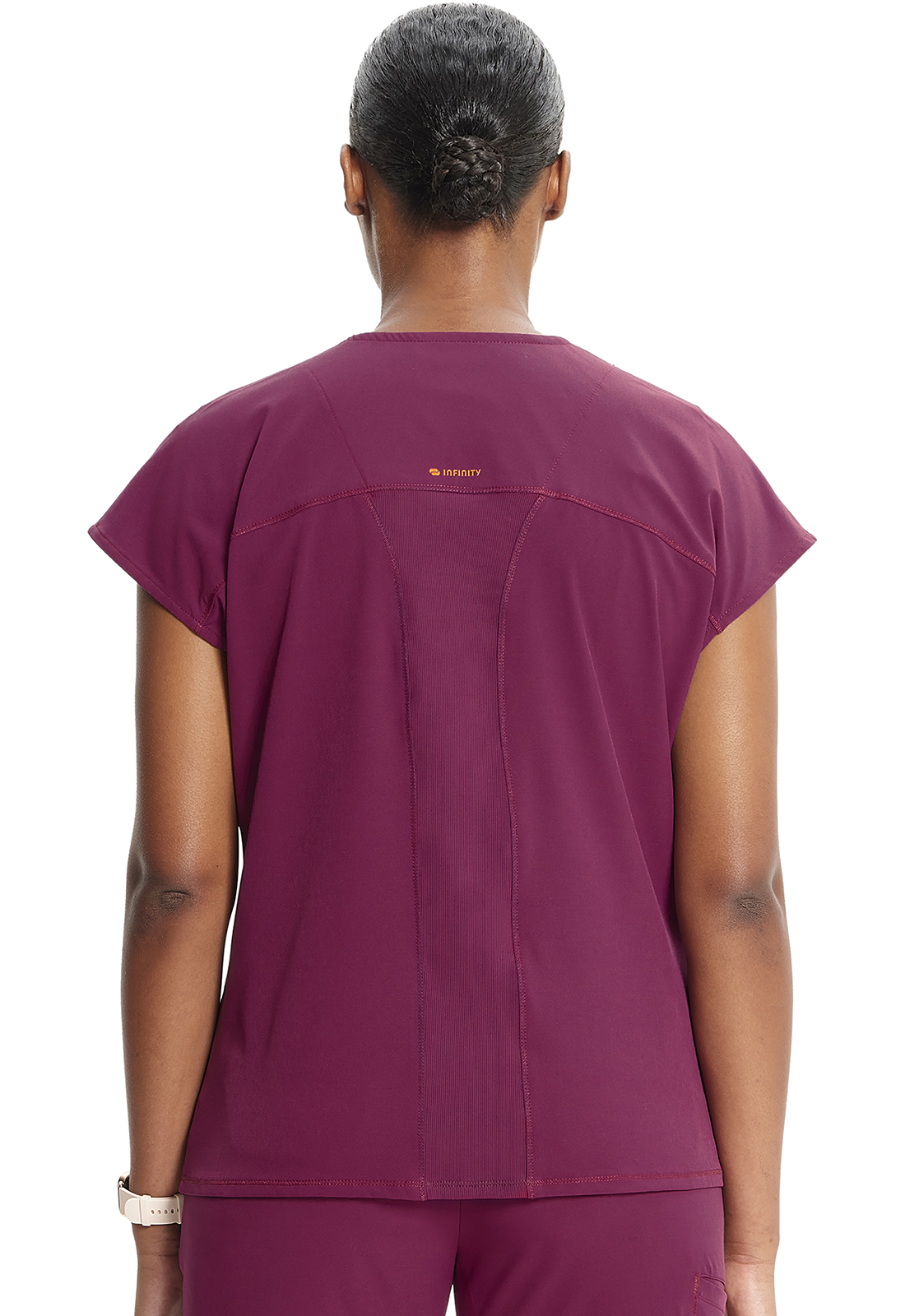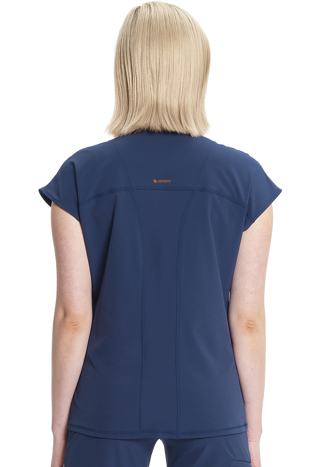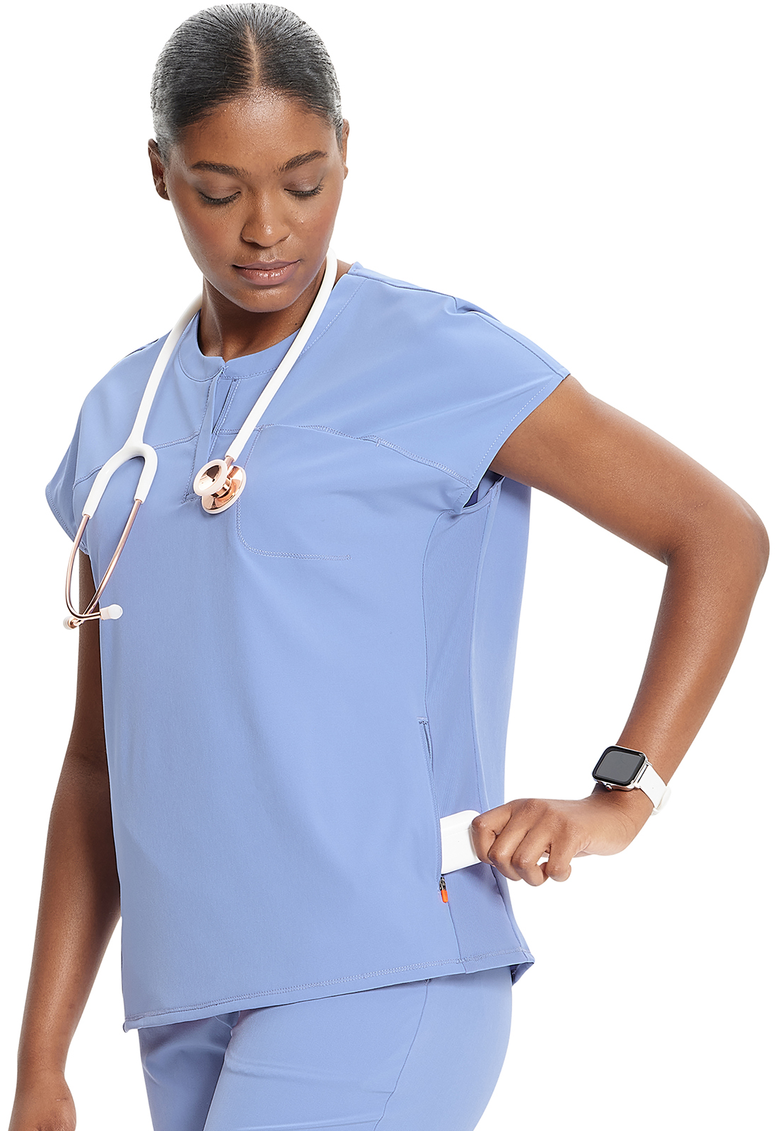 Обновленный топ современного кроя с круглым вырезом имеет закрытую центральную планку с потайной молнией. В наличии три кармана: один нагрудный карман на молнии в шве и два боковых кармана на молнии в шве с фирменными контрастными сетчатыми мешками. Другие особенности включают изогнутые кокеточные швы спереди и сзади, а также трикотажные боковые панели и центральную заднюю панель в тон для лучшей посадки и эластичности. Каплевидные рукава завершают образ. Длина по центру спинки: 65 см.