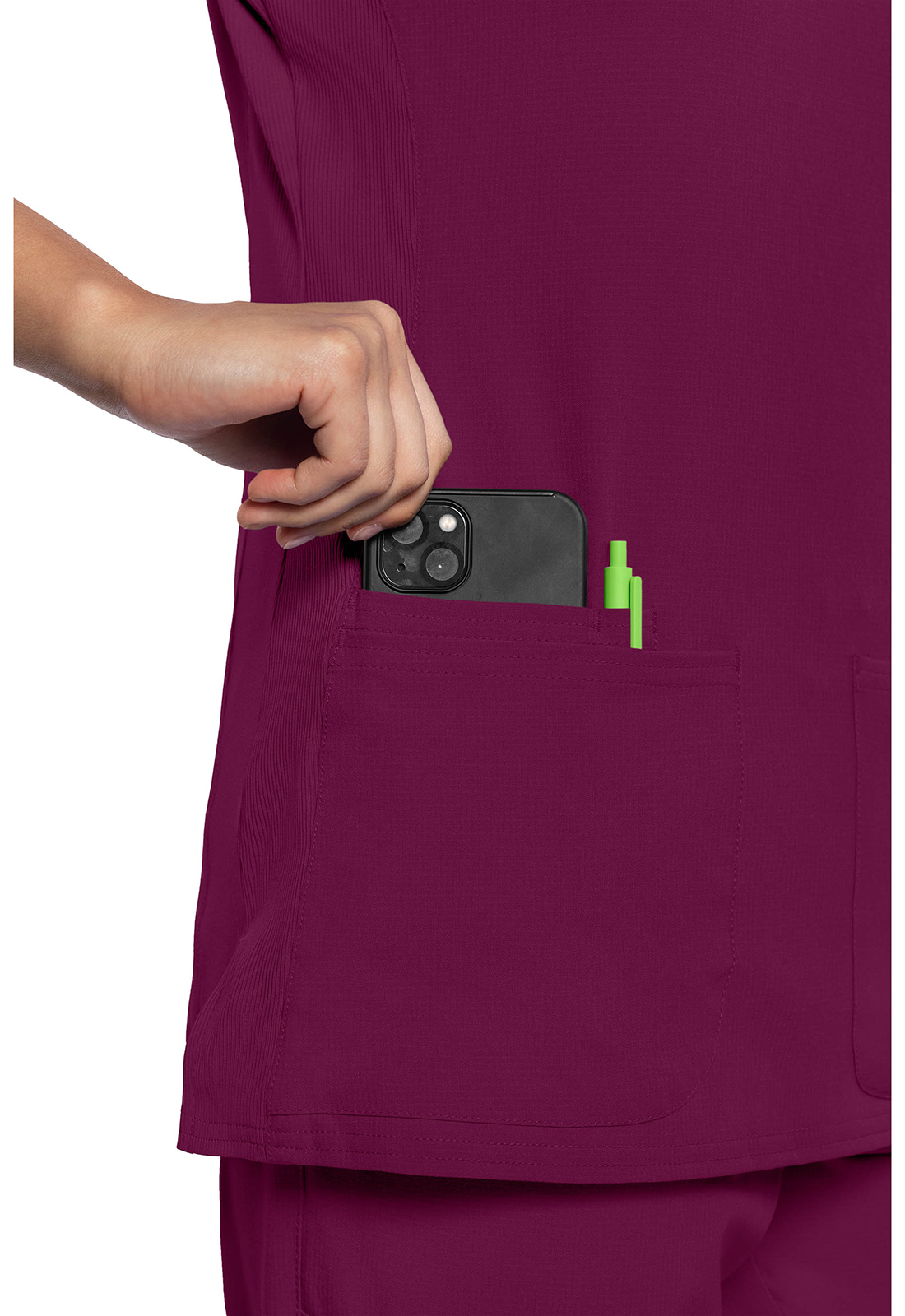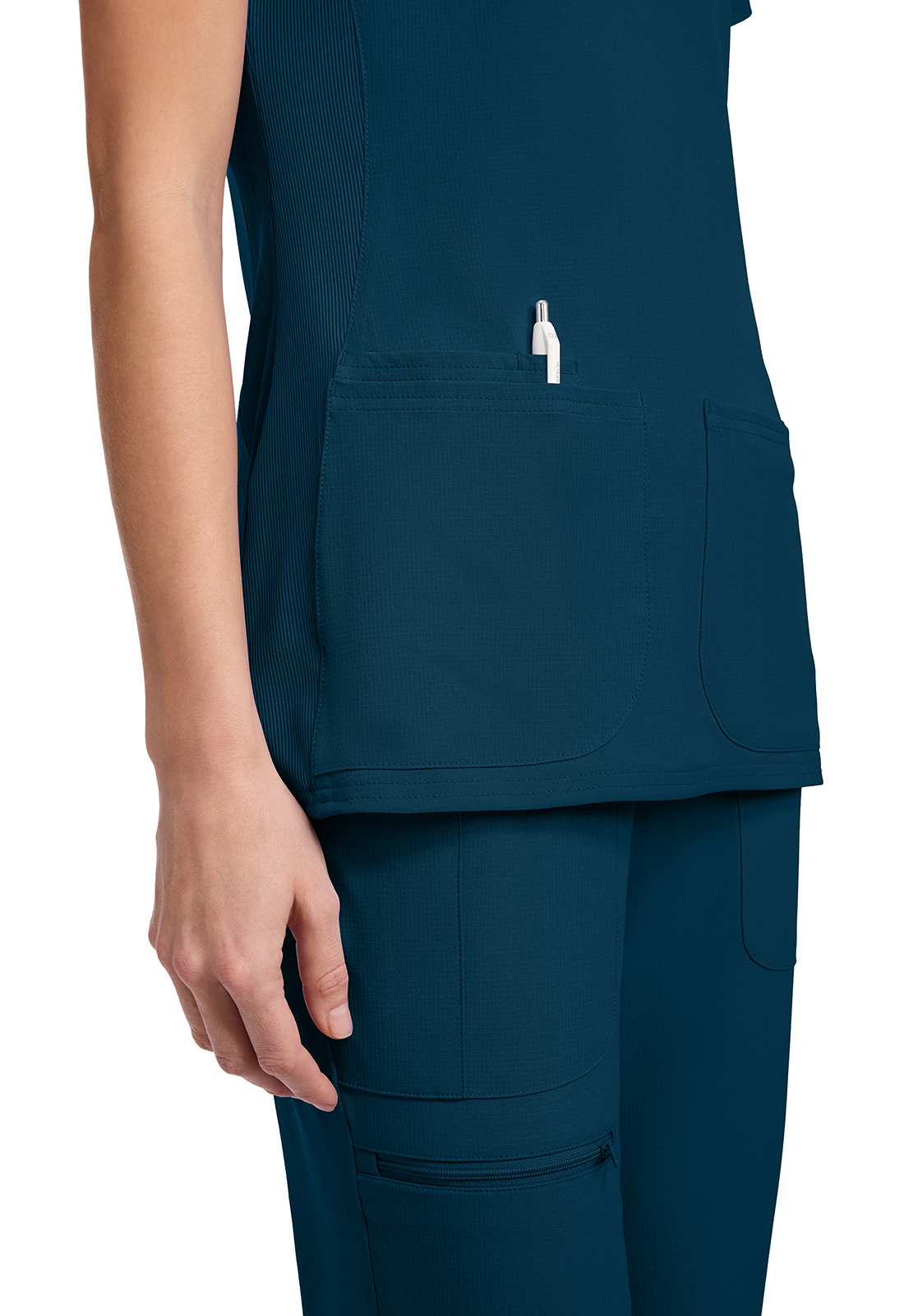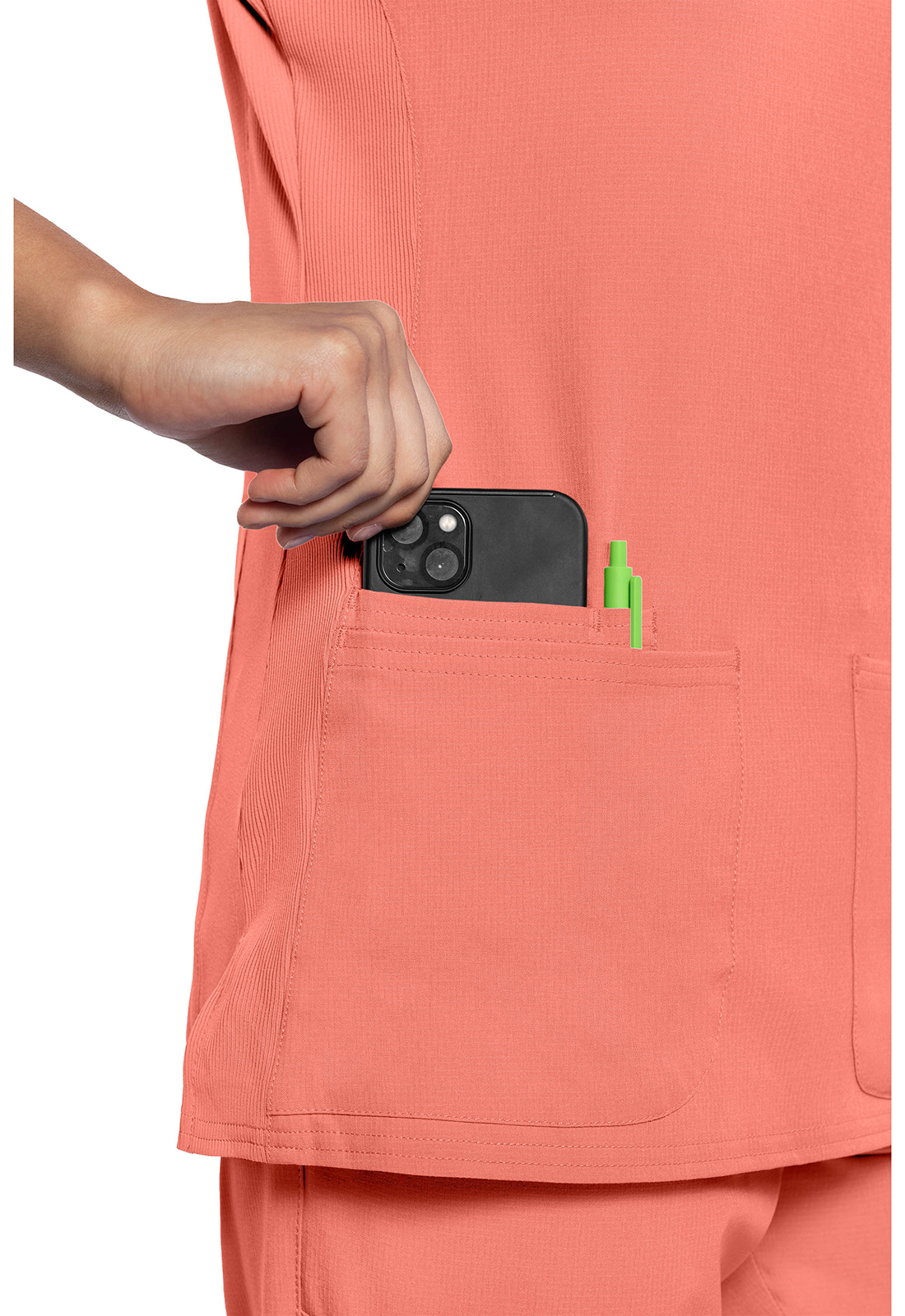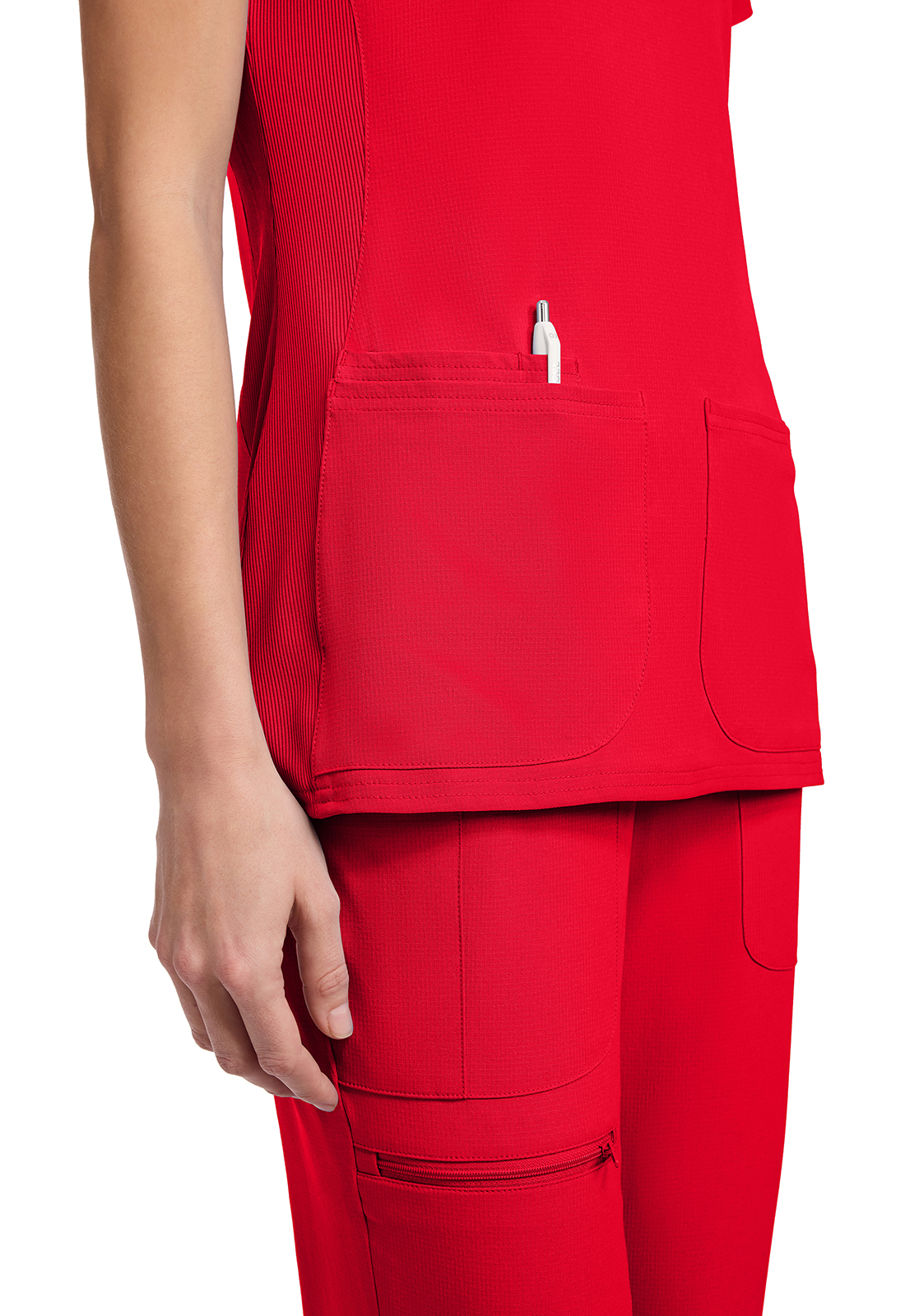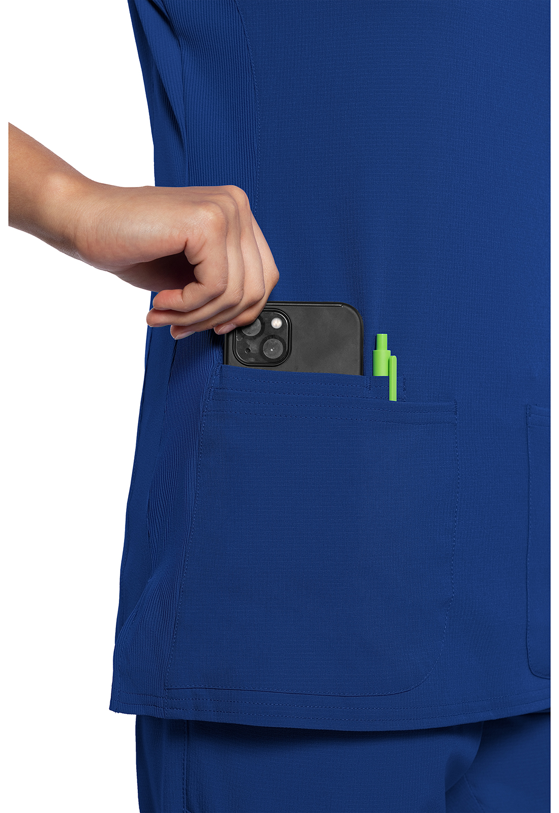 Женский топ с v-образным вырезом имеет фигурный вырез и петлю для бейджа на левой стороне носителя. Имеется три кармана для хранения: два накладных кармана и дополнительный карман для мобильного телефона с усиленным слотом для ручки. Внутри правого кармана носителя есть петли для инструментов из саржевой ленты для дополнительного хранения. Принцесские швы спереди и сзади придают форму и облегание, а боковые панели из трикотажа в тон обеспечивают комфорт и эластичность. Закругленный подол и боковые разрезы завершают образ. Длина по центру спинки: 65 см.