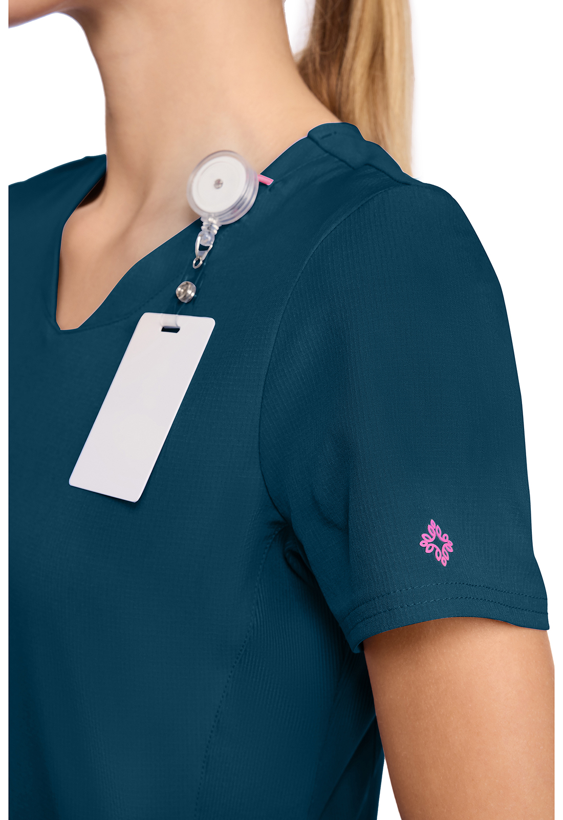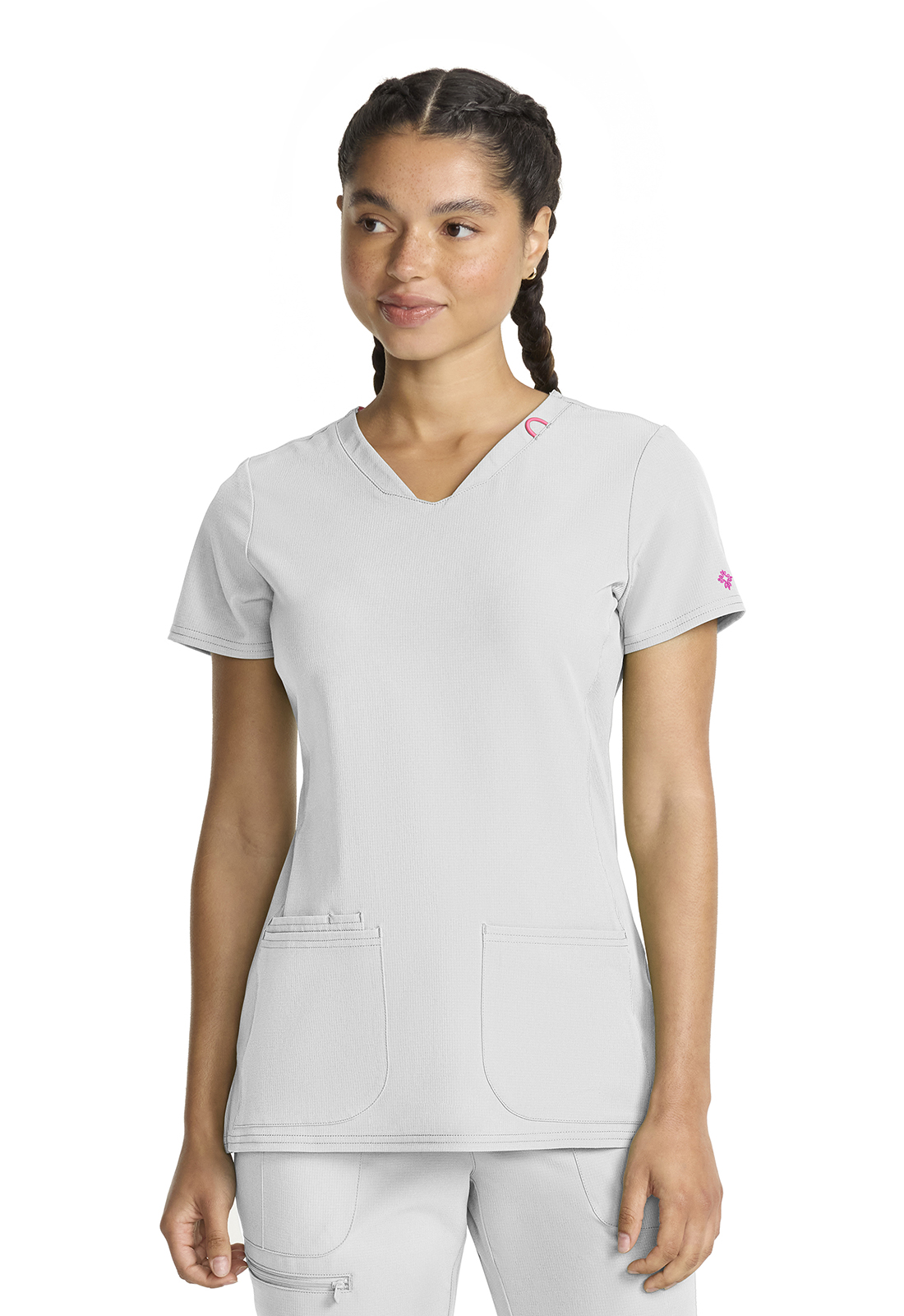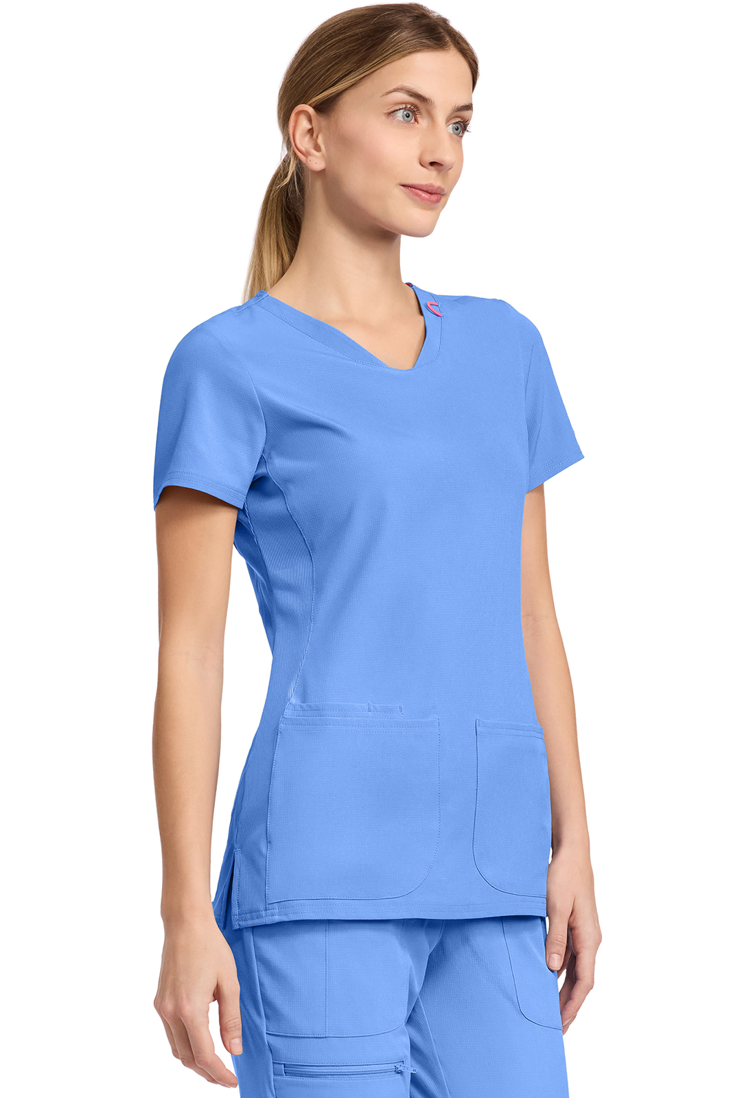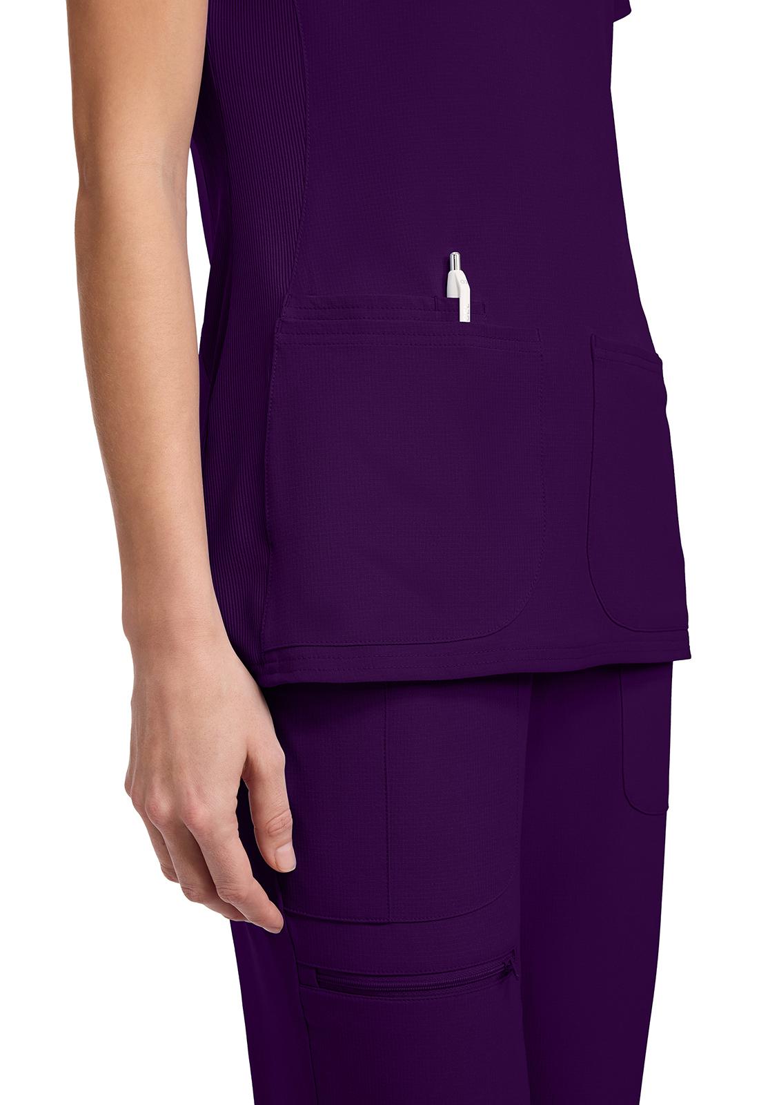 Женский топ с v-образным вырезом имеет фигурный вырез и петлю для бейджа на левой стороне носителя. Имеется три кармана для хранения: два накладных кармана и дополнительный карман для мобильного телефона с усиленным слотом для ручки. Внутри правого кармана носителя есть петли для инструментов из саржевой ленты для дополнительного хранения. Принцесские швы спереди и сзади придают форму и облегание, а боковые панели из трикотажа в тон обеспечивают комфорт и эластичность. Закругленный подол и боковые разрезы завершают образ. Длина по центру спинки: 65 см.