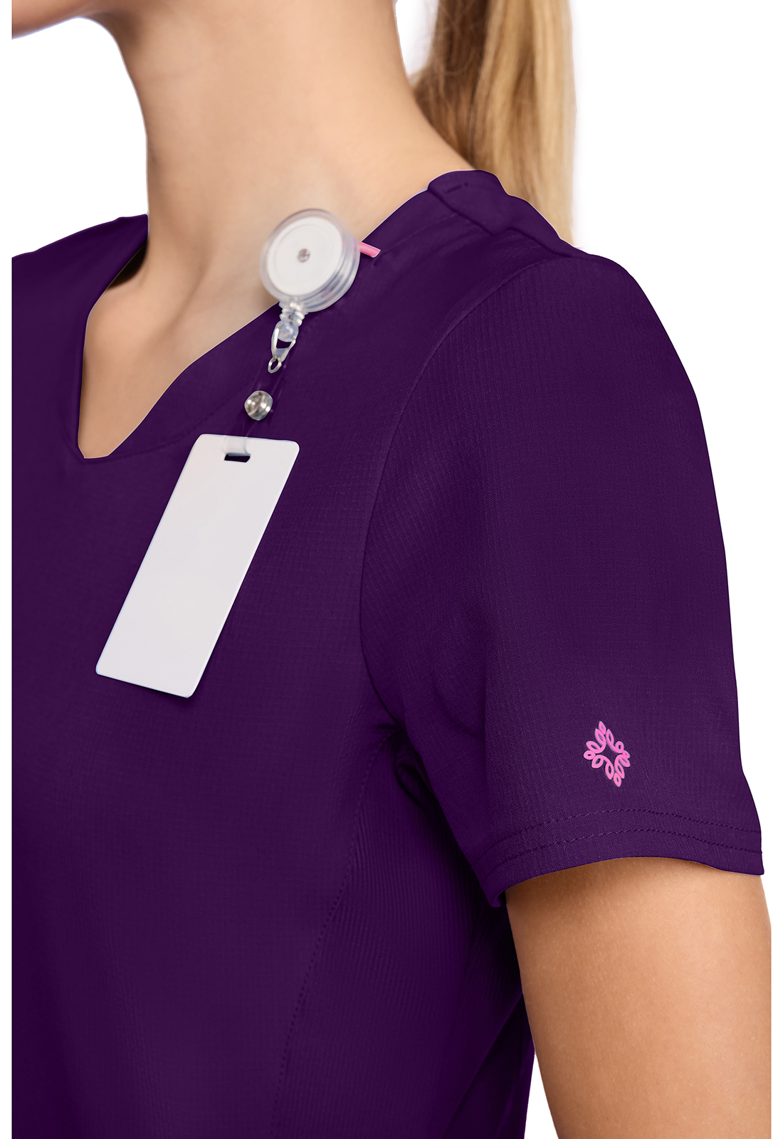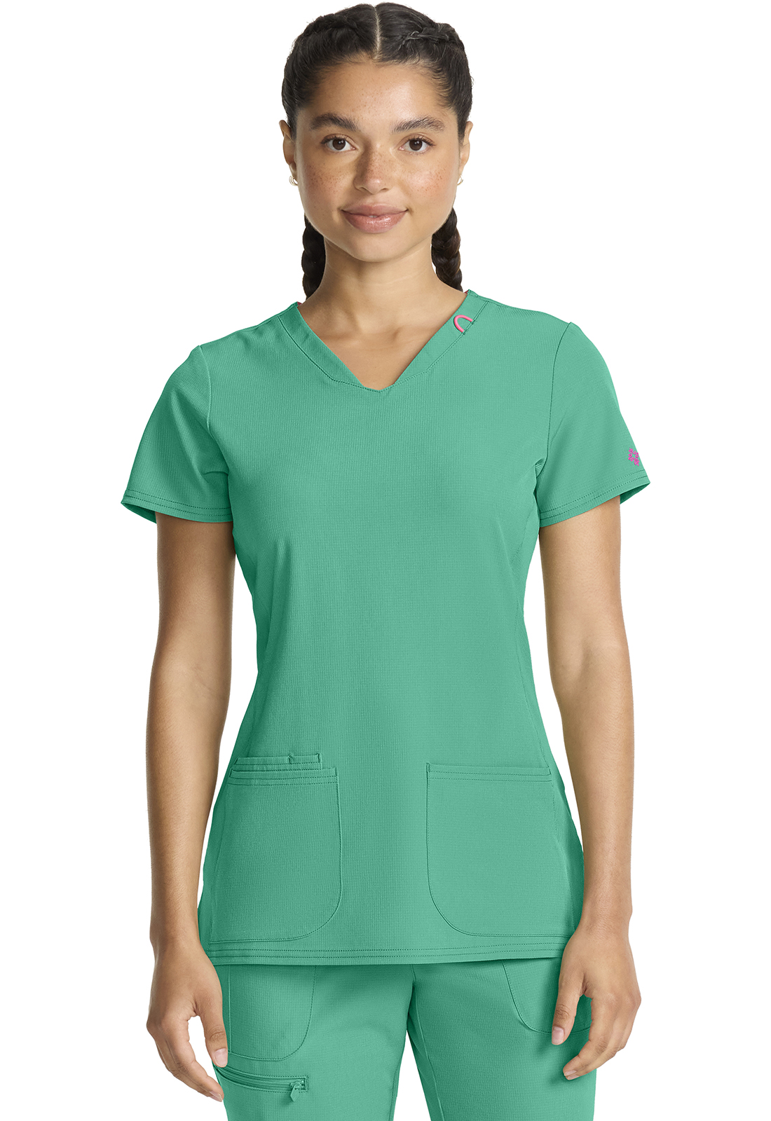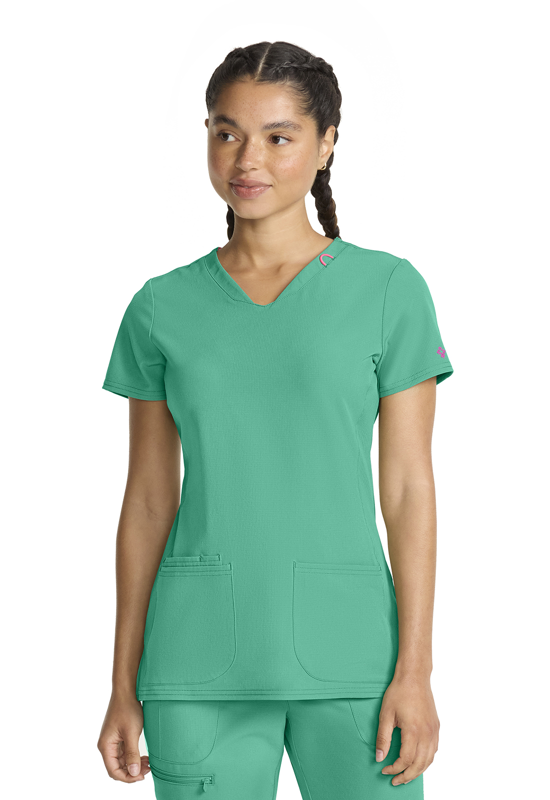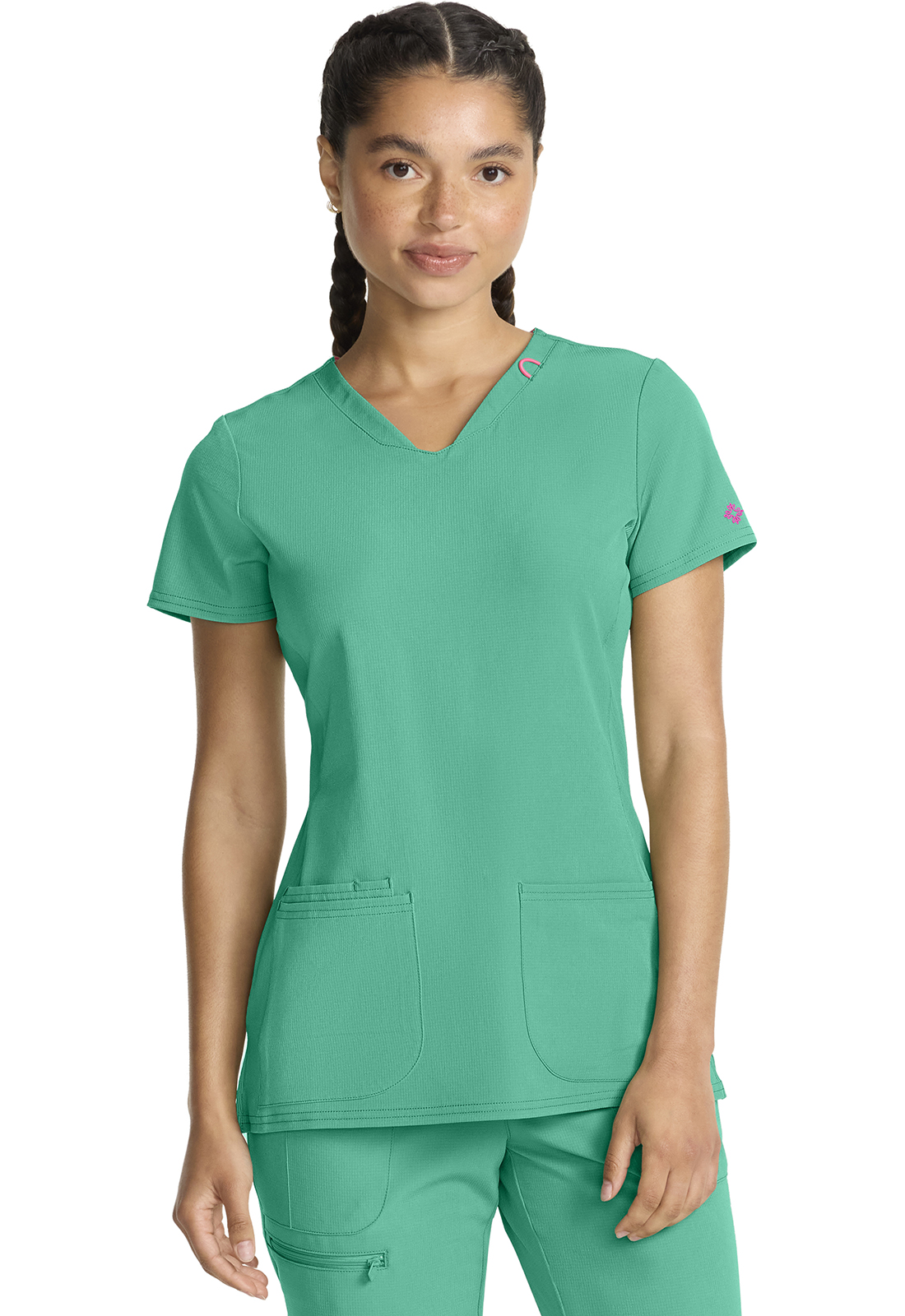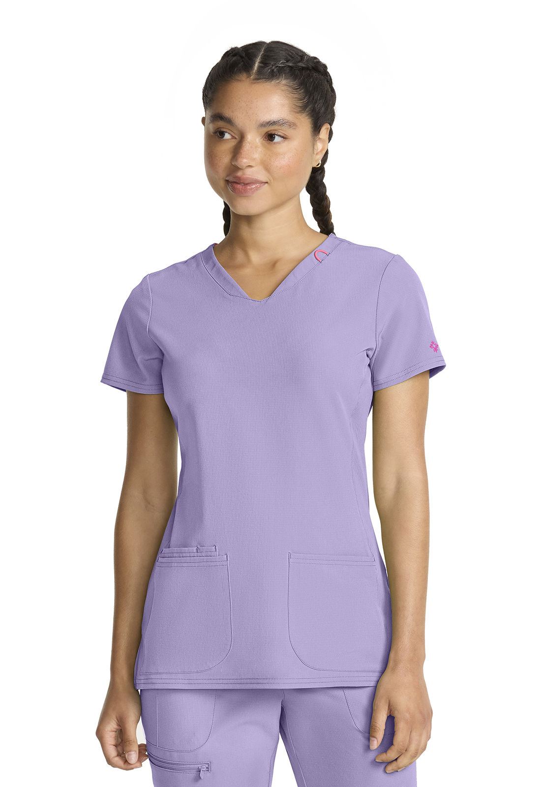 Женский топ с v-образным вырезом имеет фигурный вырез и петлю для бейджа на левой стороне носителя. Имеется три кармана для хранения: два накладных кармана и дополнительный карман для мобильного телефона с усиленным слотом для ручки. Внутри правого кармана носителя есть петли для инструментов из саржевой ленты для дополнительного хранения. Принцесские швы спереди и сзади придают форму и облегание, а боковые панели из трикотажа в тон обеспечивают комфорт и эластичность. Закругленный подол и боковые разрезы завершают образ. Длина по центру спинки: 65 см.