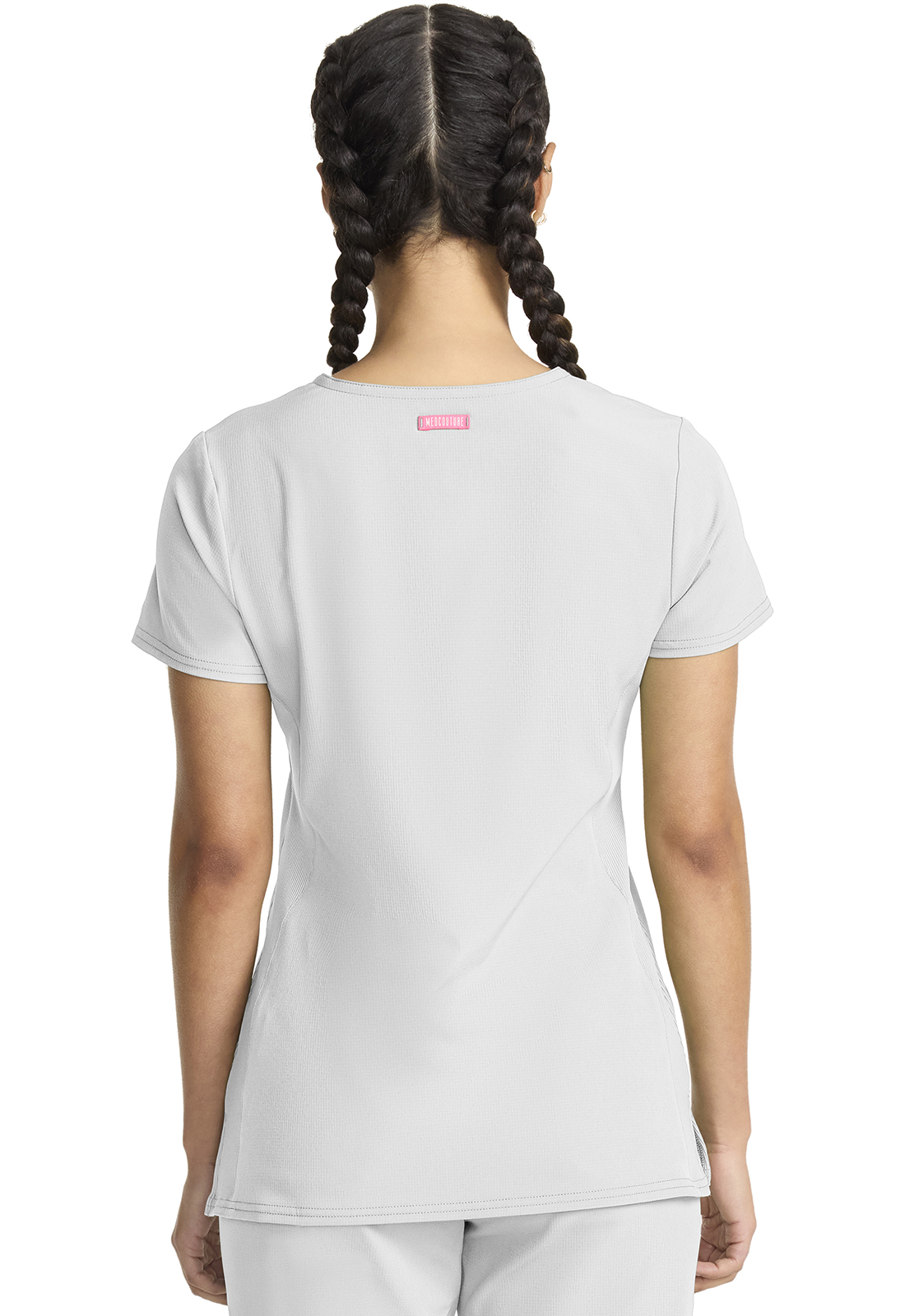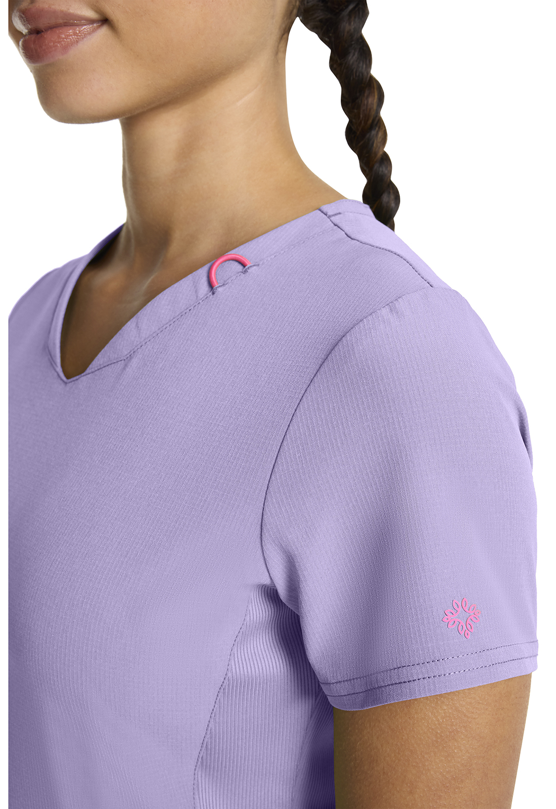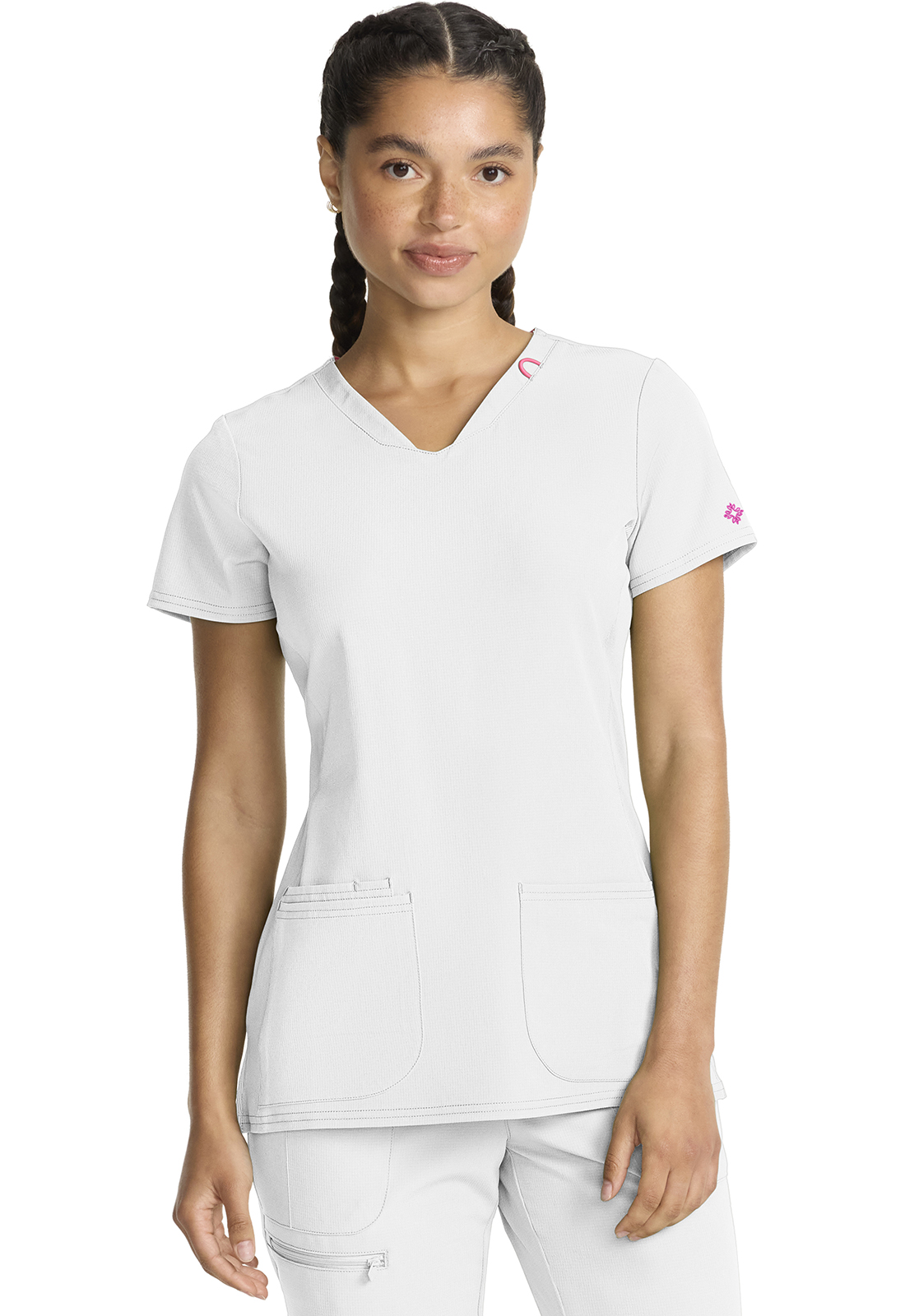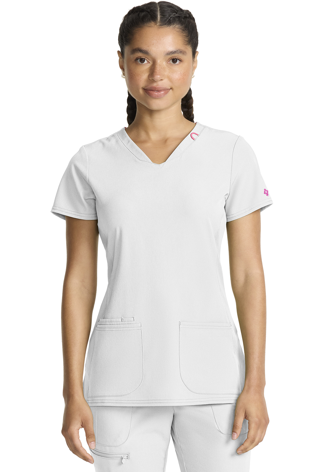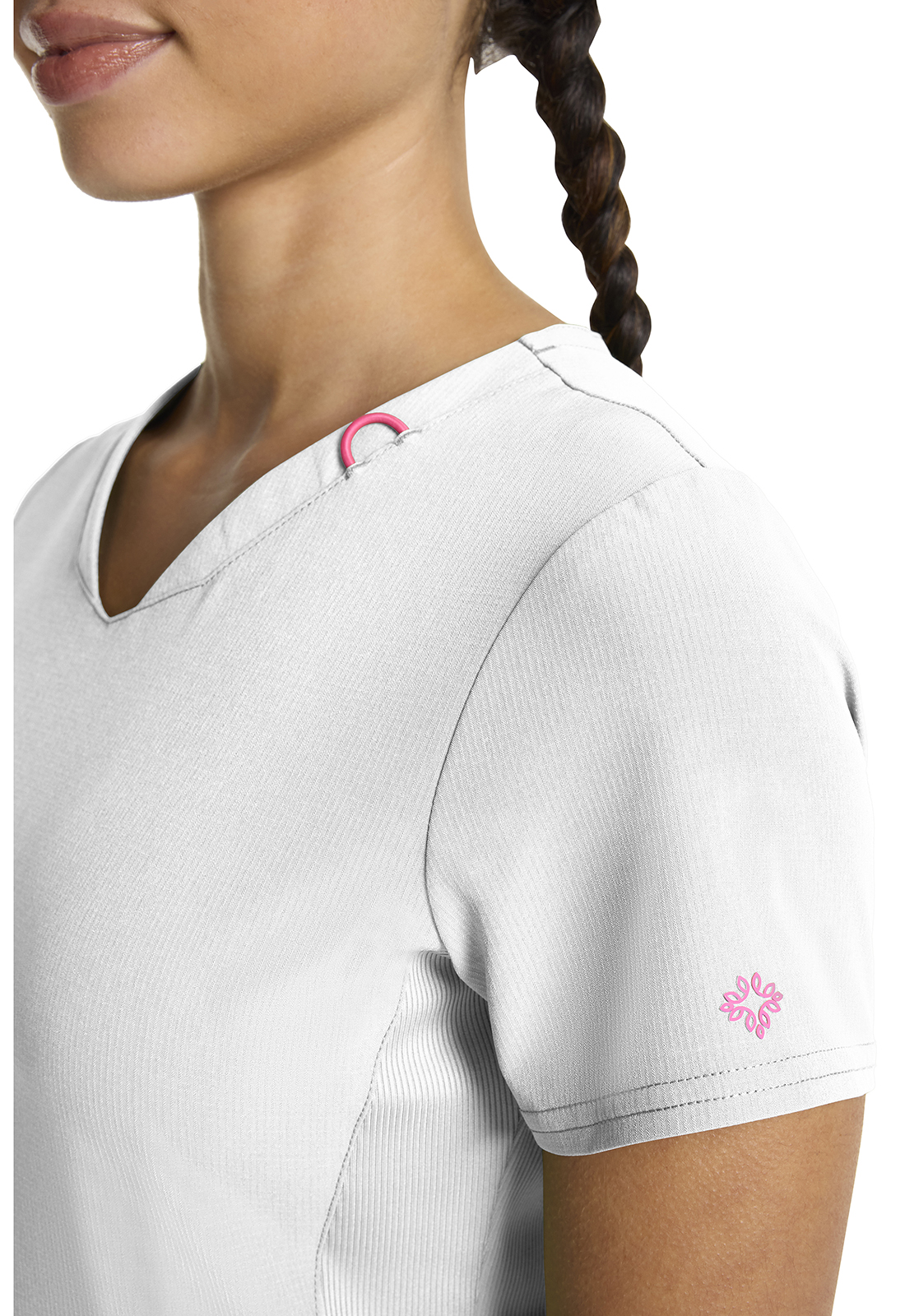 Женский топ с v-образным вырезом имеет фигурный вырез и петлю для бейджа на левой стороне носителя. Имеется три кармана для хранения: два накладных кармана и дополнительный карман для мобильного телефона с усиленным слотом для ручки. Внутри правого кармана носителя есть петли для инструментов из саржевой ленты для дополнительного хранения. Принцесские швы спереди и сзади придают форму и облегание, а боковые панели из трикотажа в тон обеспечивают комфорт и эластичность. Закругленный подол и боковые разрезы завершают образ. Длина по центру спинки: 65 см.